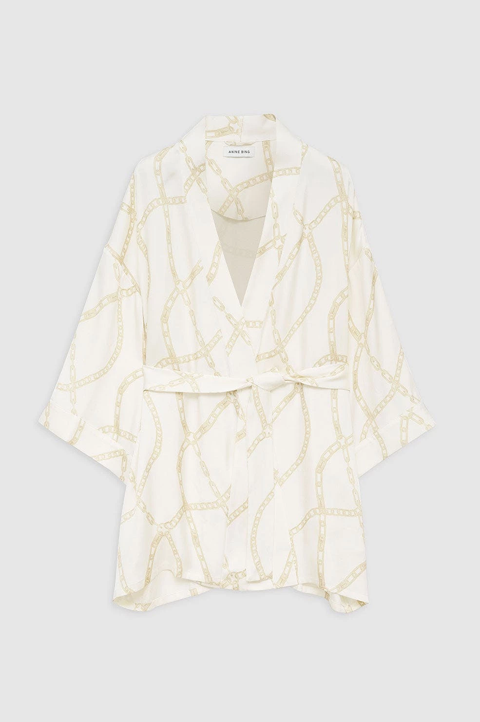 A simple night robe crafted in 25mm double-faced silk charmeuse with a cream and tan link print. It features a wide, three-quarter length sleeve, self-fabricated belt, and belt loops. Style the Kara Robe with the matching Lisette Slip Dress to complete the look.