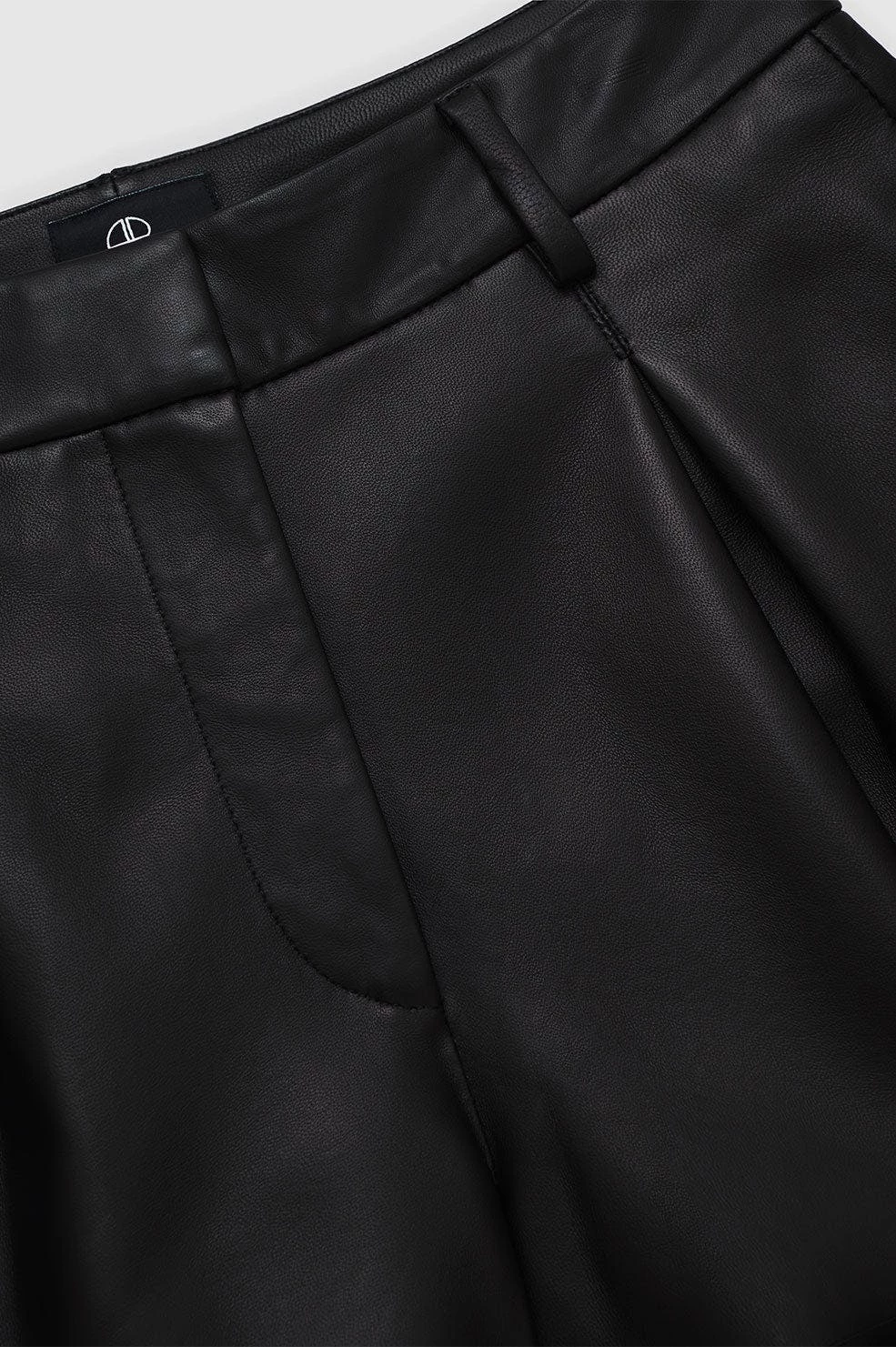The Allie Short is crafted from unlined 100% leather bonded with soft jersey for a sleek, comfortable fit. The pair features wide, slanted leg openings and prominent pleat detailing with a front tab closure.