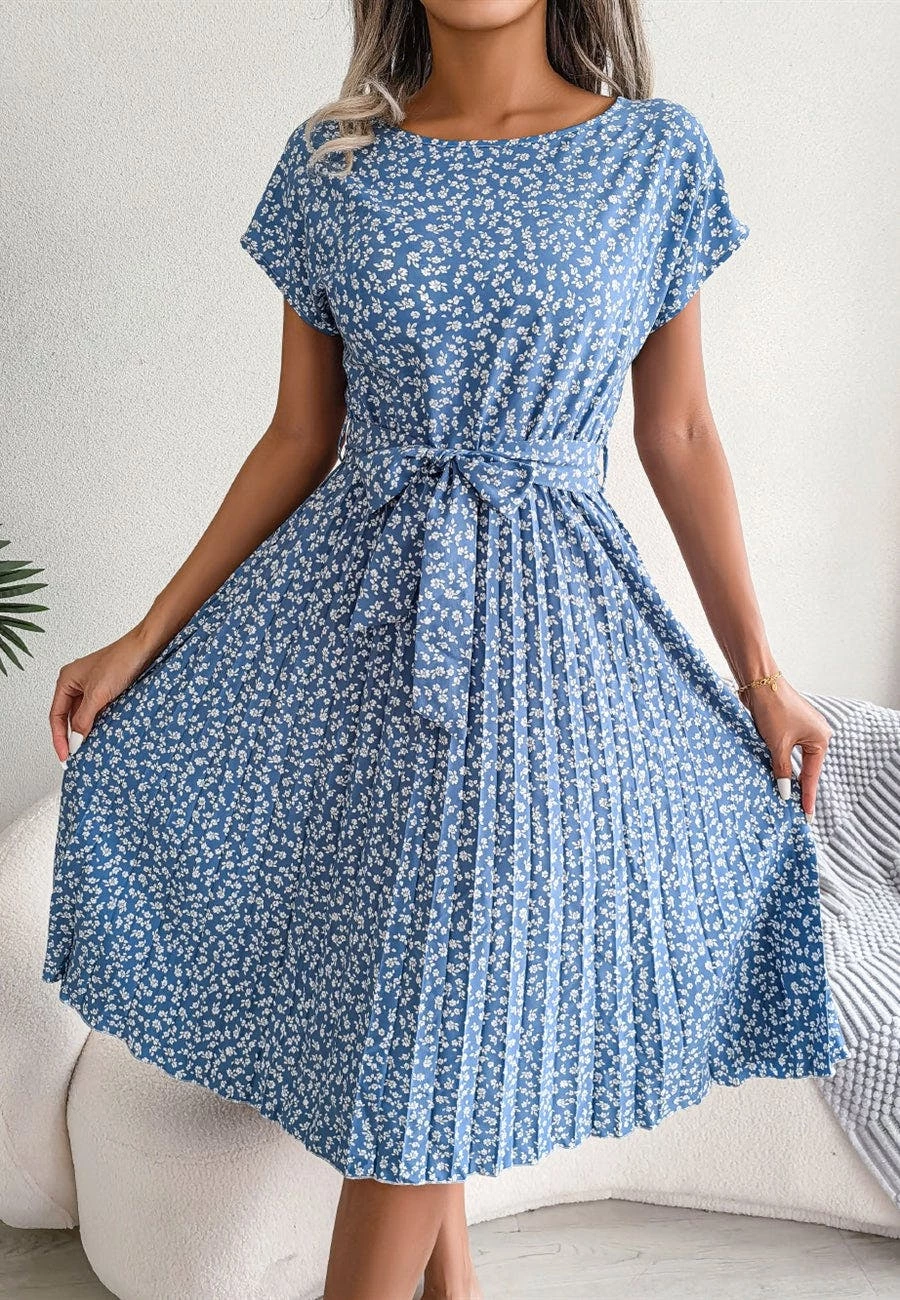 The Anna-Kaci dress is detailed with a classic ditsy floral print. Features a round neck line, short sleeves, tie-waist detail, pleated skirt, and below knee length. Pair it with a necklace and boots for a juxtaposing look.