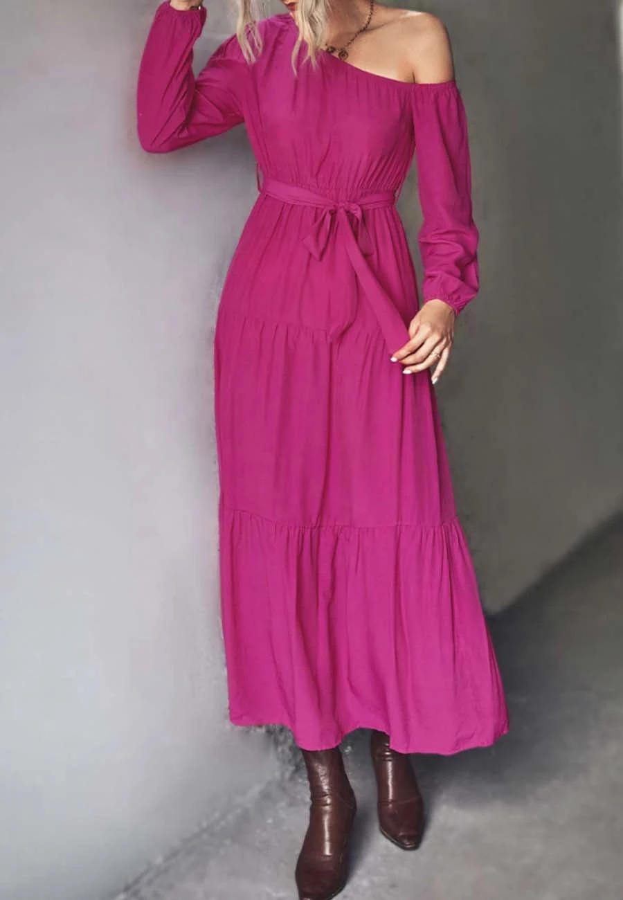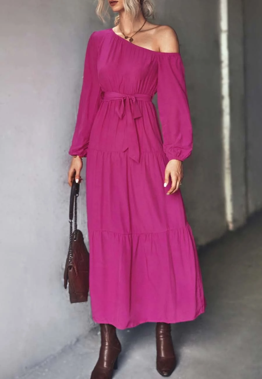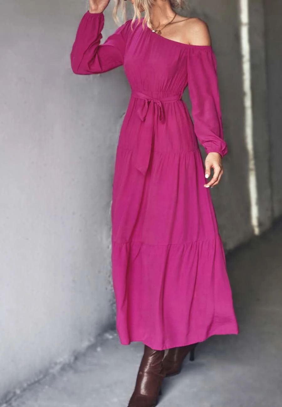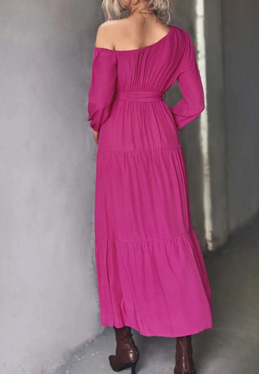 The Anna-Kaci dress is detailed with a flirty one shoulder design. Features solid color, long sleeves, tiered design, flowy skirt, and ankle length. Pair it with layered necklaces and ankle boots for a chic look.