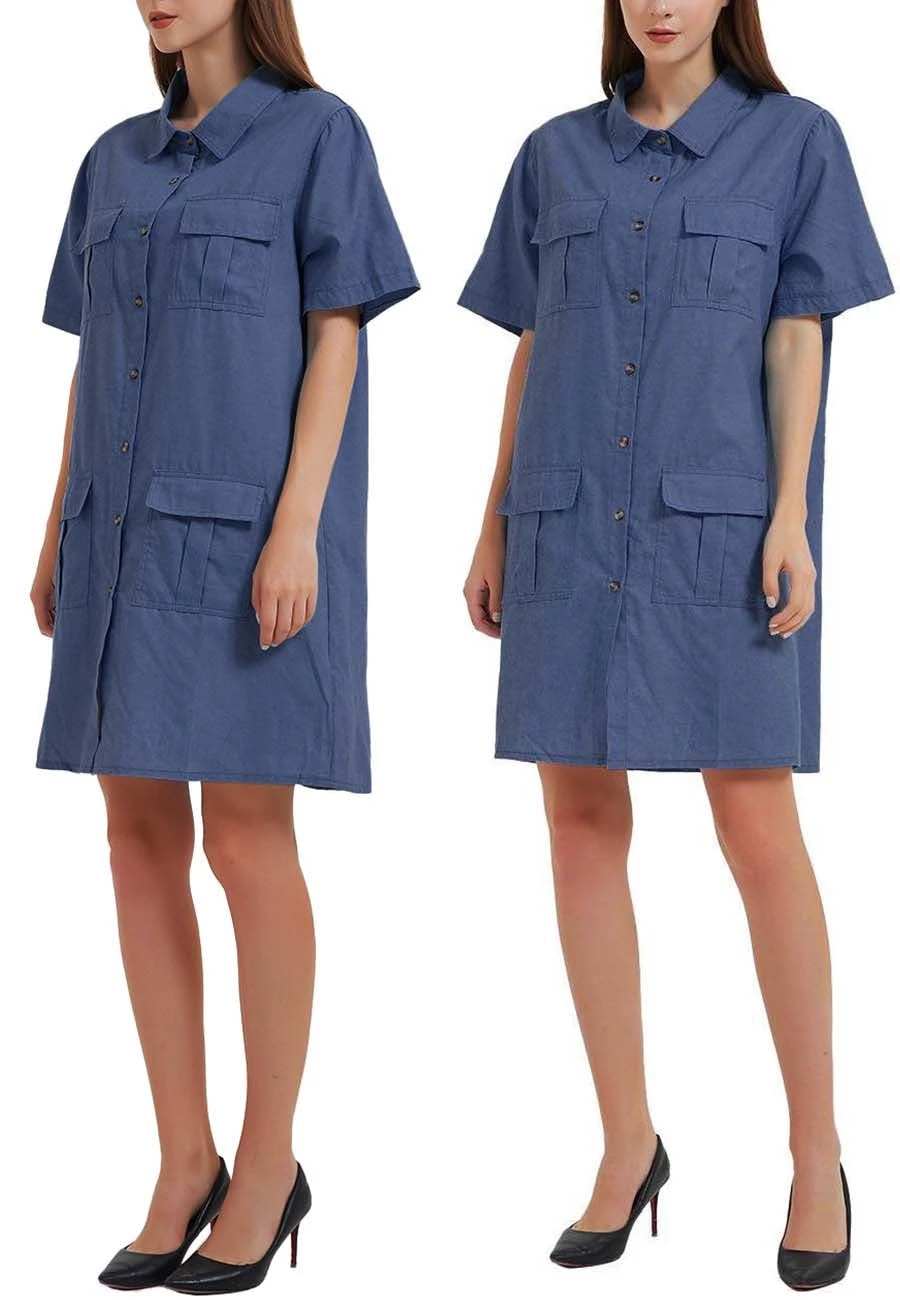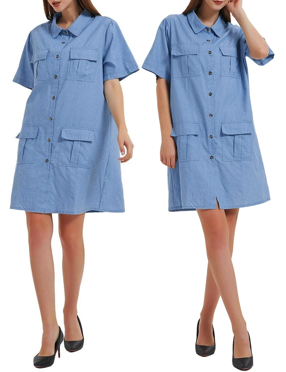 – Soft & Lightweight: This dress details a relaxed loose fit and a soft inner lining for comfort! The material is super breathable for all day wear.- Details: This stunning front button down dress features 4 front pockets, a flowy a-line silhouette, a denim material, short sleeves, turndown lapel collar, above the knee length, no stretch, and a minimalist look.- Matching: Style this beautiful denim dress with cute sandals, stunning accessories, and a straw sun hat for a summertime look. Simple sneakers and a satchel bag will also work nicely with this casual dress.- Occasions: This dress is great for any occasion! Wear it to the office, to the beach, to a party, a club, a concert, or a casual wedding. This chic dress is very versatile in its possibilities.