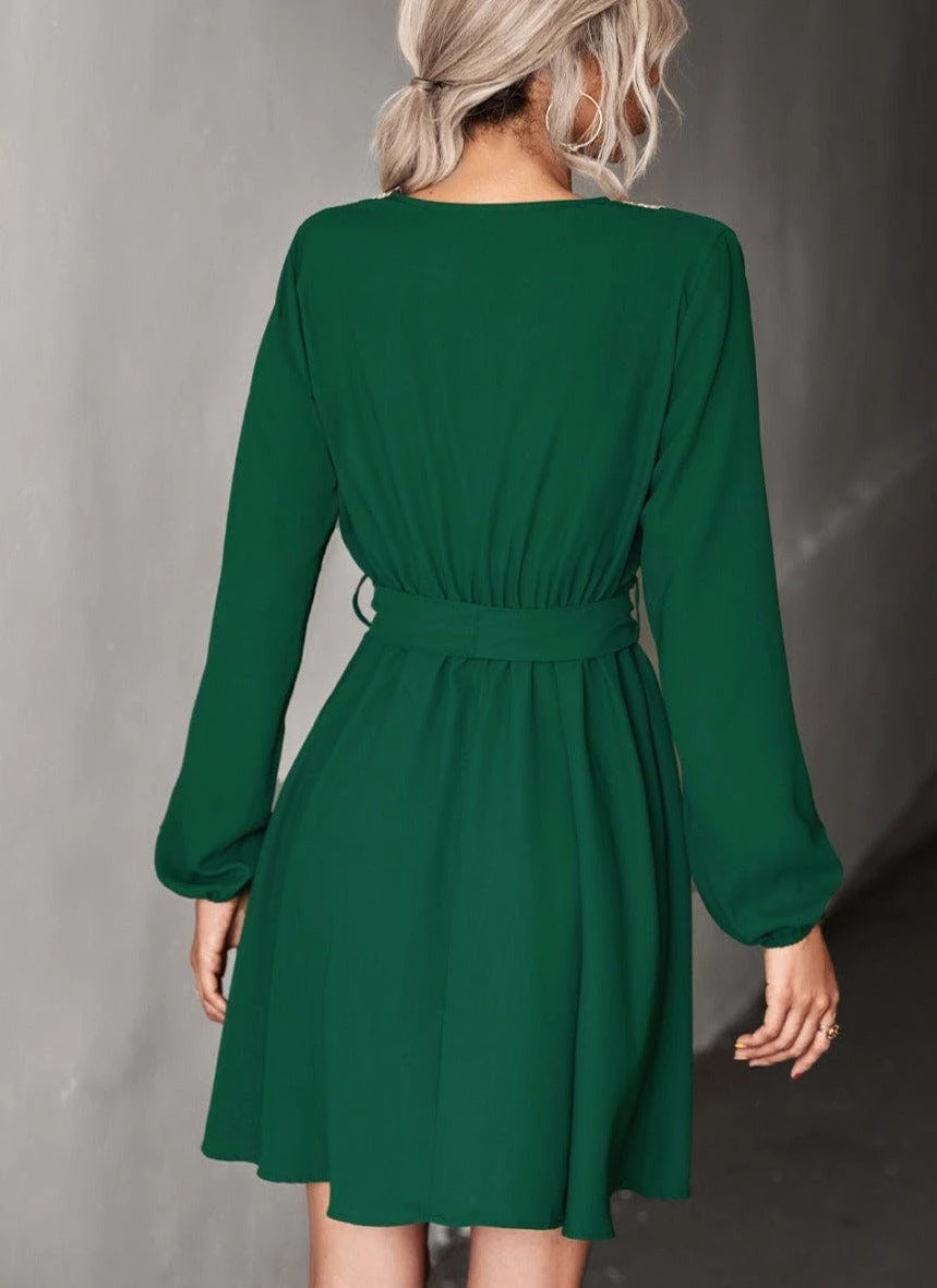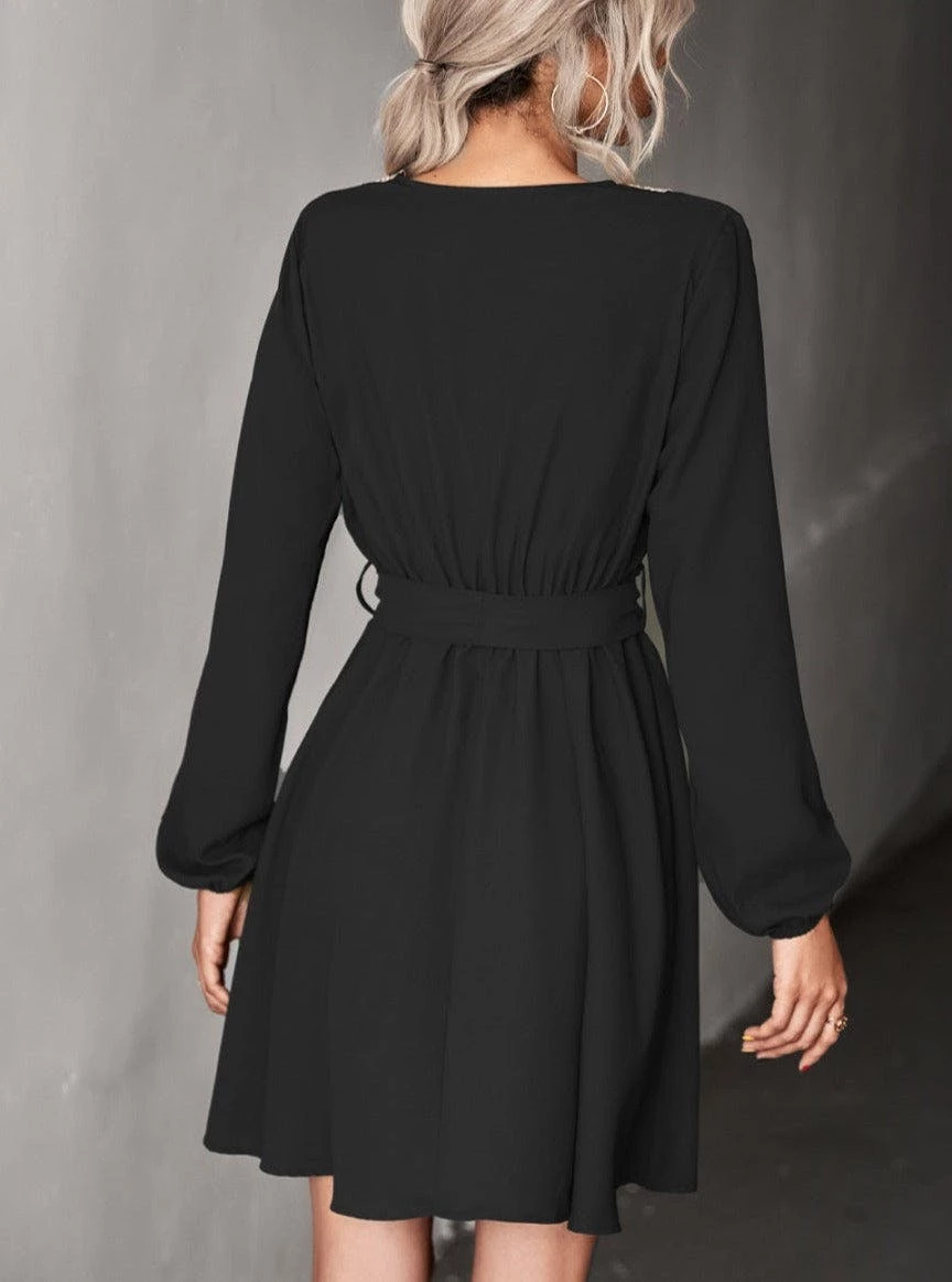 The Anna-Kaci dress is detailed with a beautiful contrast crochet detail. Features a v neck line, long sleeves, flowy skirt, and above knee length. Pair it with a handbag and heels for a sophisticated look.