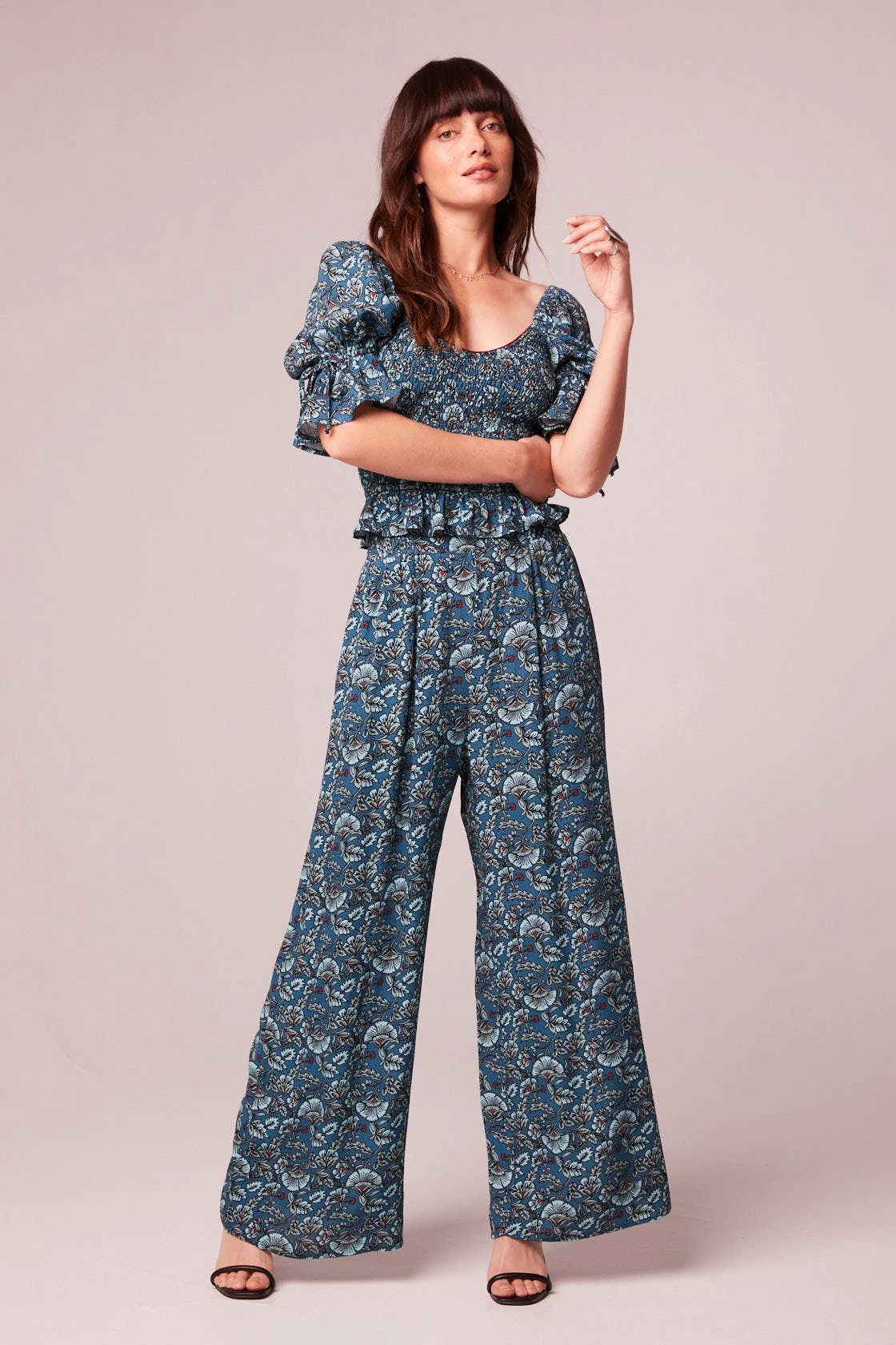 Wide legs cinch in a high waist with the sweetly patterned Elise pants.