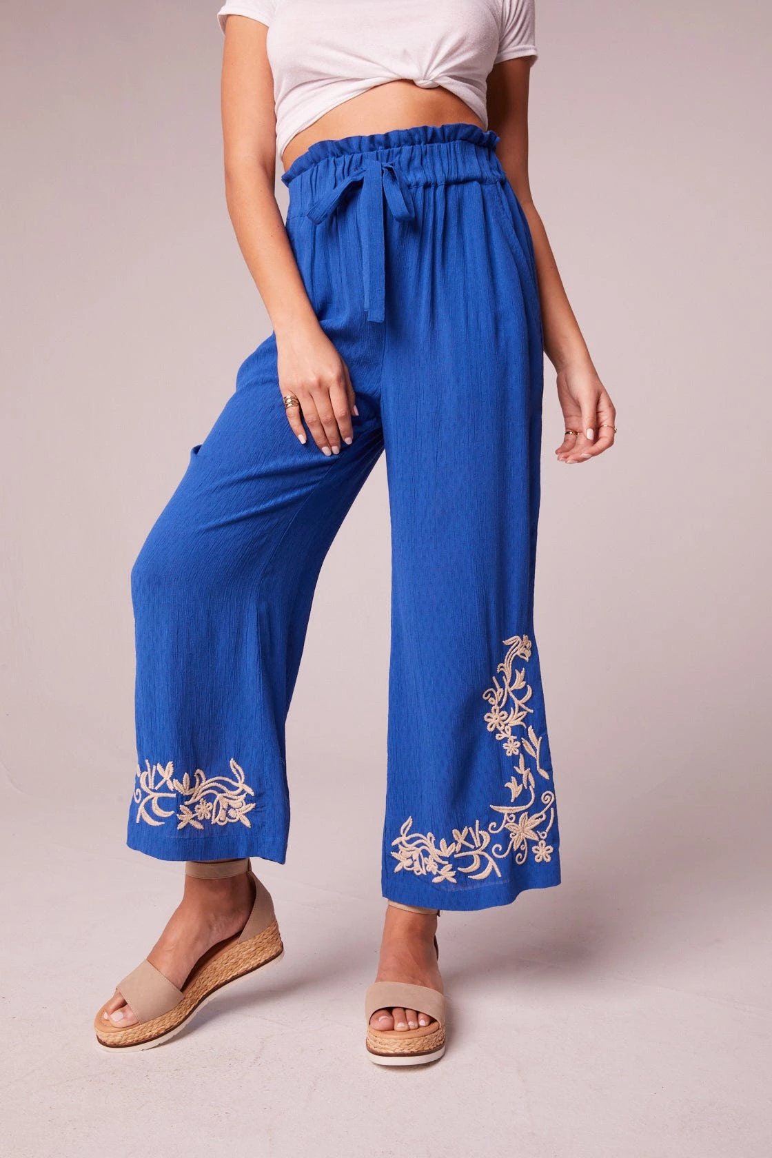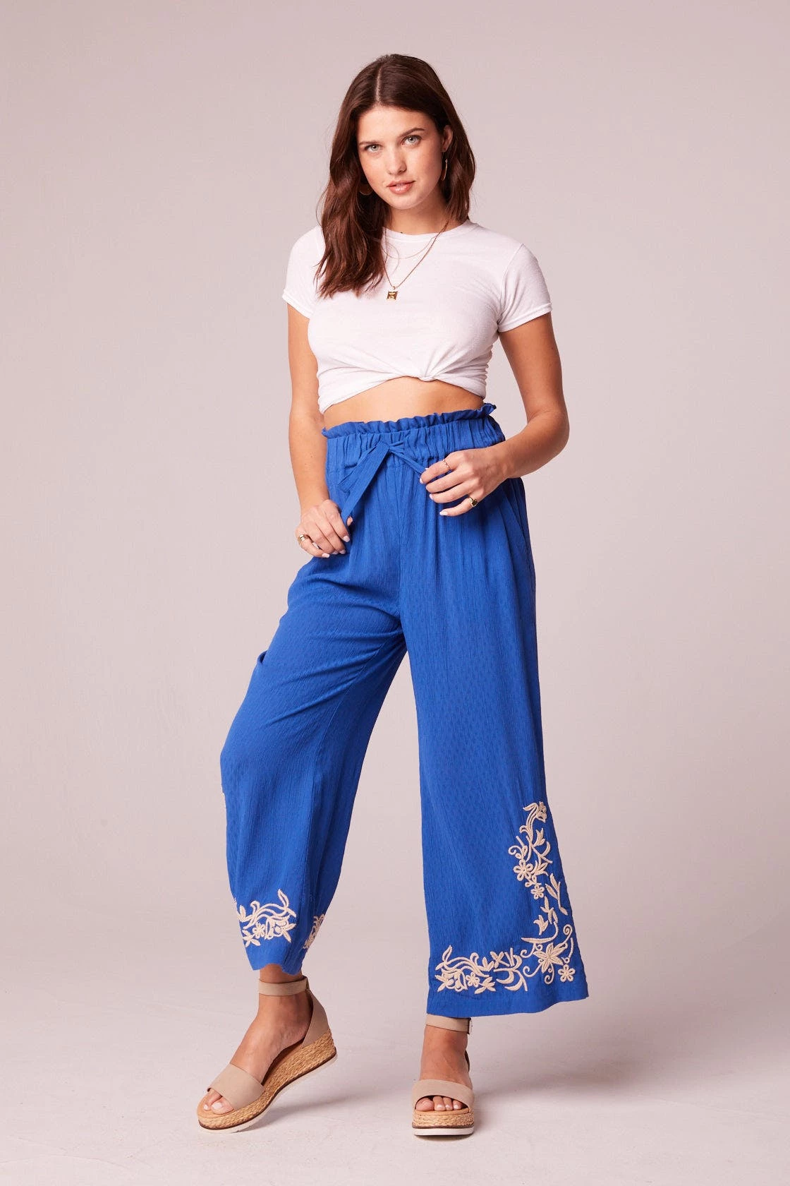 A paperbag waist and embroidery detail washing over the wide legs of the Marta pants create comfort meeting enchantment.