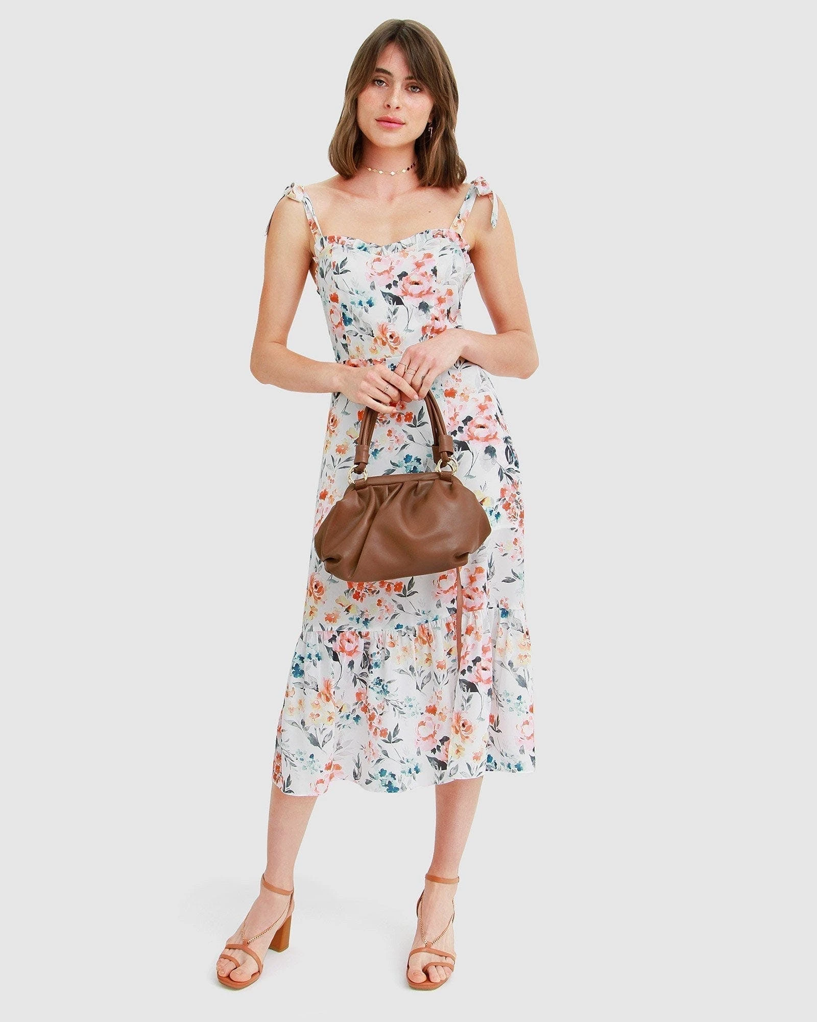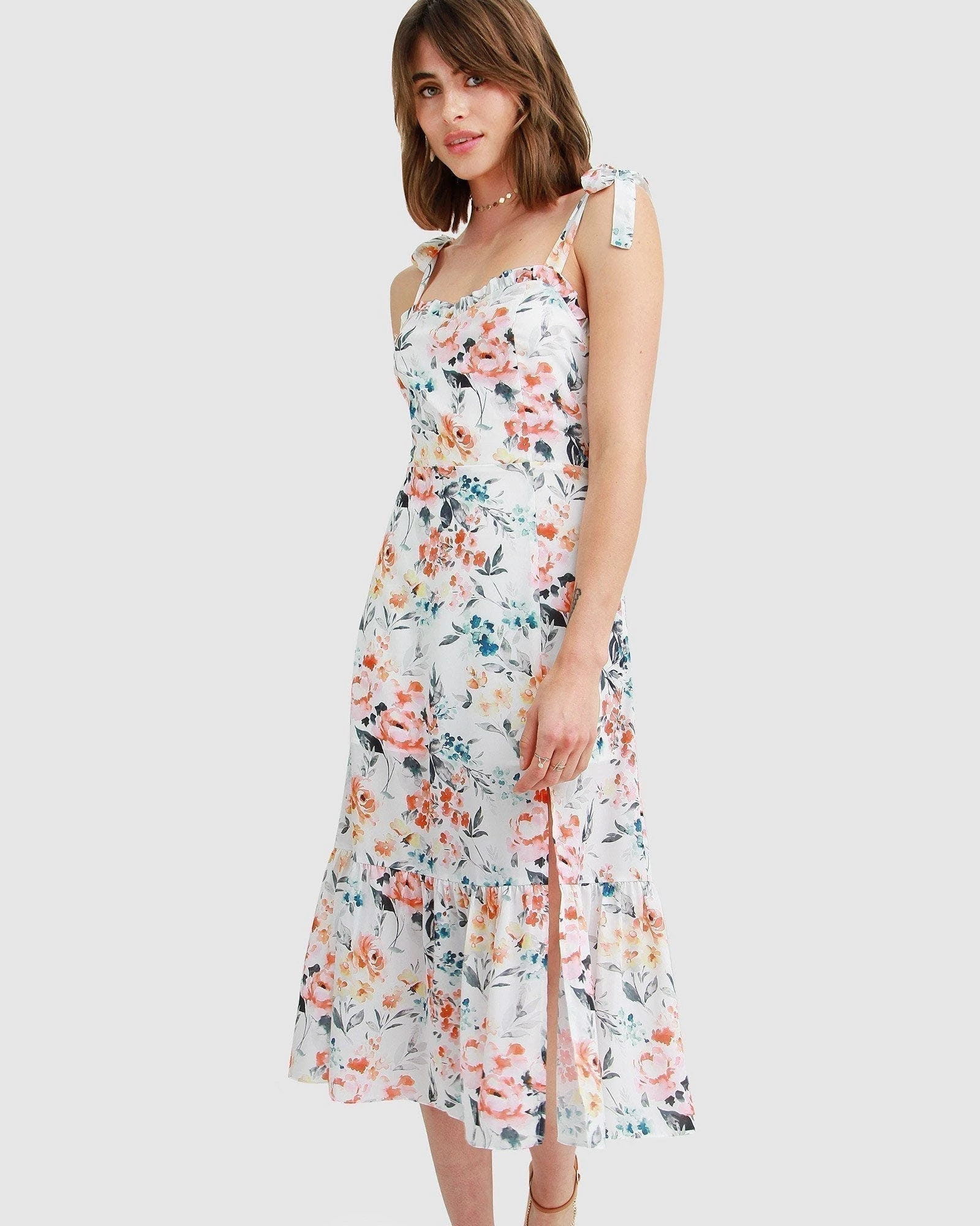 A stunning number to embrace the warm weather, the Summer Storm Midi Dress features ruffle trim details with a thigh high slit as a sweet surprise. We made sure to include adjustable elements such as smocked back panel and tie up straps to perfect the fit to your needs.