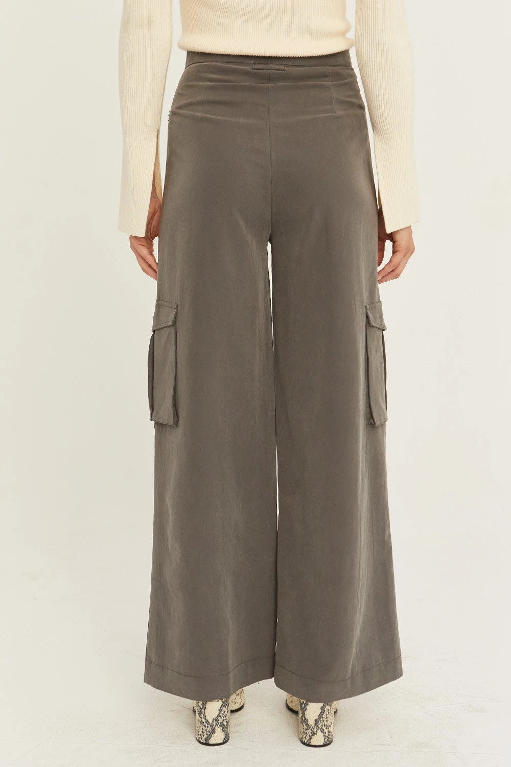 These pants feature waist flap detail with button and utility pockets in a wide leg silhouette. Made with lightweight, buttery tencel-lycra blend.
