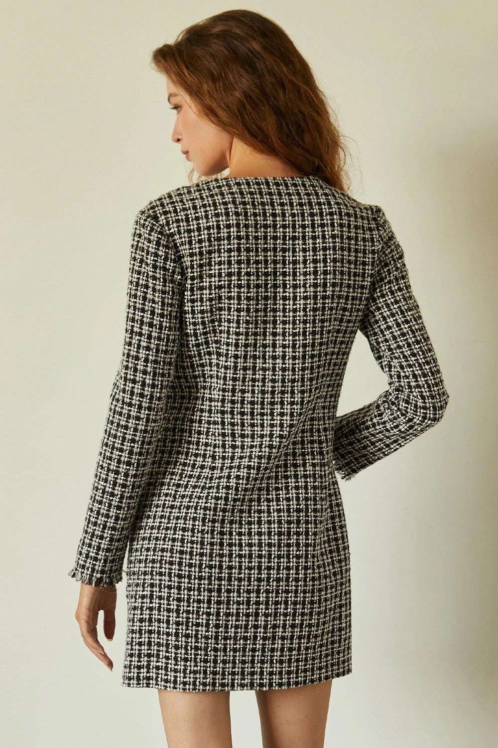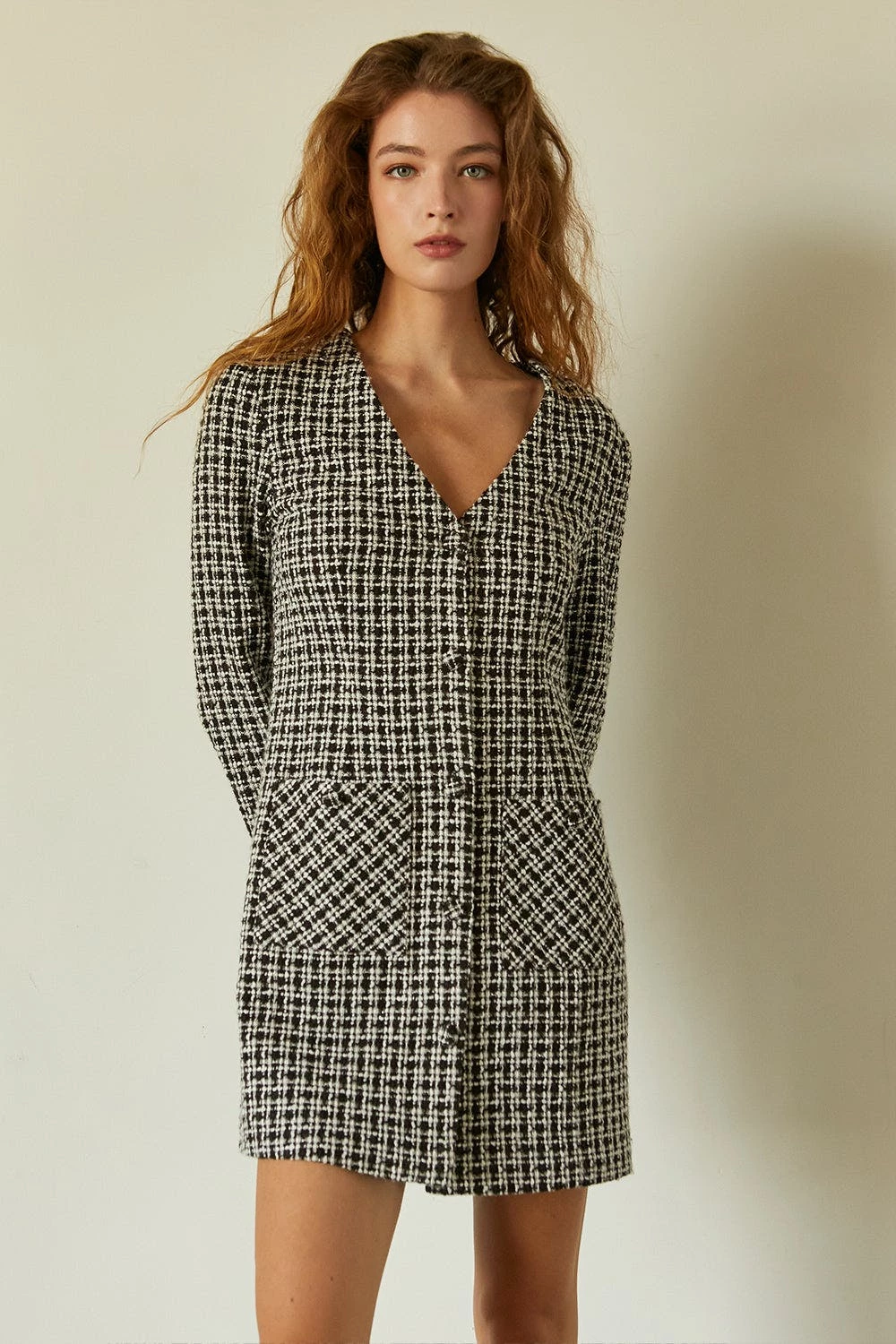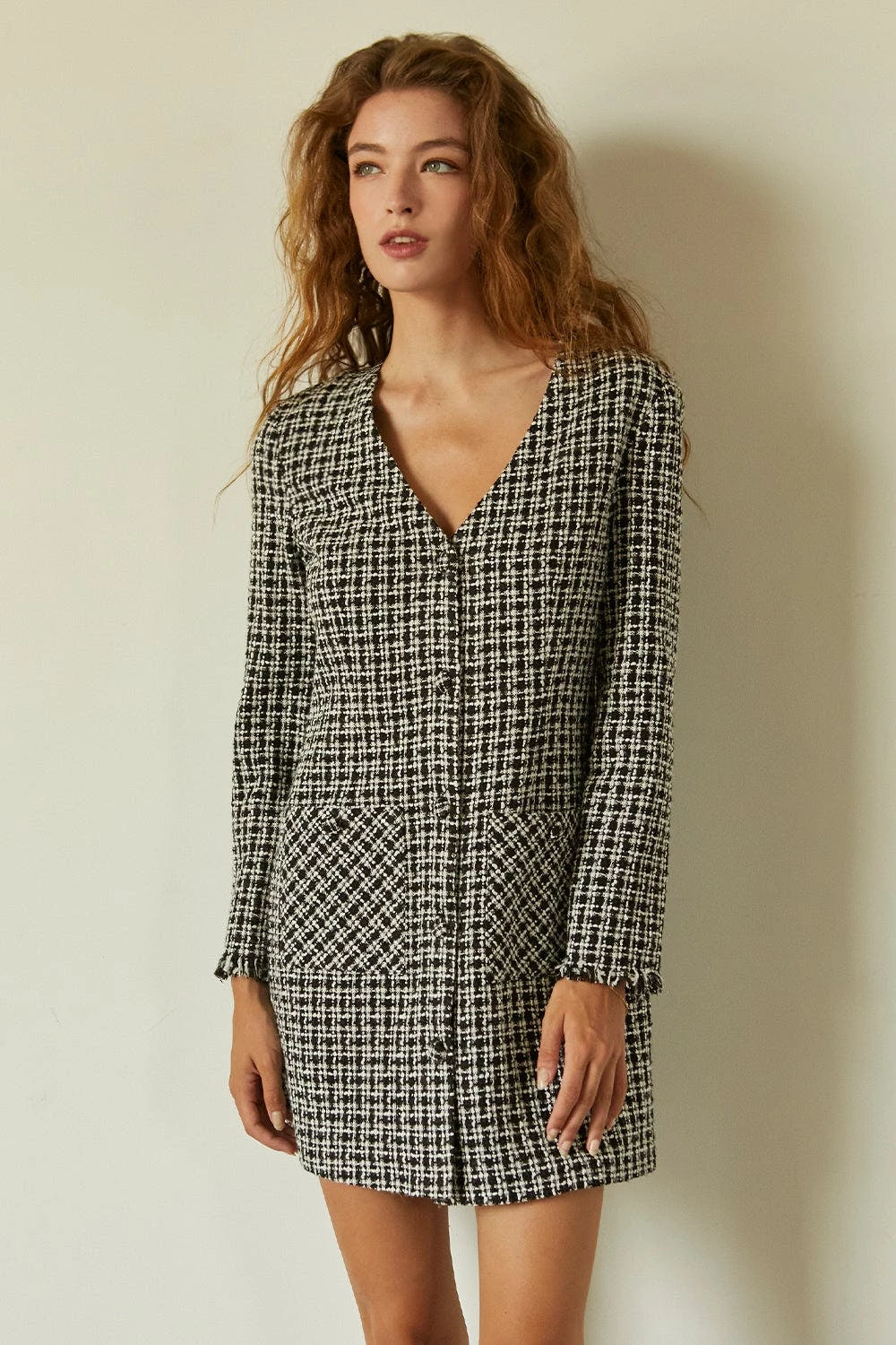 This tweed mini dress features v-neckline, front button closure, two front patch pockets and long sleeves with frayed hem.