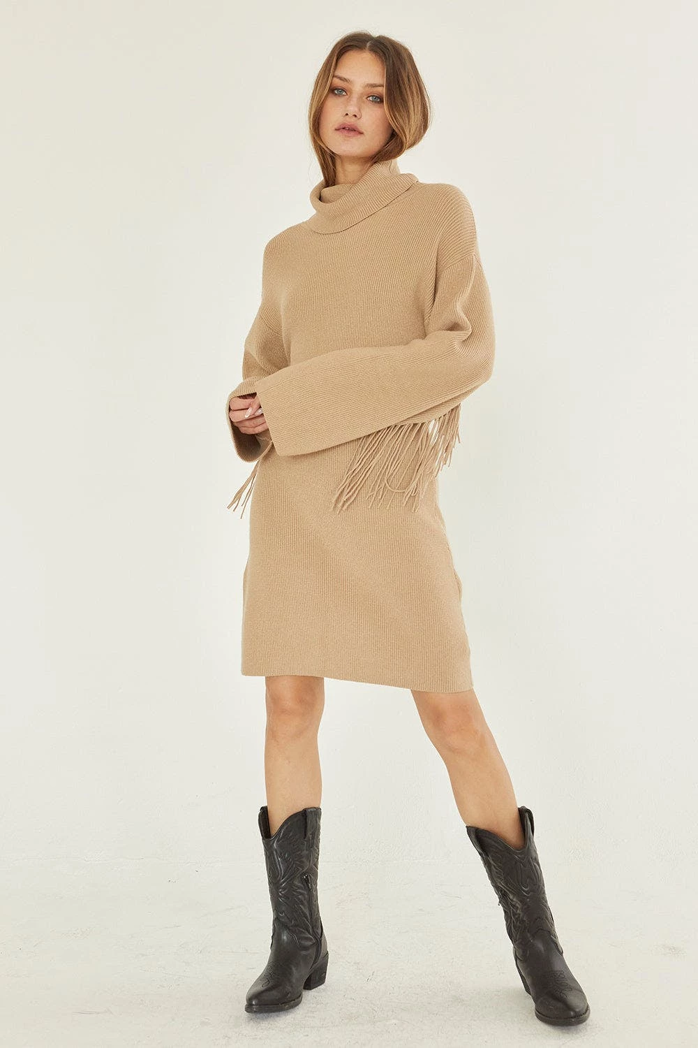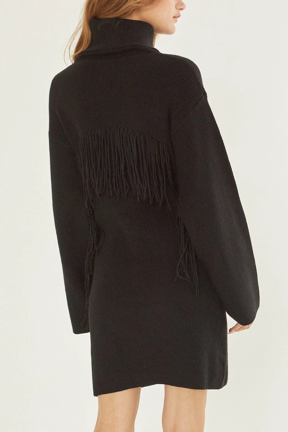 This Mini Sweater Dress features turtleneck, long oversized sleeves, and fringe detail on arms and across back.