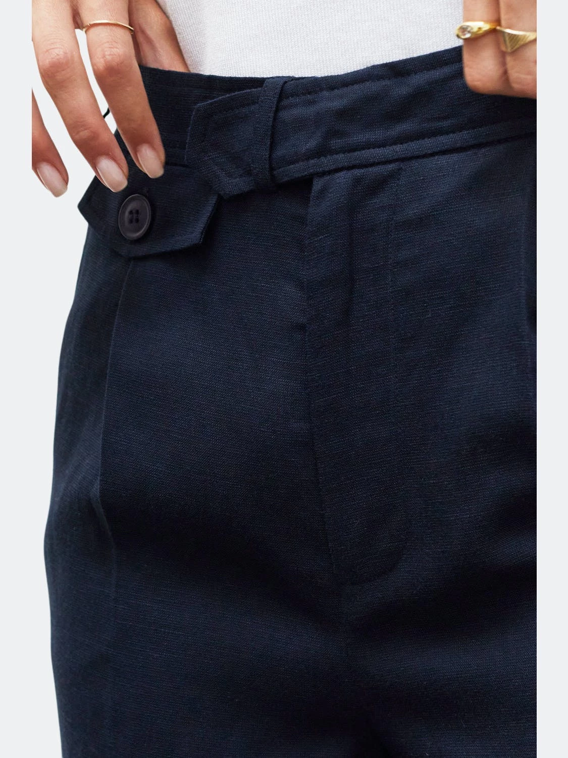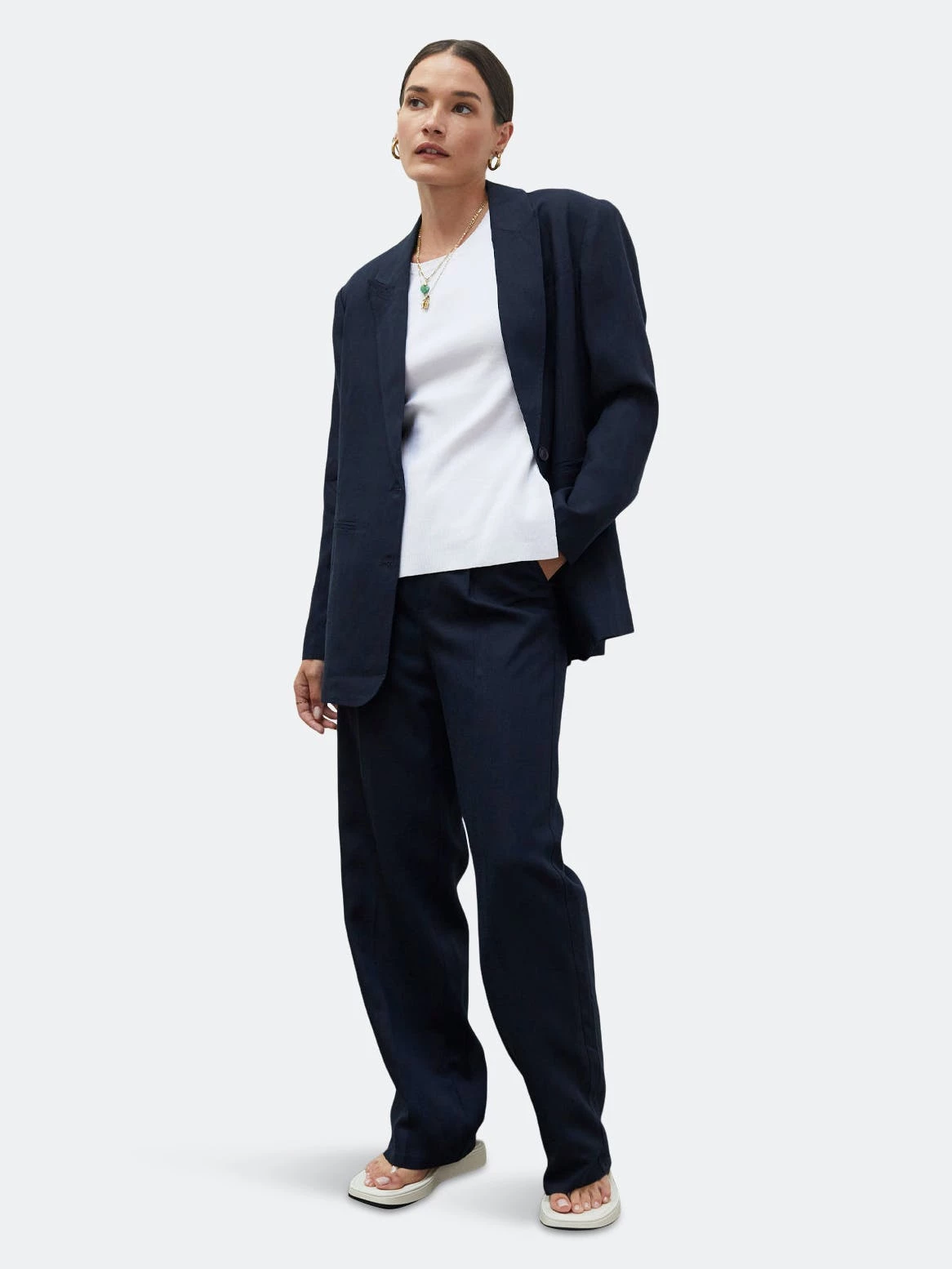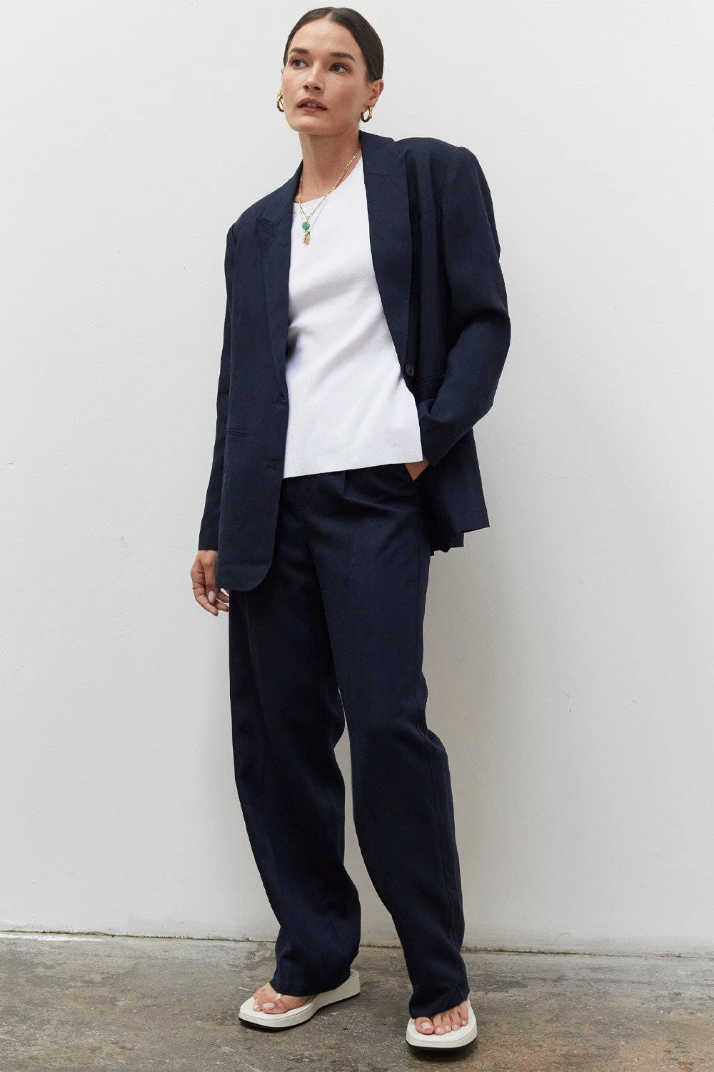These are high-rise, wide leg trousers with single flap pocket detail at front. Made with lightweight, breezy rayon-linen blend material perfect for warmer days ahead. Pair it with the matching Jules Oversized Blazer for a clean, simple look.