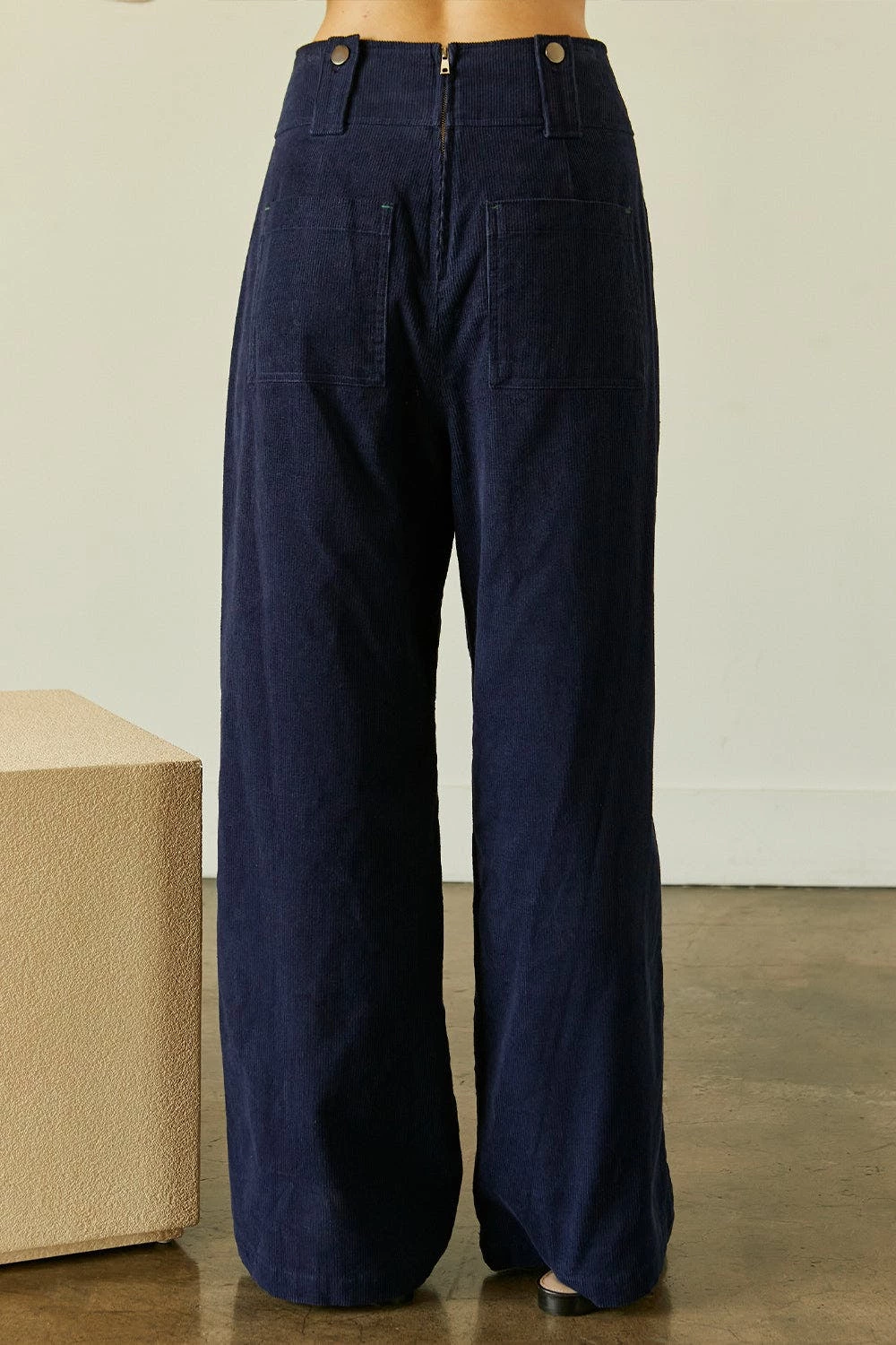 Taylor Corduroy Pants are high-rise, wide leg pants with side and rear patch pockets. Feature thick belt loops with button closure, contrast thread tacking detail on pocket opening and back zip closure.