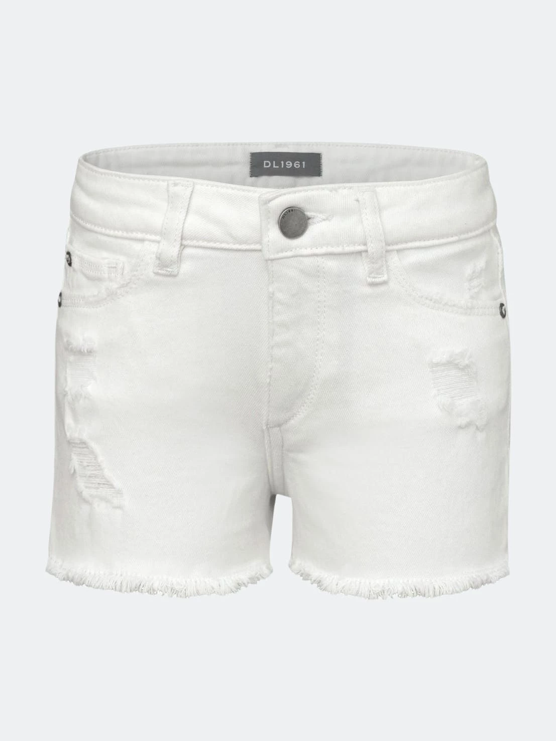 The Lucy is a classic cutoff short with a frayed hem and a flexible, high-recovery fit that will always keep its shape. Wilshire is a super soft solid white denim with destruction, raw hem, tonal stitching and silver hardware.