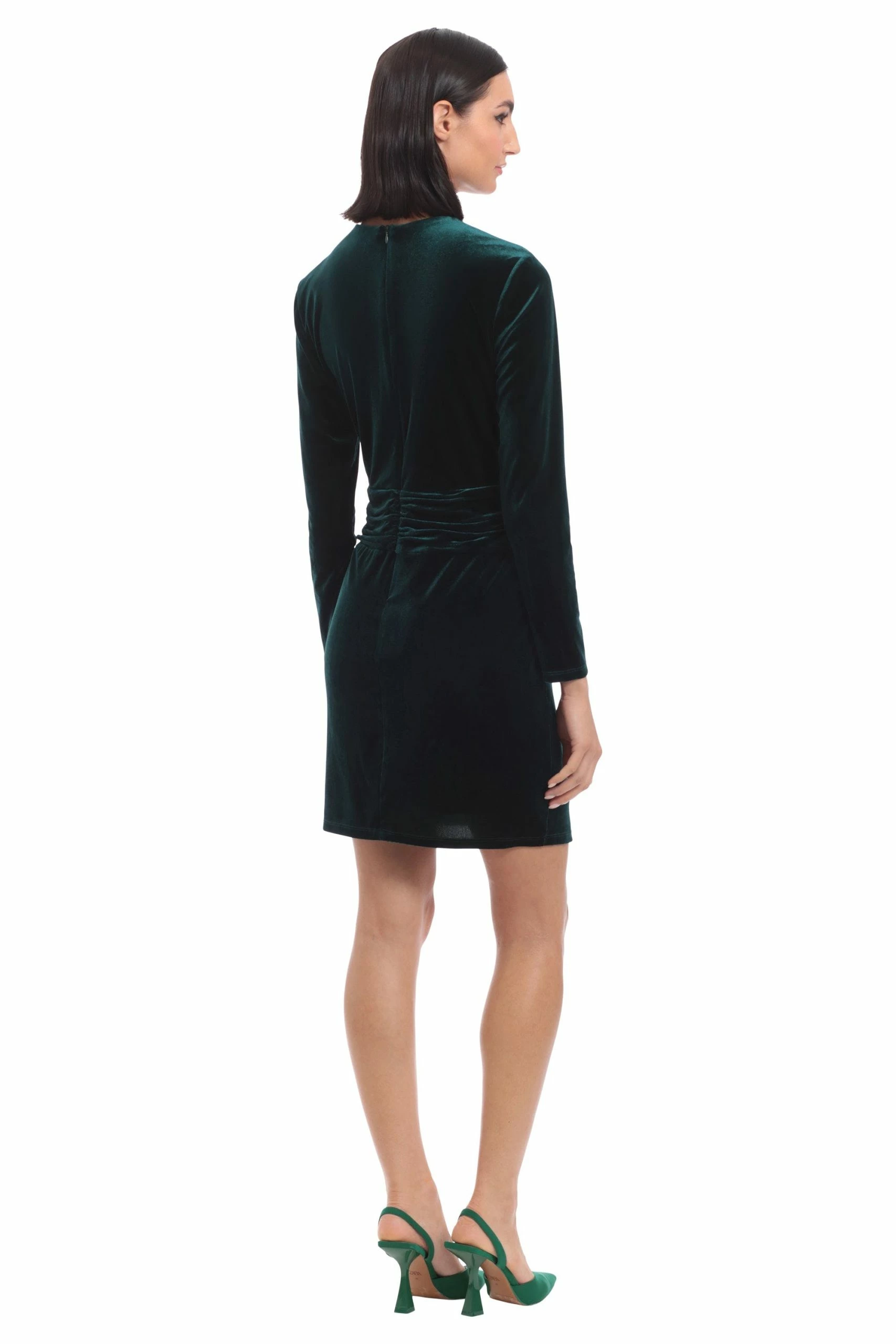 Rani is a deep green mini in popular holiday velvet fabric. They love her ruched waistline, draped v-neck and long sleeves.