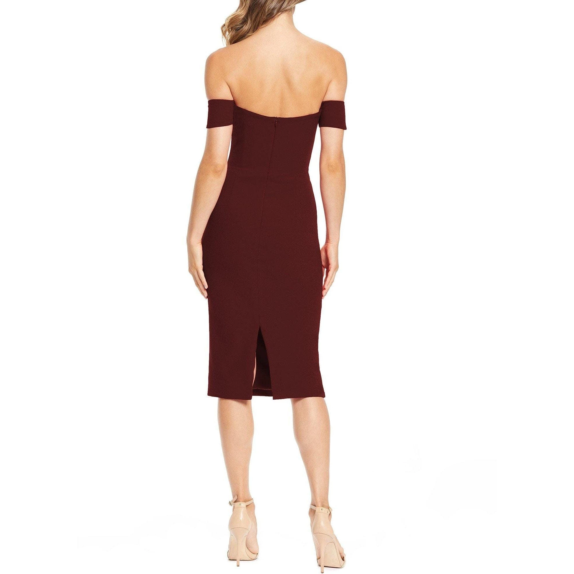 The form-fitting Bailey dress flaunts a cold-shoulder style sleeve and a semi-sweetheart neckline. The slit in the back of the snug pencil-shaped skirt adds a flirty touch to this sophisticated cocktail dress. This beautiful dress is made in our flattering classic crepe fabric in Burgundy.
