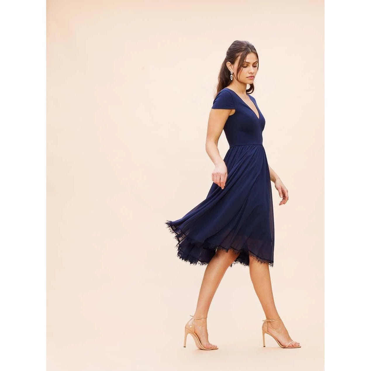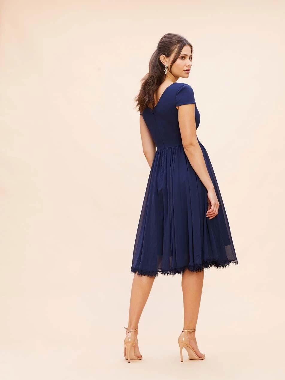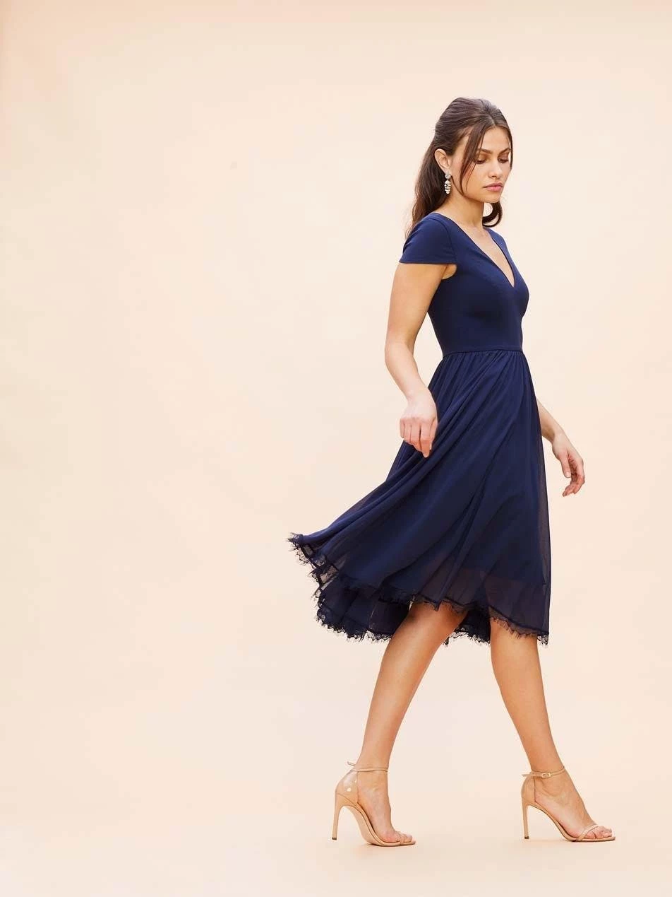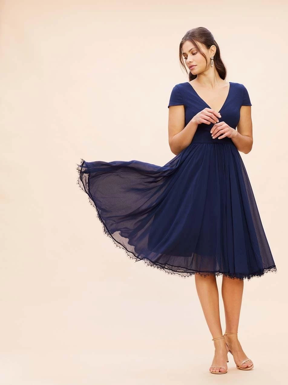 The charming but sophisticated Corey dress in Midnight Blue pairs a fitted crepe bodice with a softly gathered chiffon skirt. Cap sleeves add coverage to balance the sultry plunging v-neckline and curved v-back of this design. A scalloped lace hem dresses up the midi-length skirt for special events.