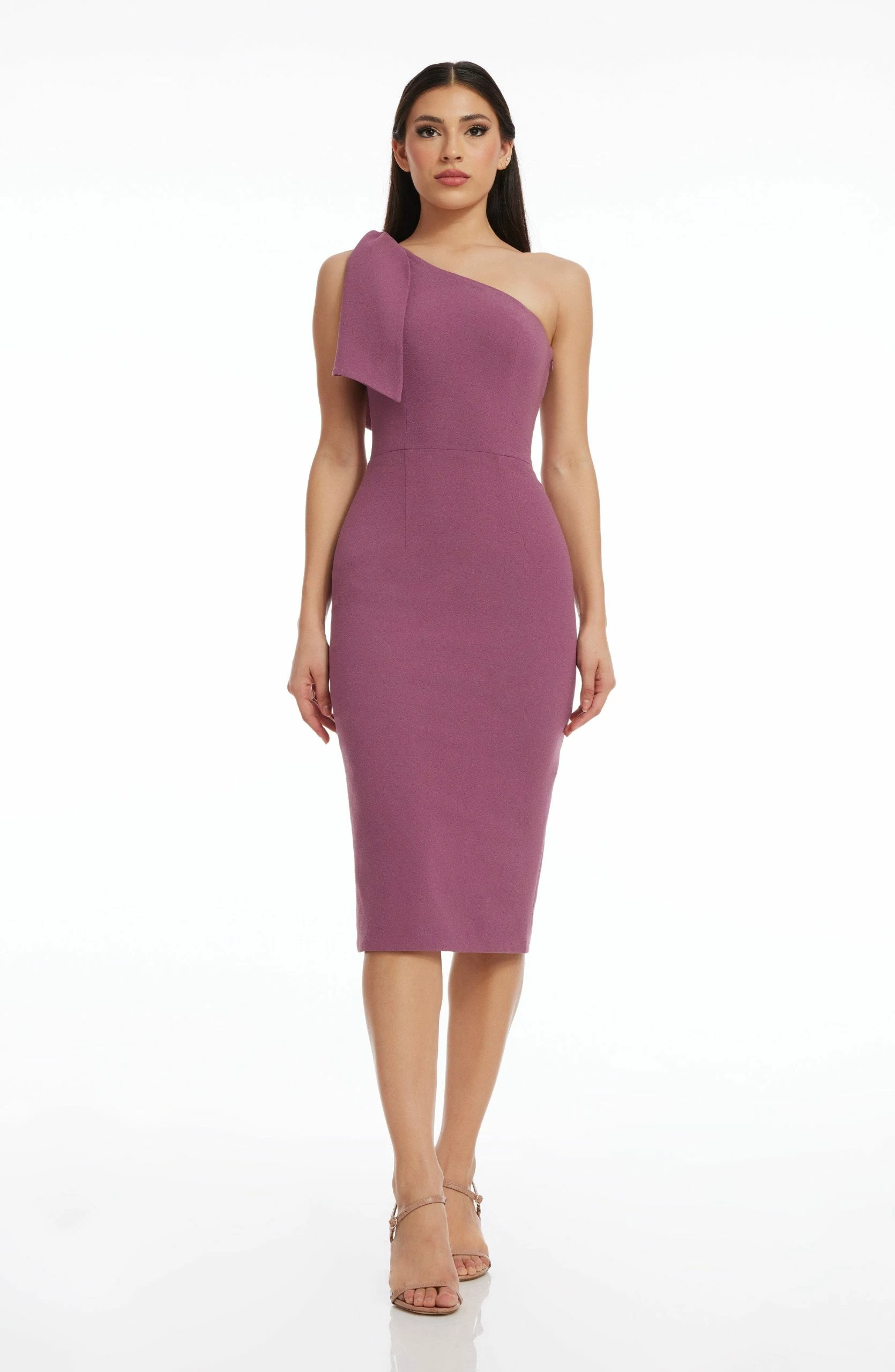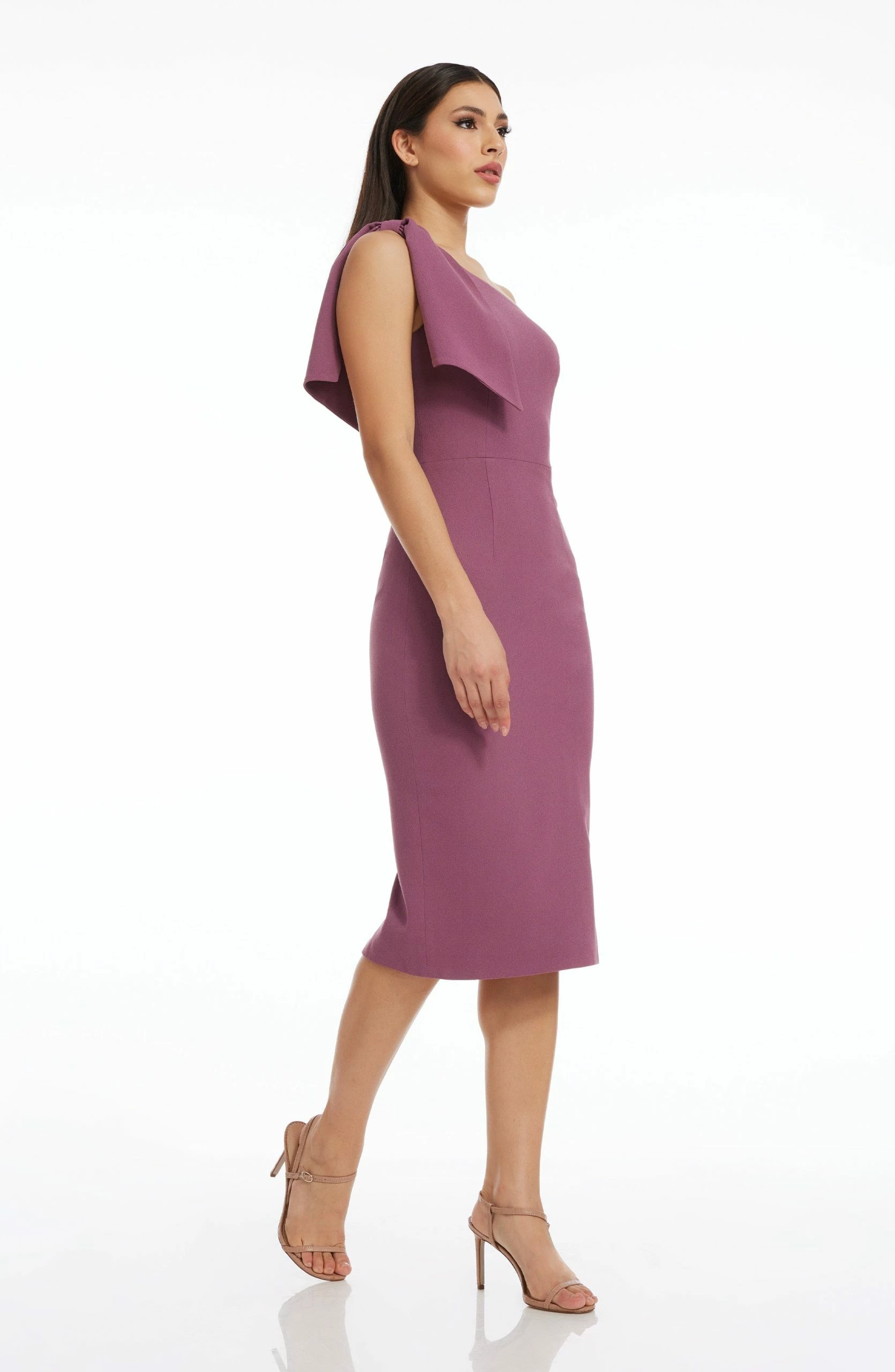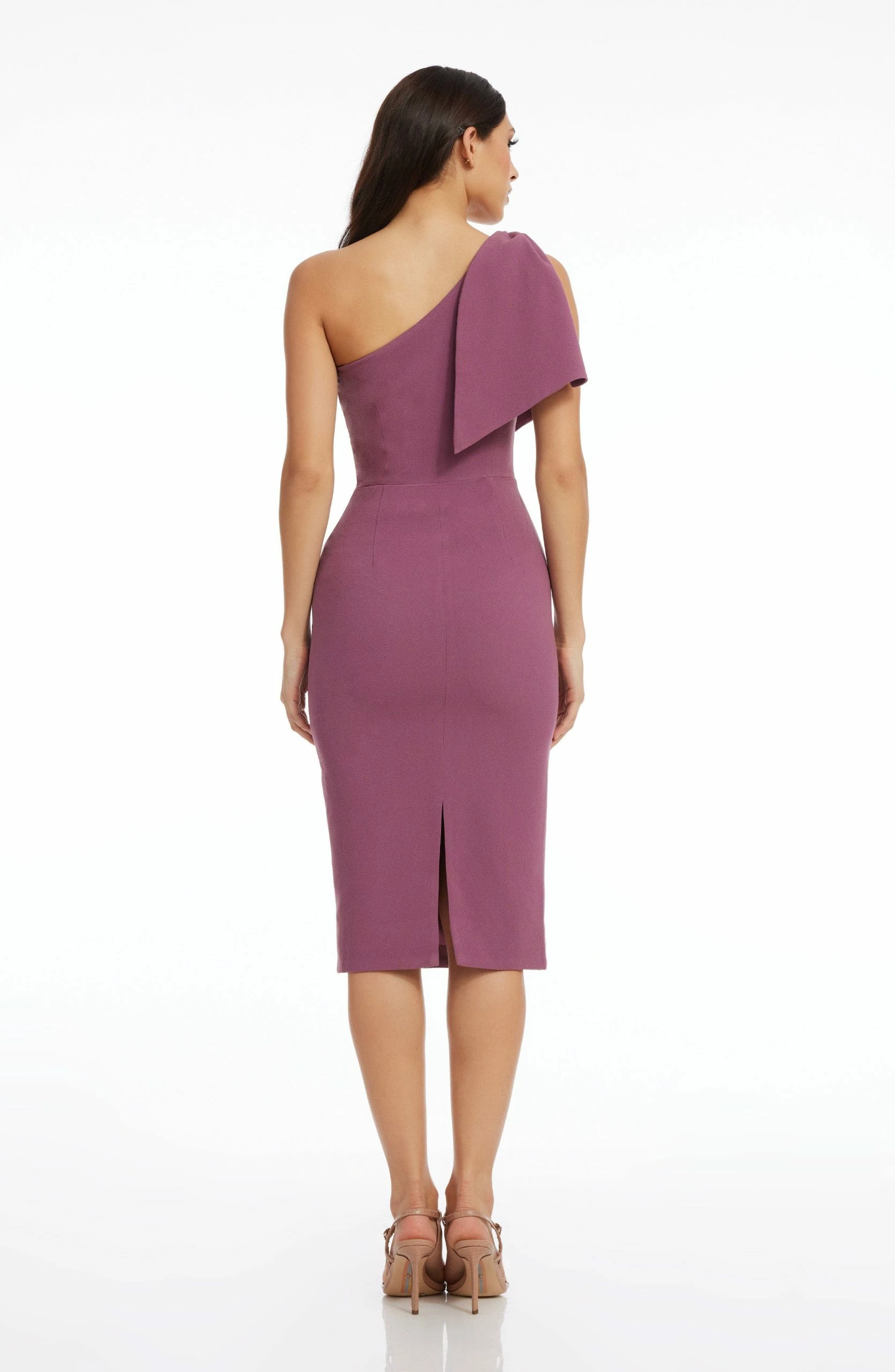 With an elegant asymmetrical neckline and a large shoulder bow, Tiffany is an elegant choice for any occasion. This form-fitting Orchid ensemble is made from Dress The Population stretch crepe material and has a straight skirt that lands below the knees. The dress tapers at the waist and has a back slit, adding a sultry touch.