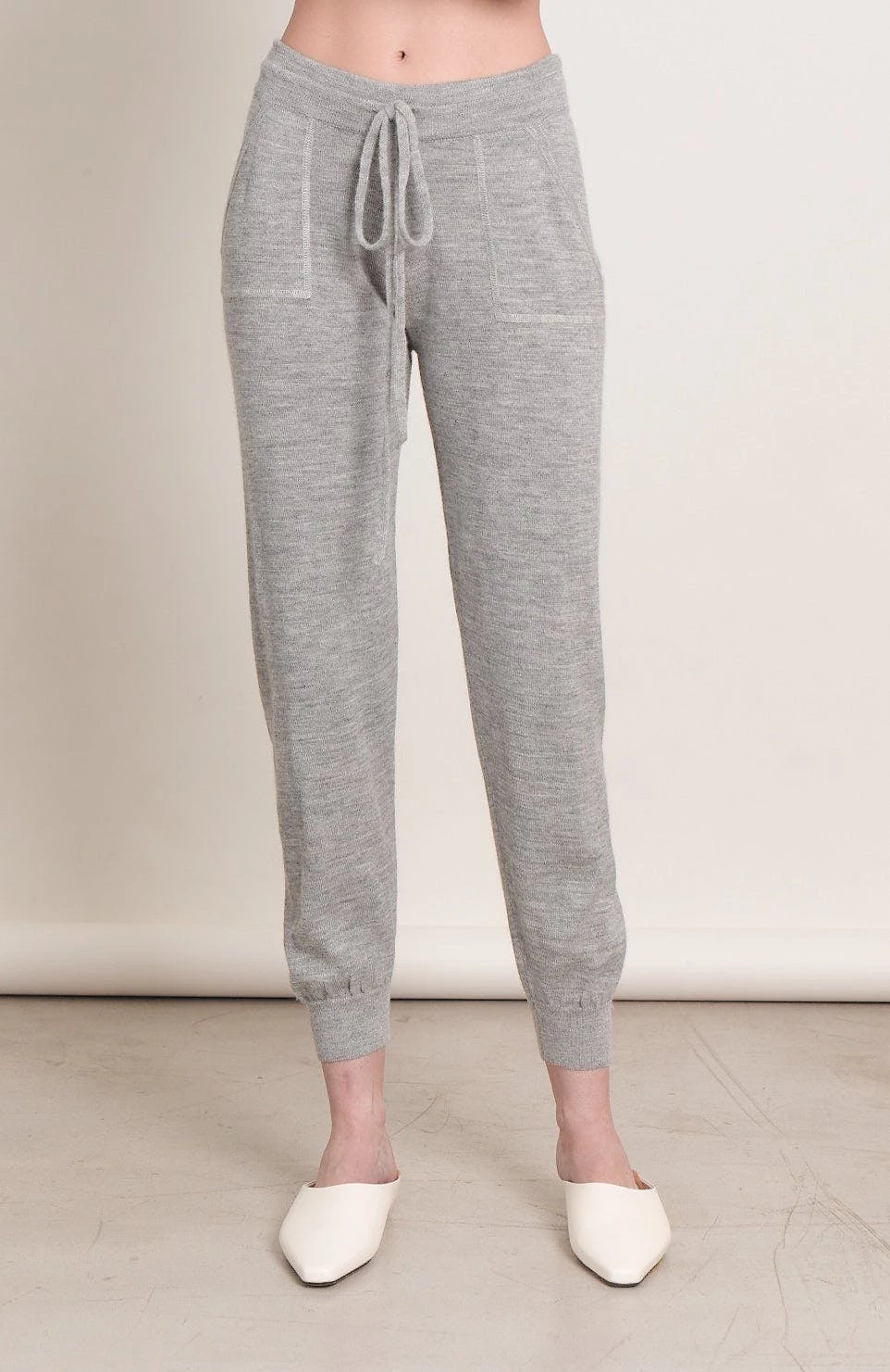 – Jersey stitch with fine rib trim at ankle cuff to blouson pant volume.
