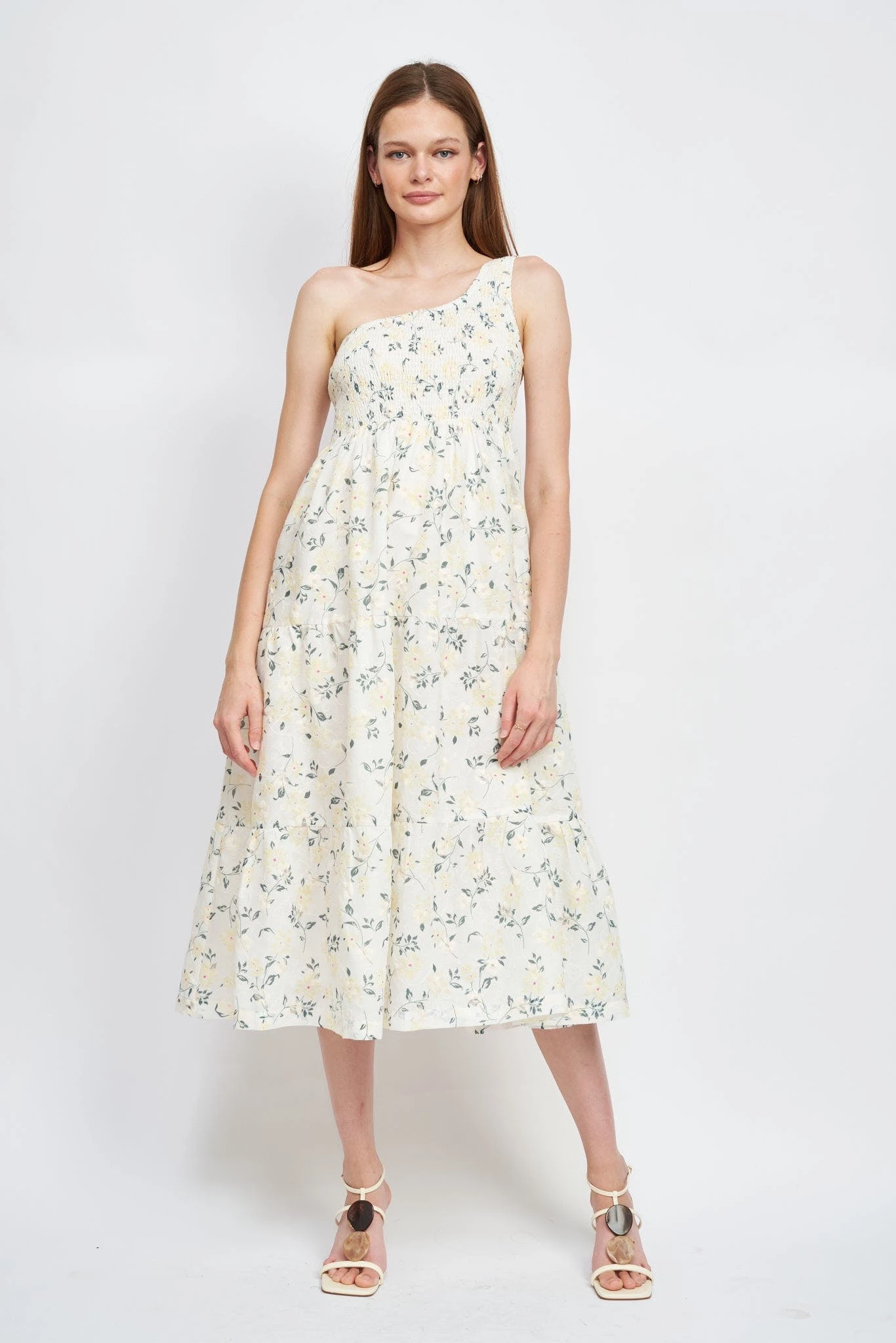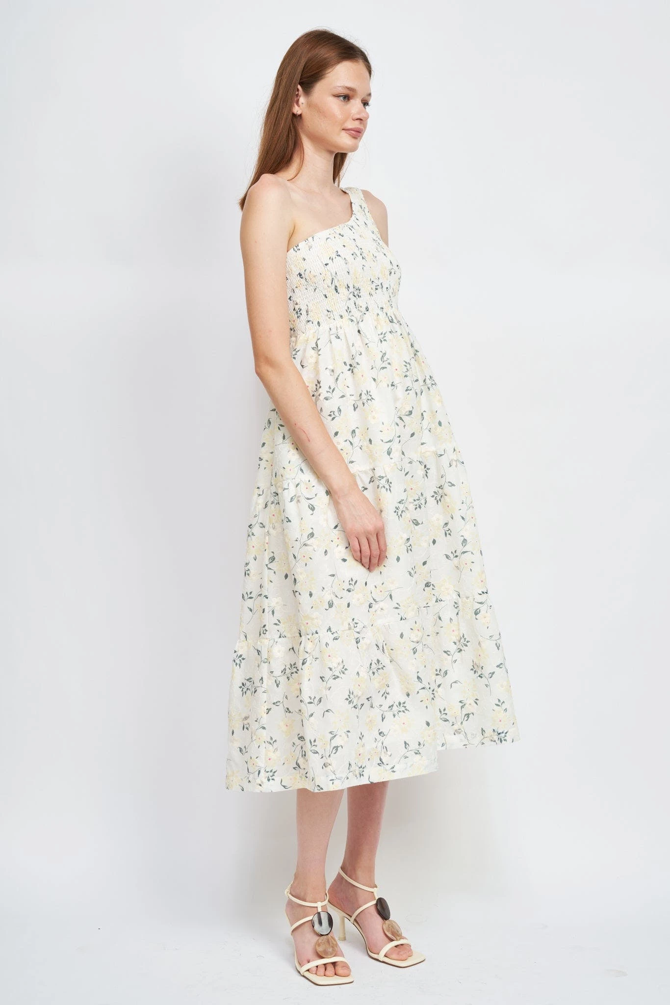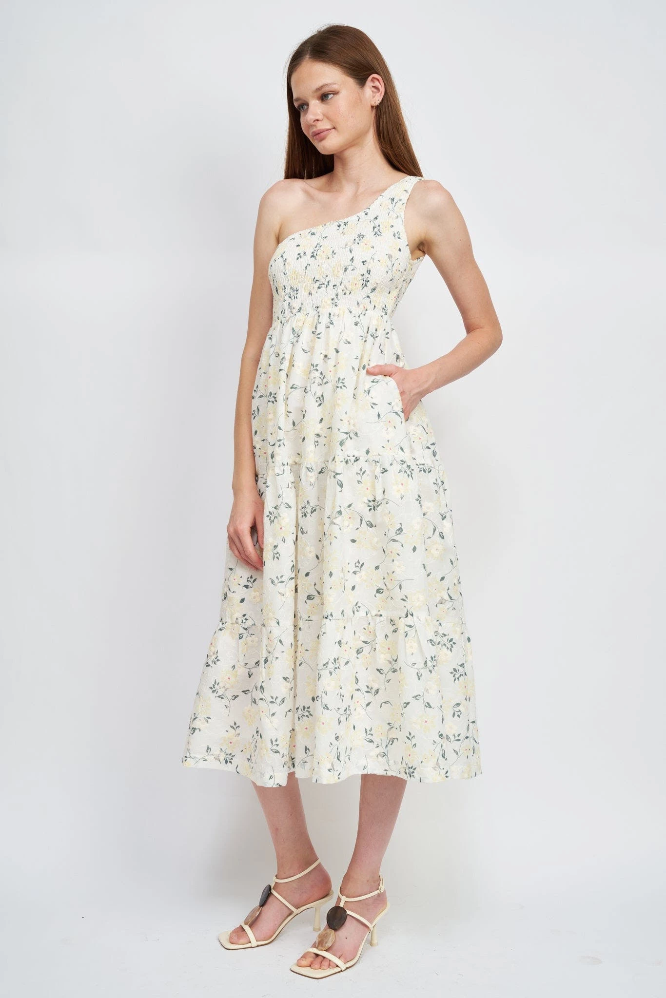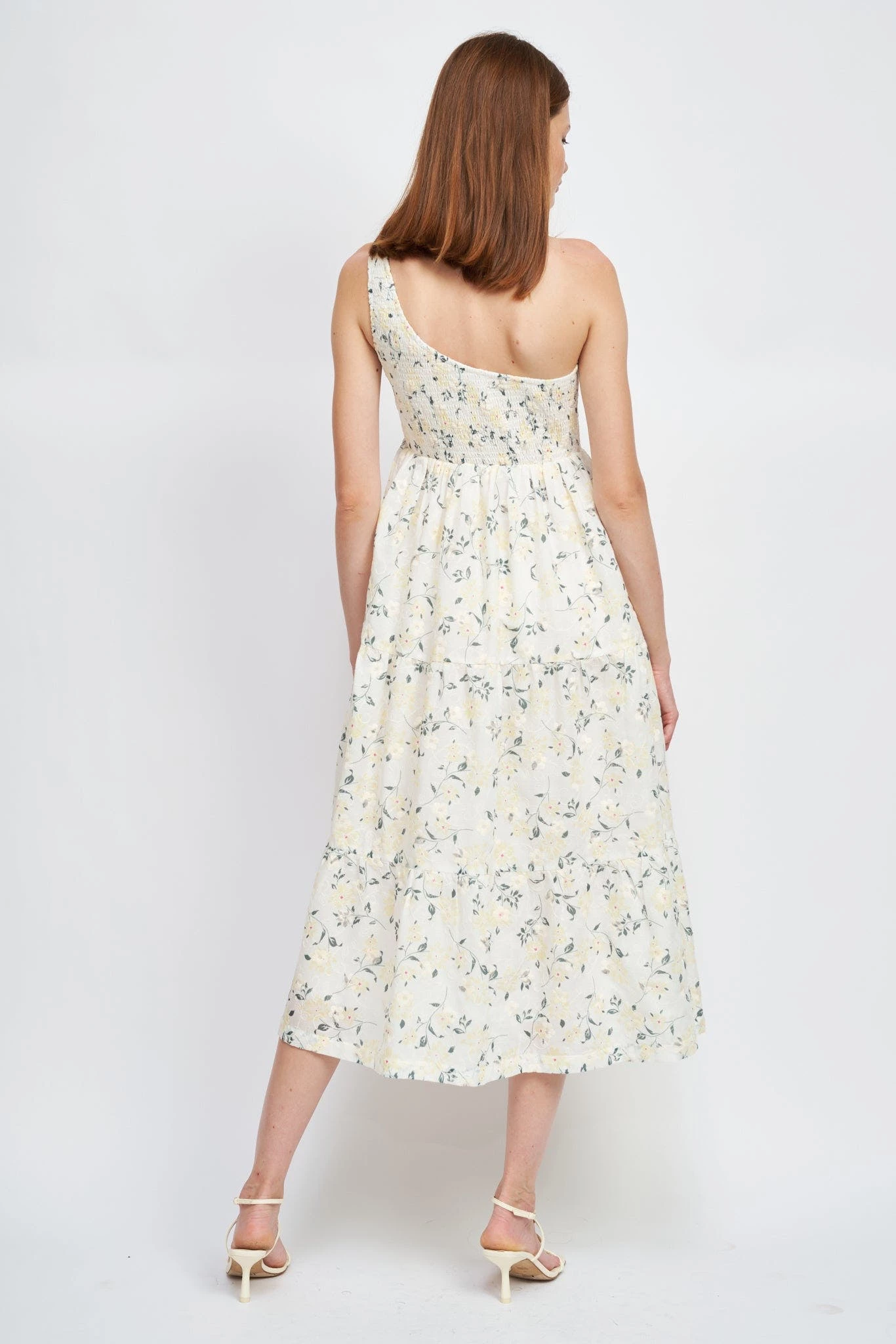 – Floral embroidered asymmetrical midi dressModel Measurement:- Model is 5’9 and wears size Small