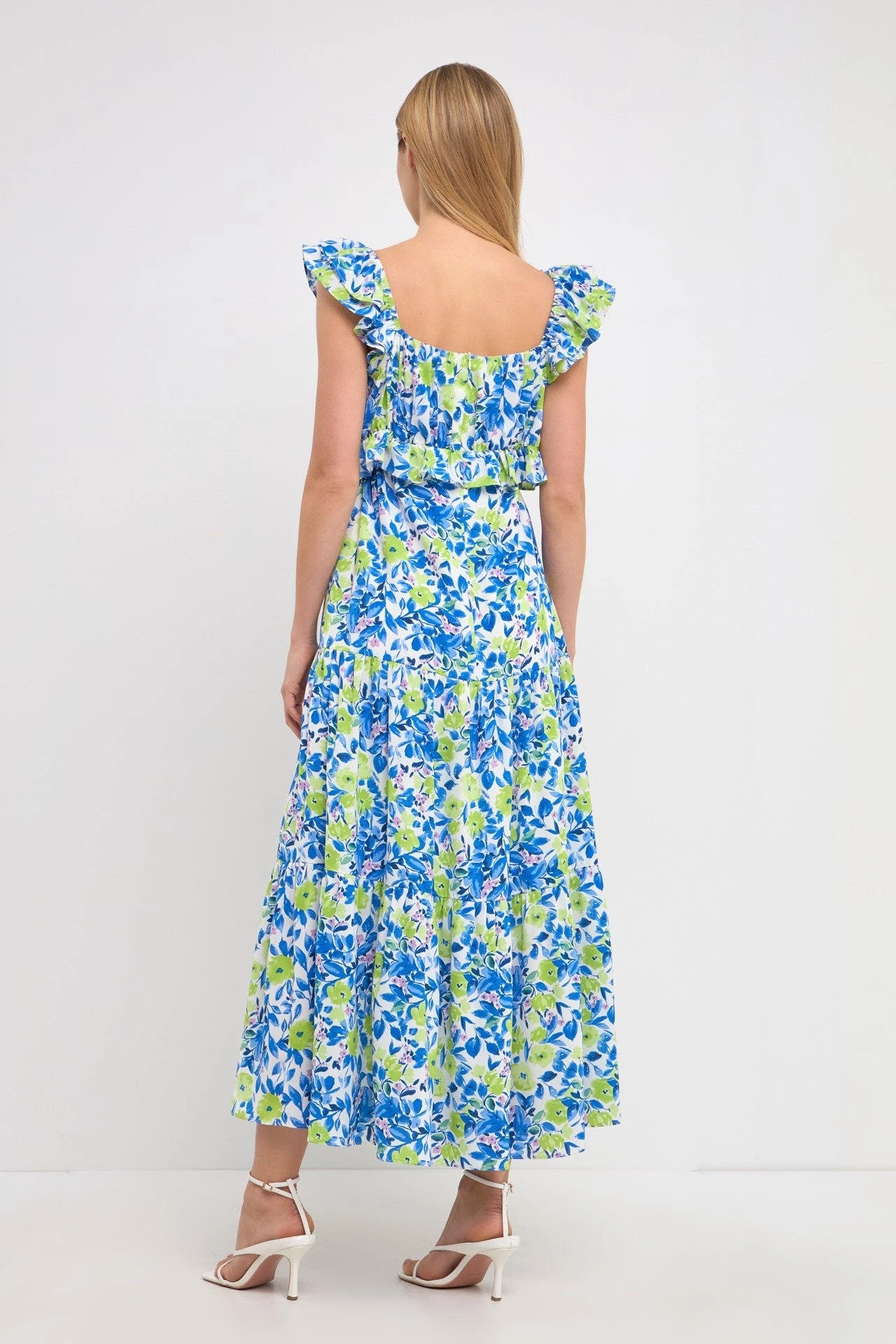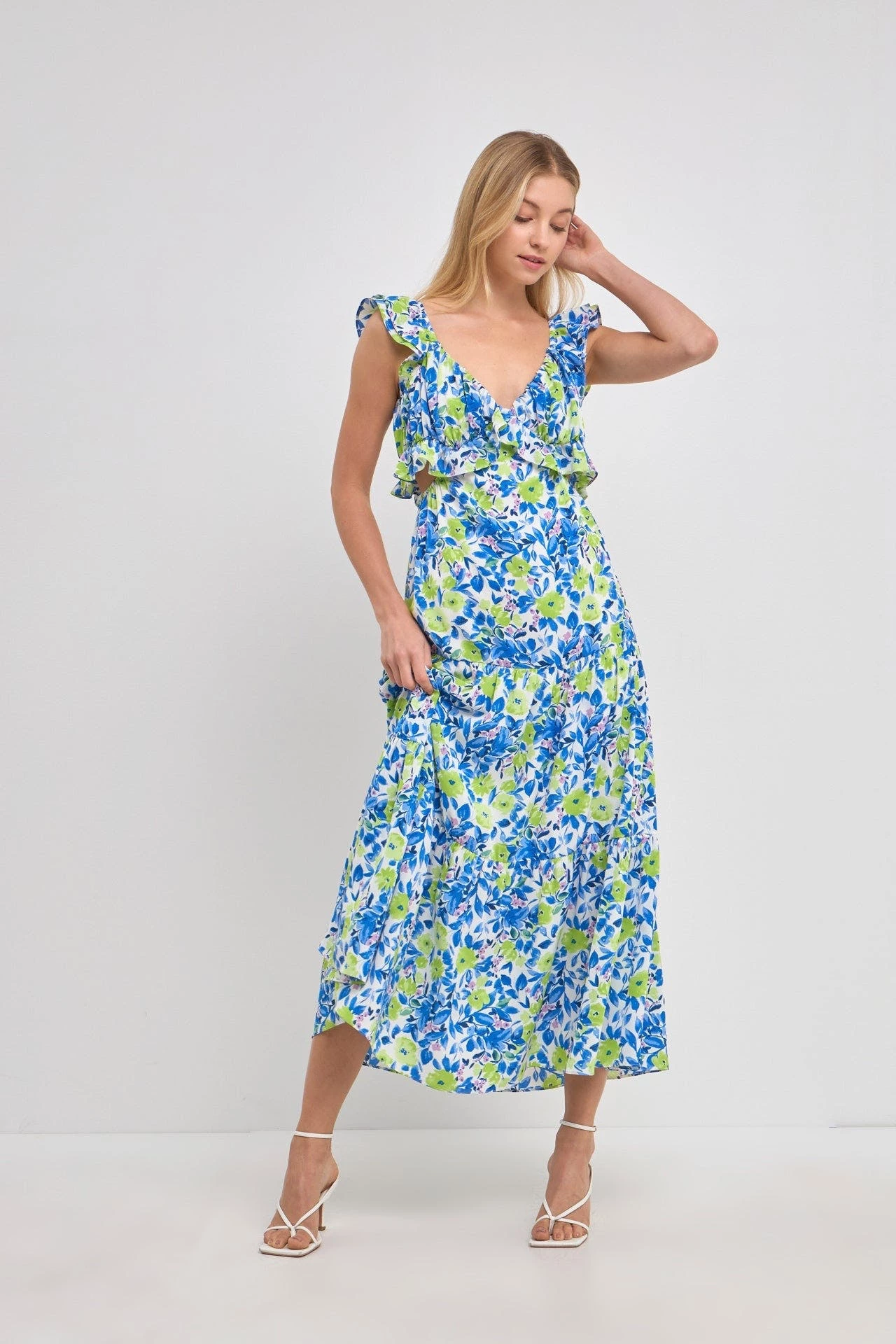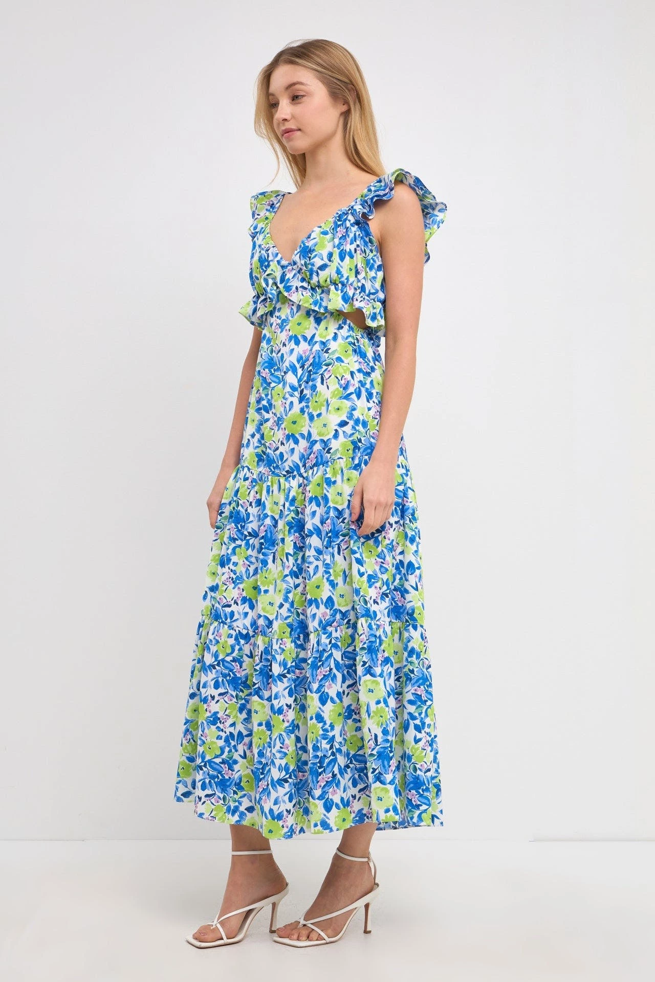 This gorgeous maxi dress is perfect for your next formal event. Featuring a v neckline, ruffled neck and waist, and a tiered skirt, this dress is sure to turn heads. The sleeveless design and center back zipper closure make it easy to get in and out of, while the maxi length gives you the coverage you need.