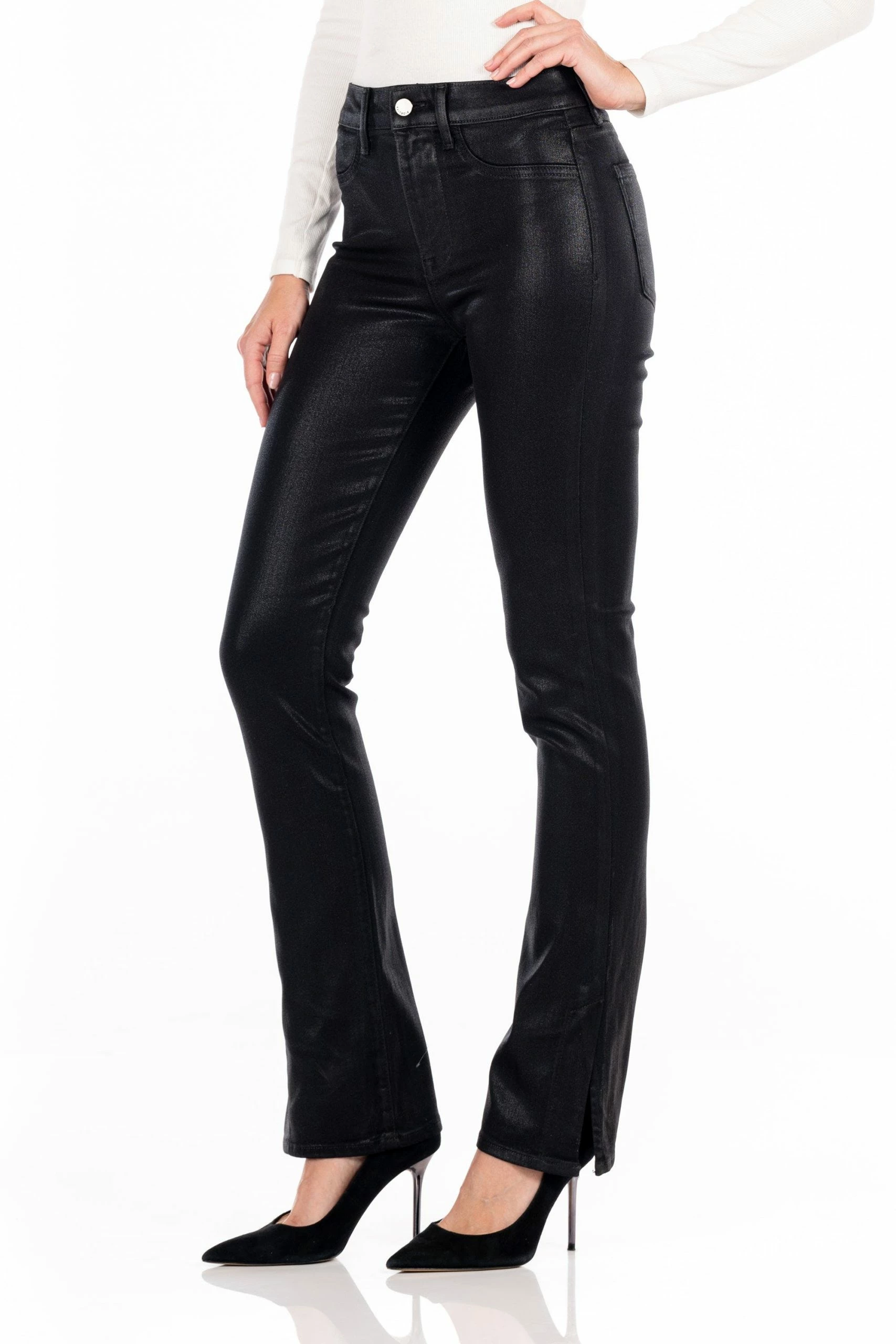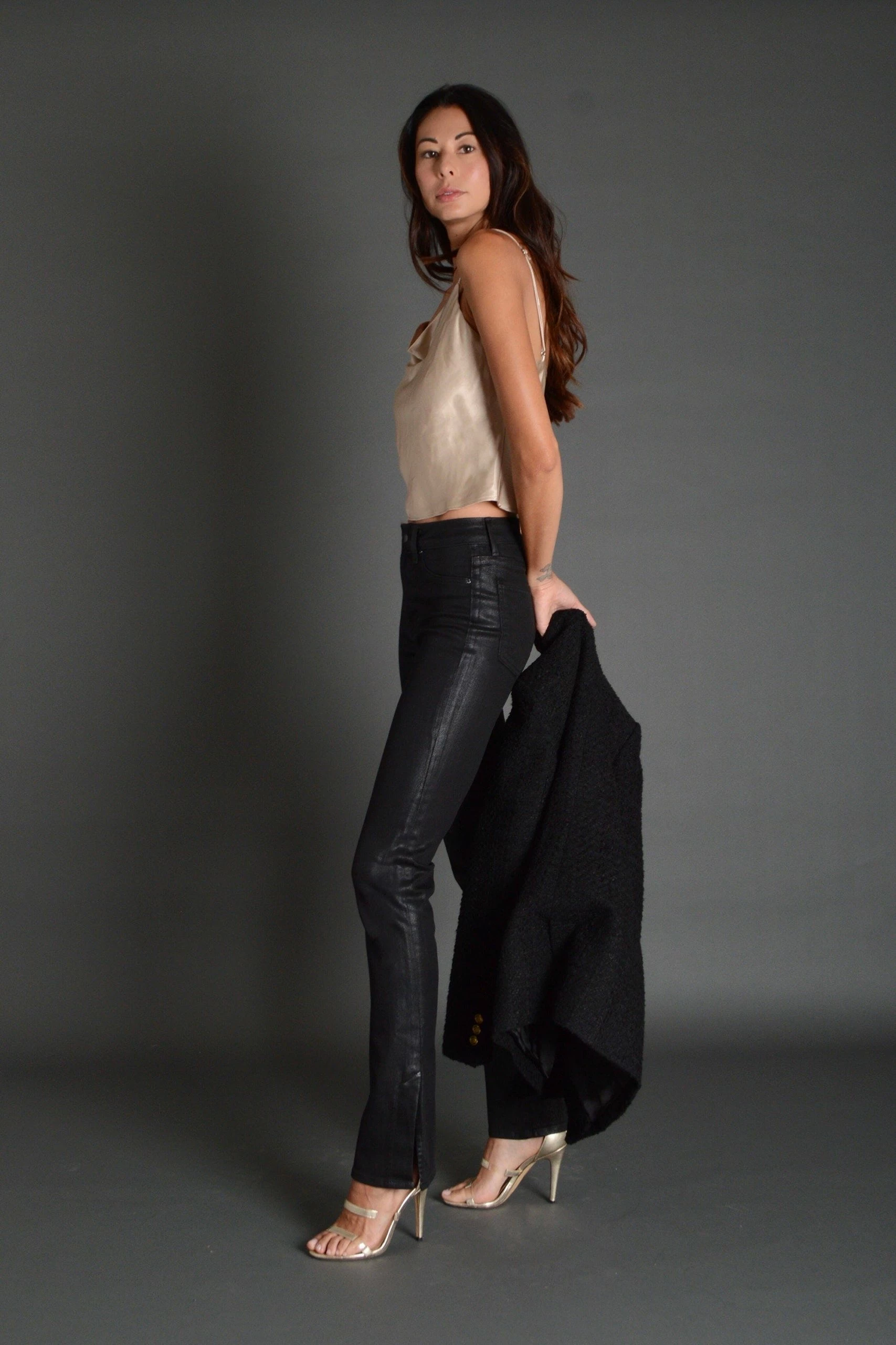 Slinky and sexy this high-rise straight is dressy and ready to party. Coated in our softest royo stretch fabric. The 7″ inch side slit at the ankle give a peek-a-boo to your shoe.