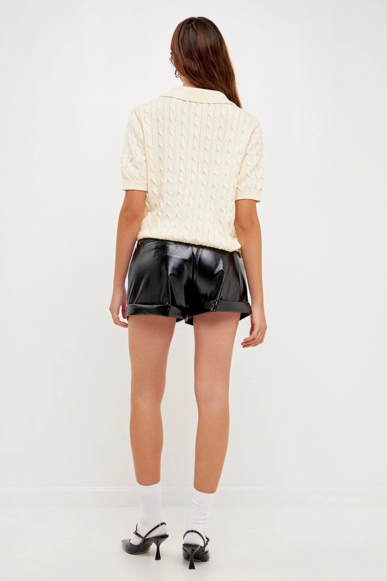 Shiny Faux Leather Shorts with front pleating.