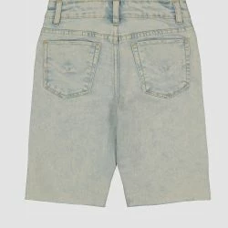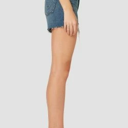 Asymmetrical front pencil skirt in medium indigo rose garden is cut at a below-the-knee length from premium comfort stretch denim with asymmetrical button closures.