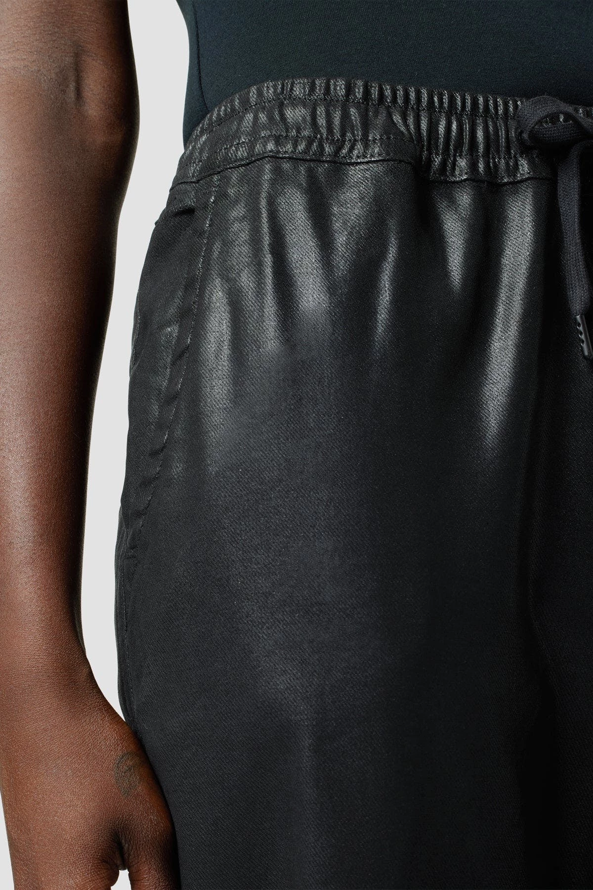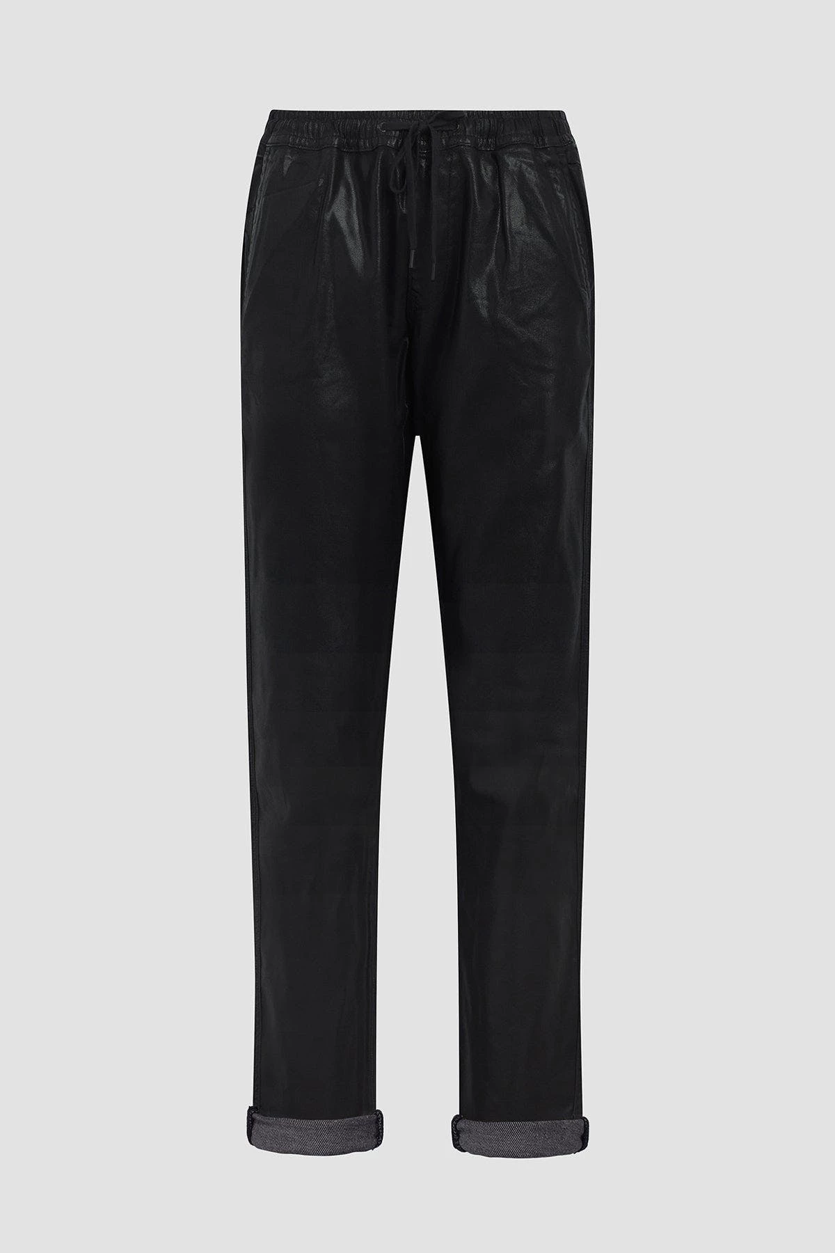 The Lounge Track Pant in Coated Black Beauty features an elastic drawstring waistband, rolled hems, and a slim fit.
