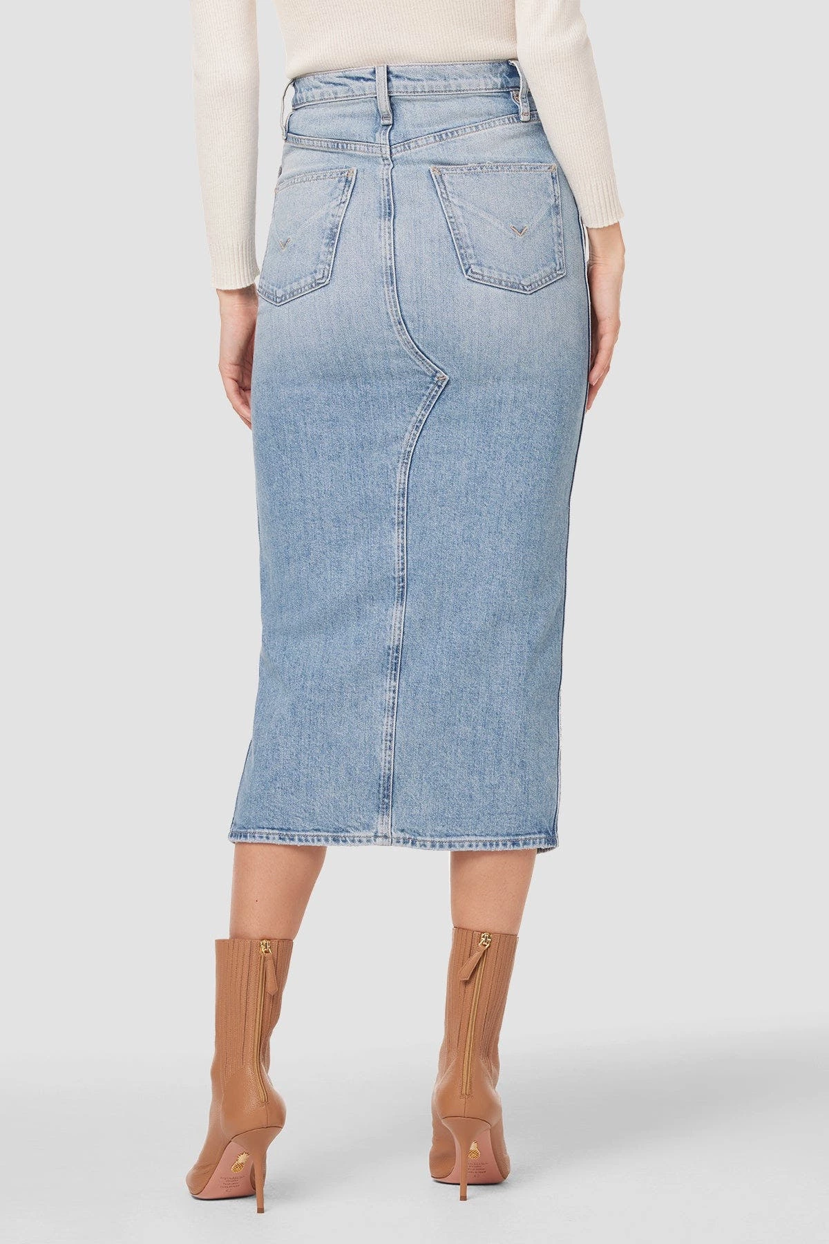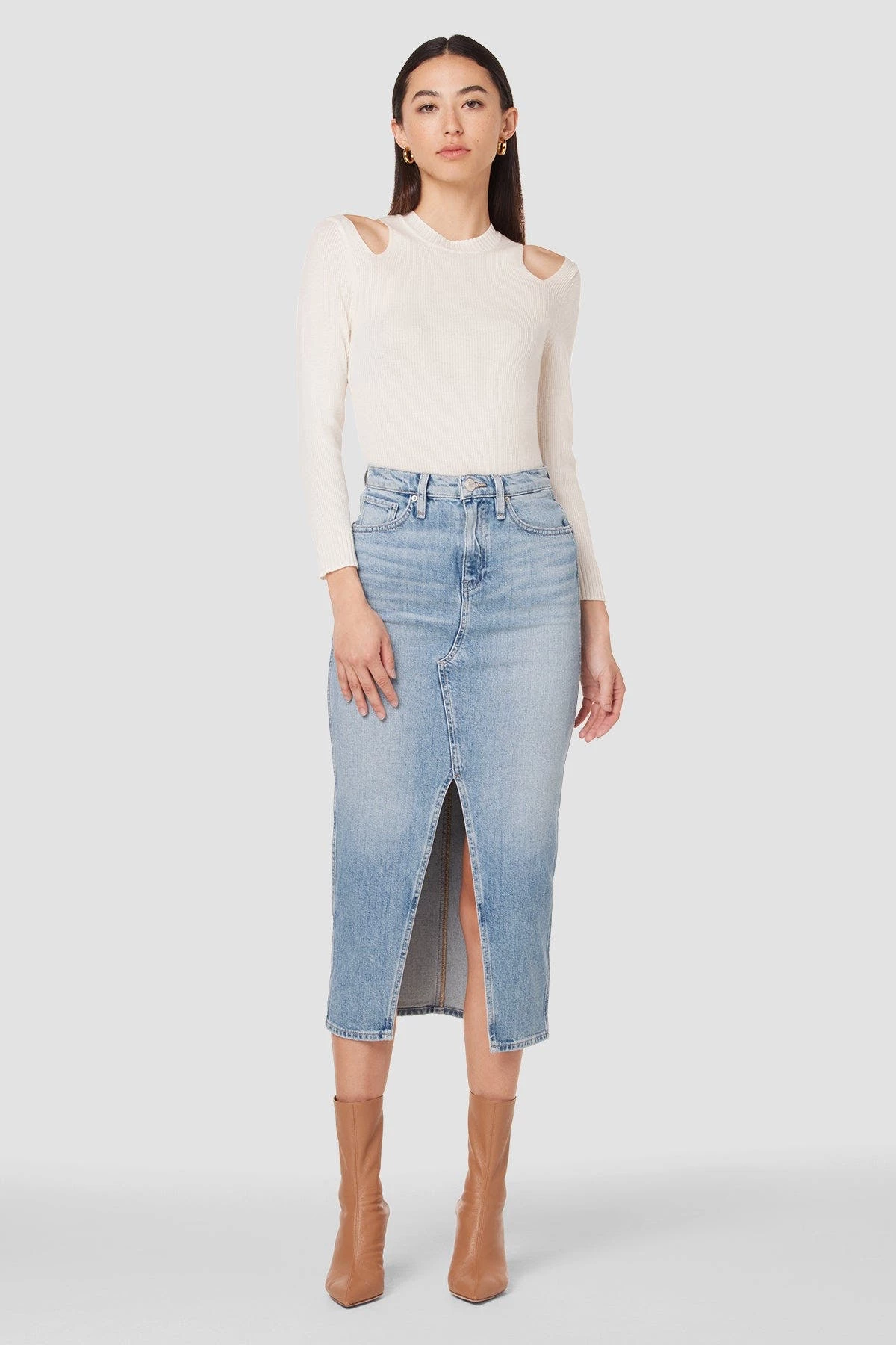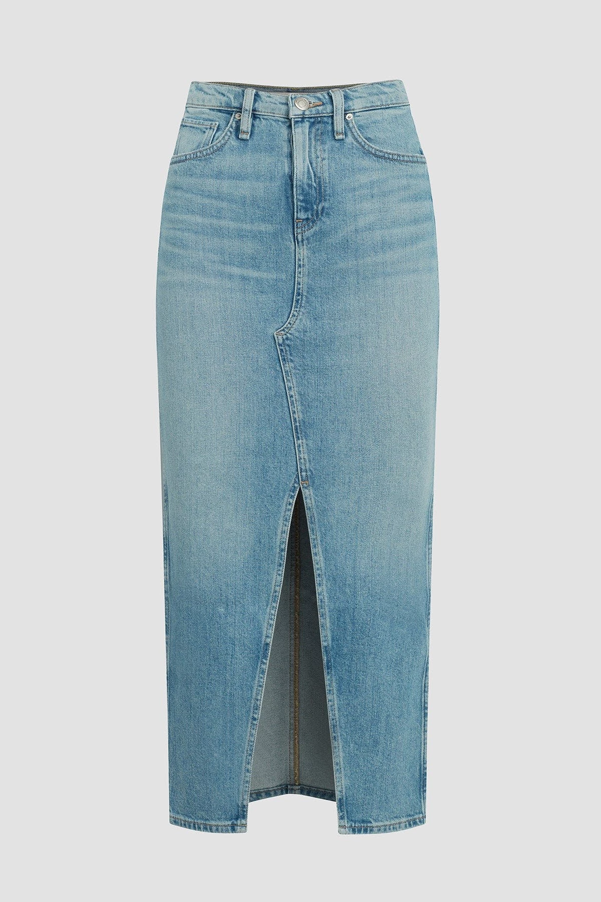 Long and sleek, this Reconstructed Skirt in Offshore is cut from premium comfort stretch denim with a high center slit and gentle fading for vintage appeal.