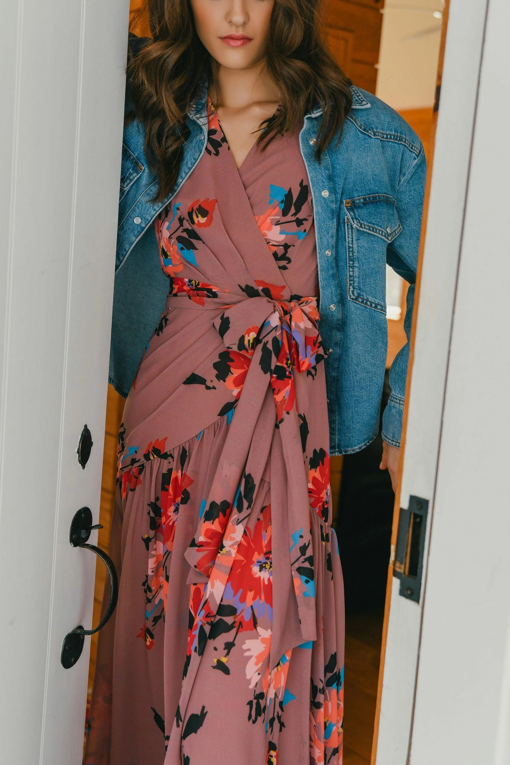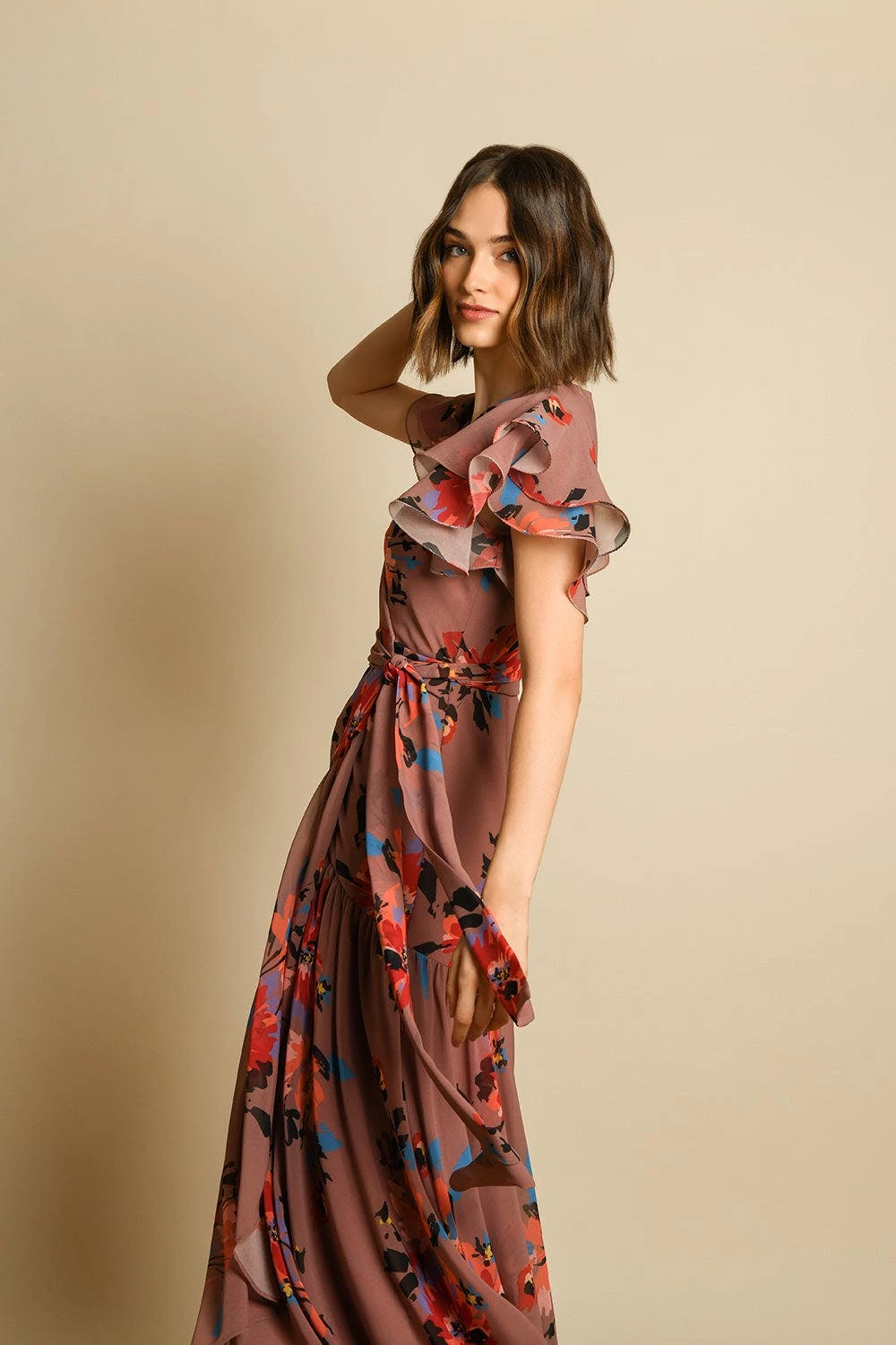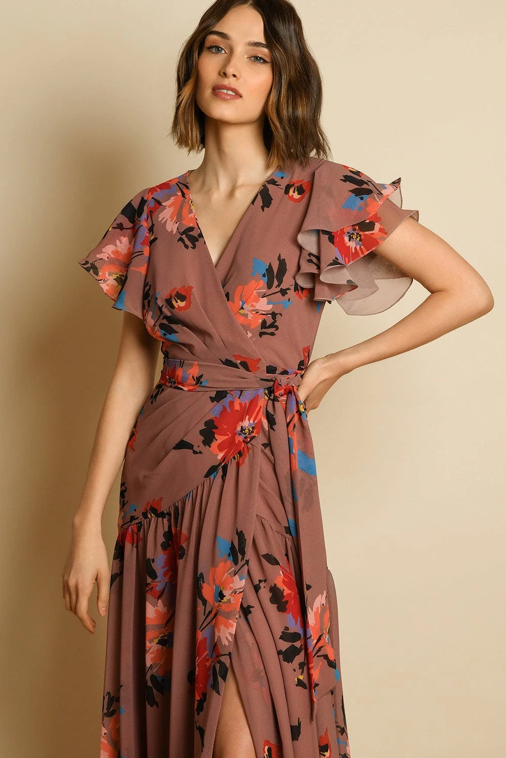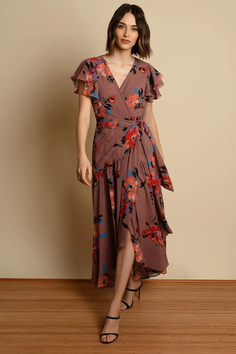 – Ruffle sheer sleeve wrap dress- Ruffle High low hem wrap silhouette- Self tie belt at waist- Taupe dramatic floral print- 46″ from HPS