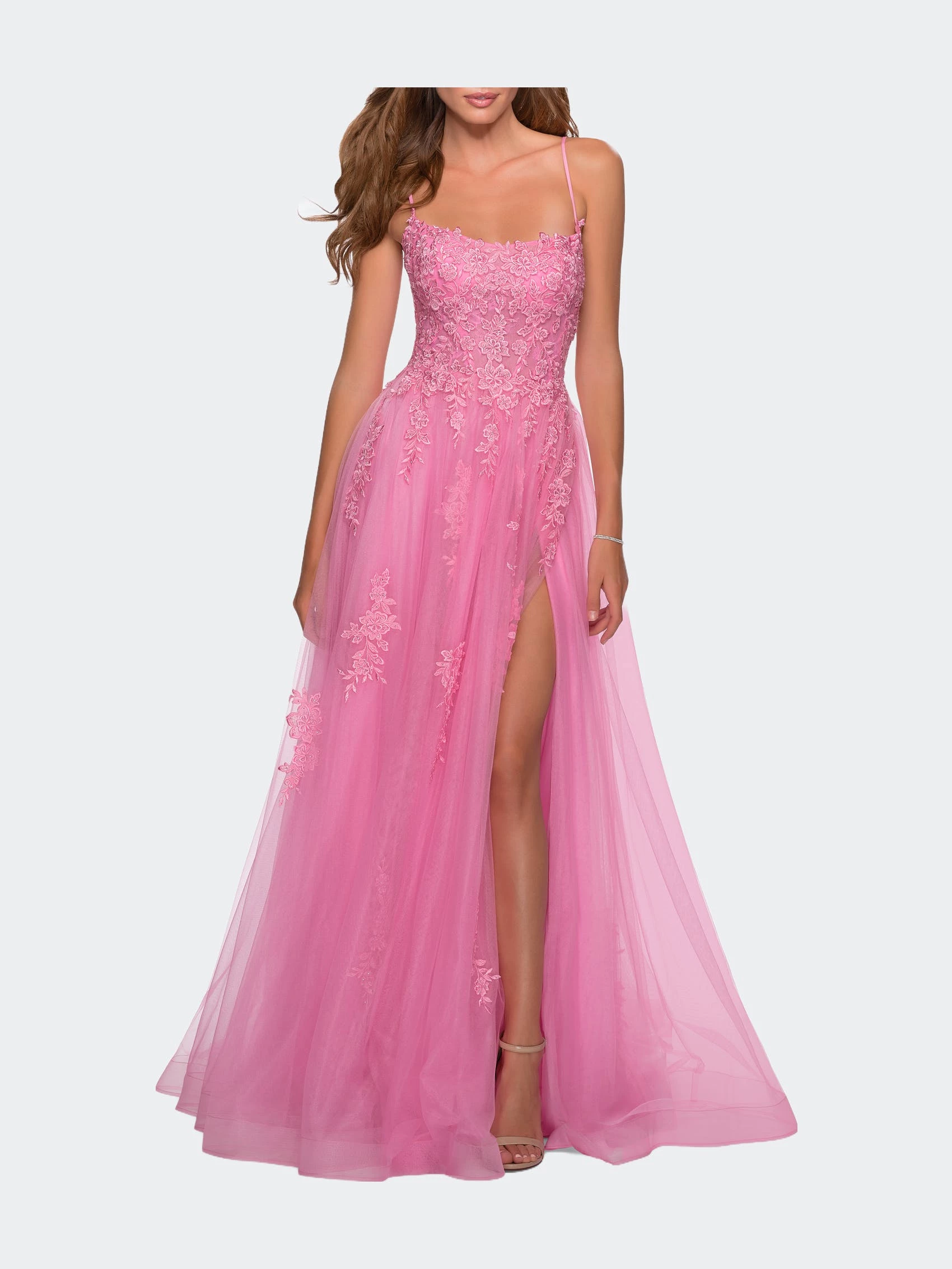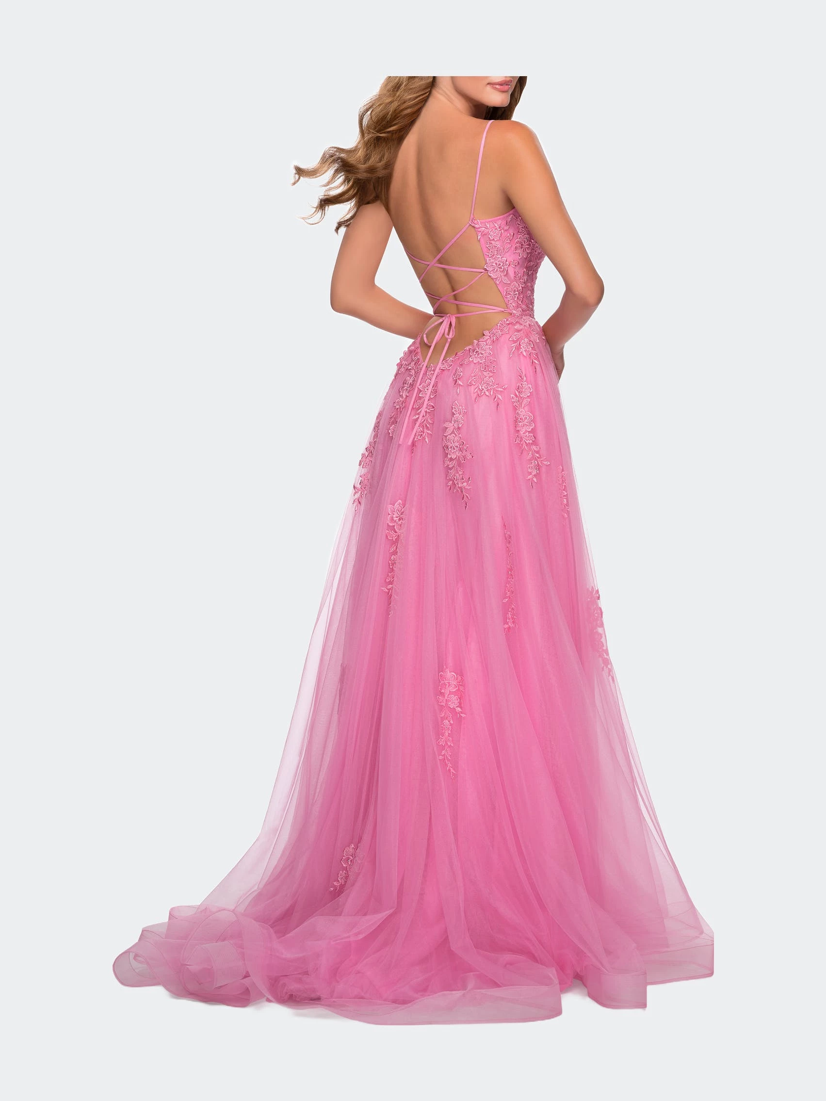 Feminine A-line tulle ball gown with gorgeous cascading floral lace appliques. Scattered rhinestones give this design added sparkle. Features a side slit and criss-cross lace up back. Back zipper closure.