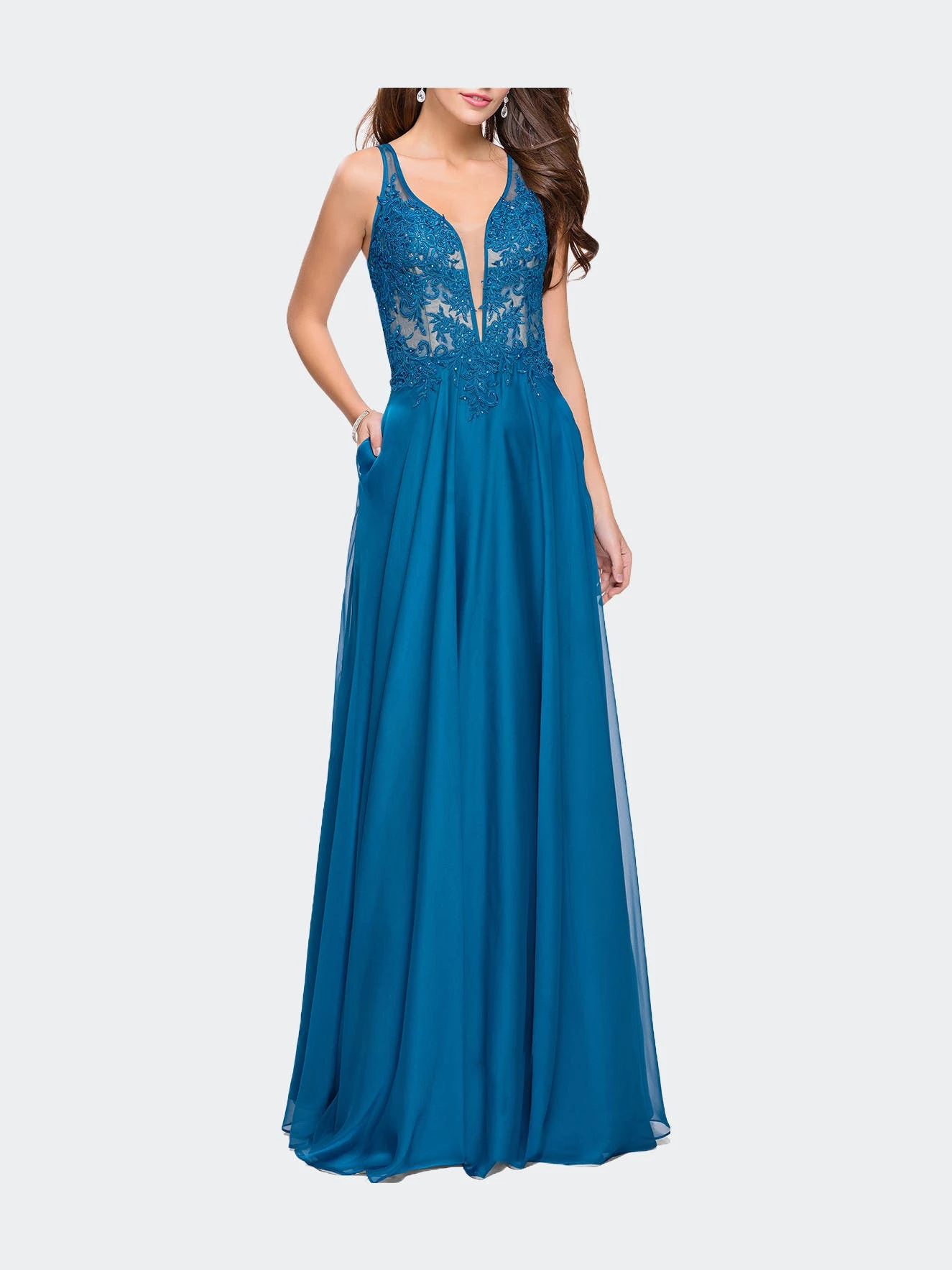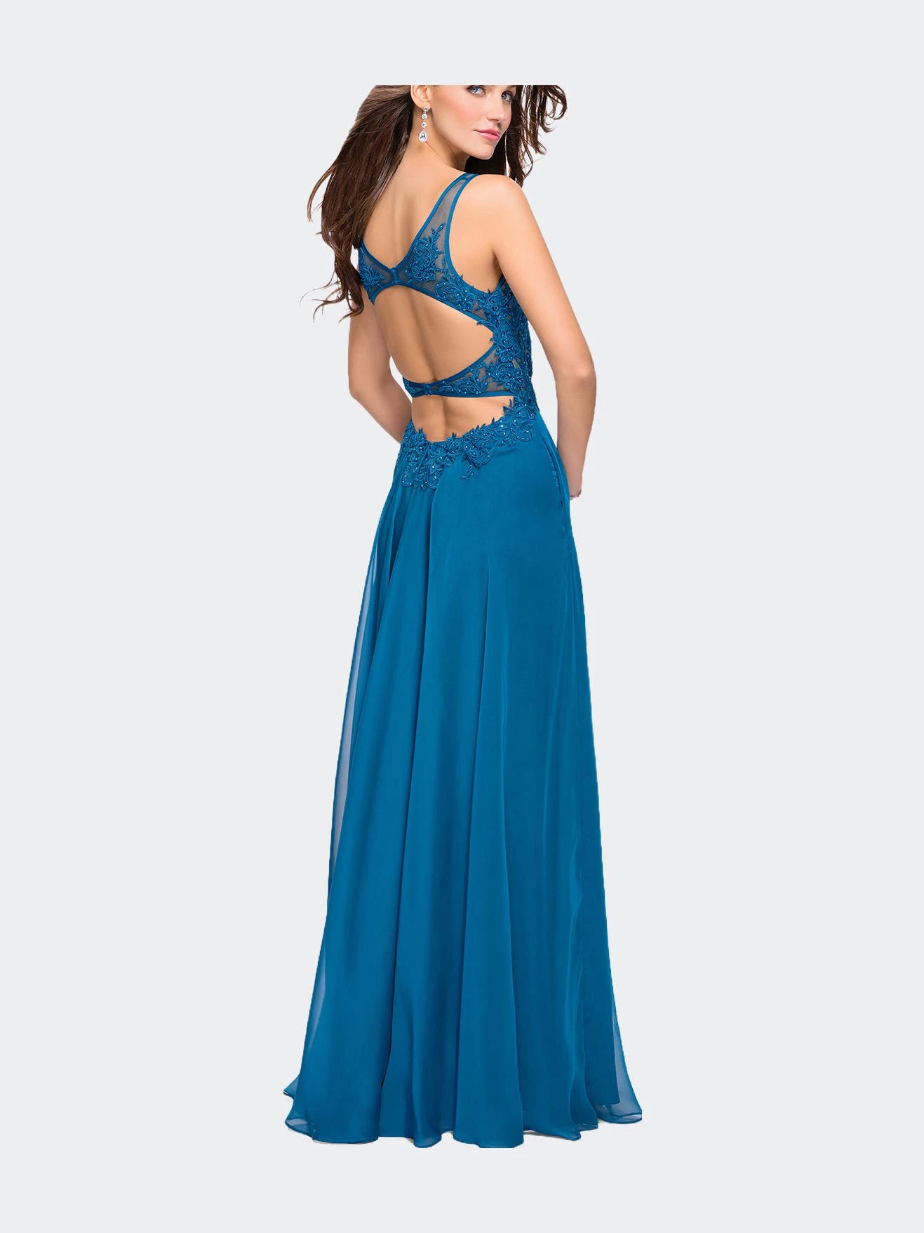 Graceful chiffon A-line dress with a beaded lace bodice and a contrasting lining. Featuring a deep V neckline and a cut out open back. Back zipper closure.