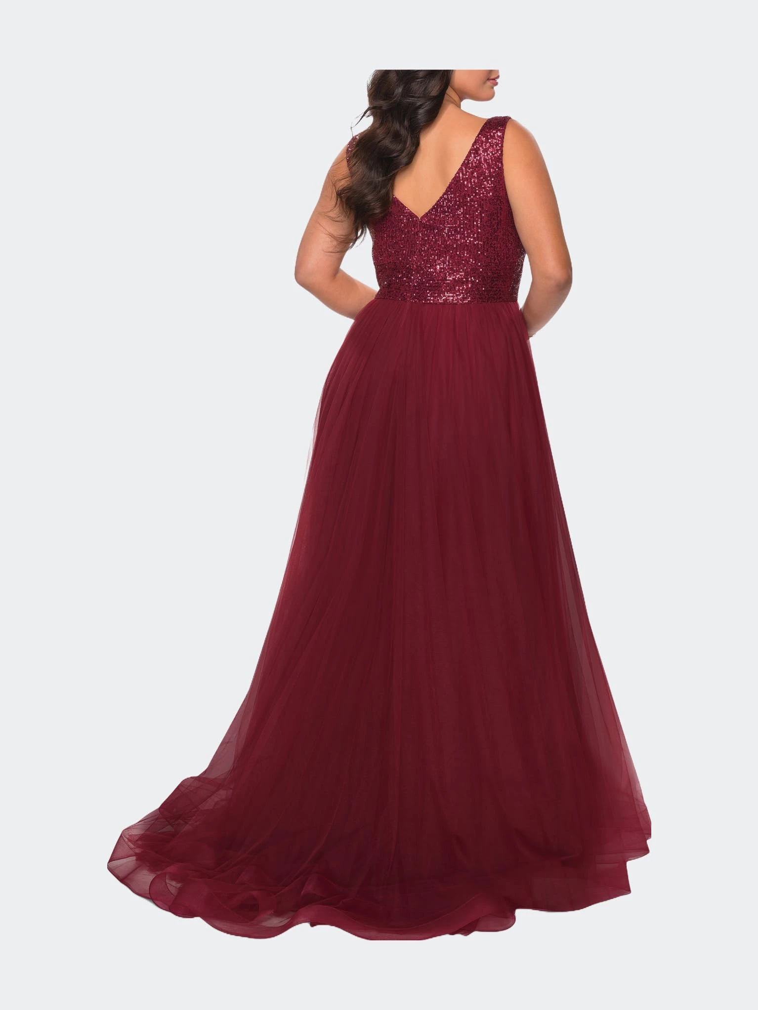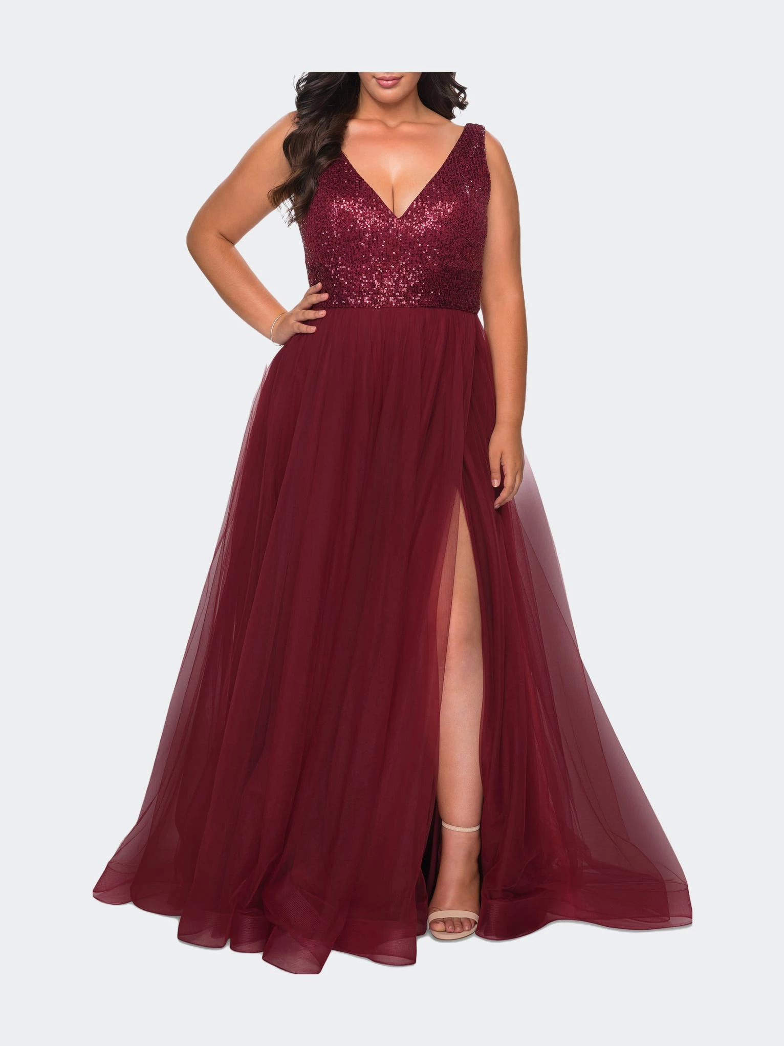 Gorgeous plus size A-line prom dress with fully sequined bodice. Features a tulle skirt with pockets and deep side leg slit. Back zipper closure.