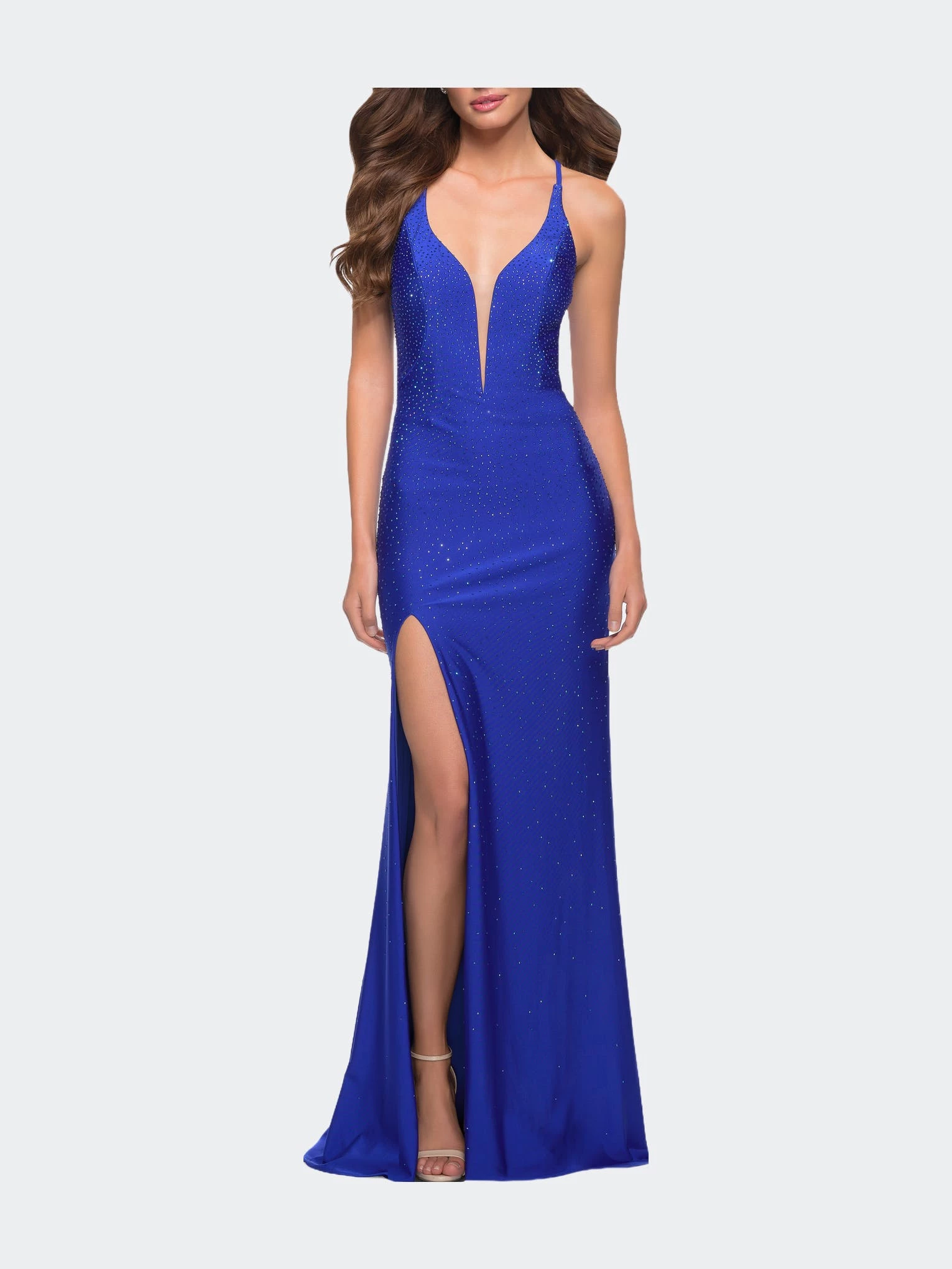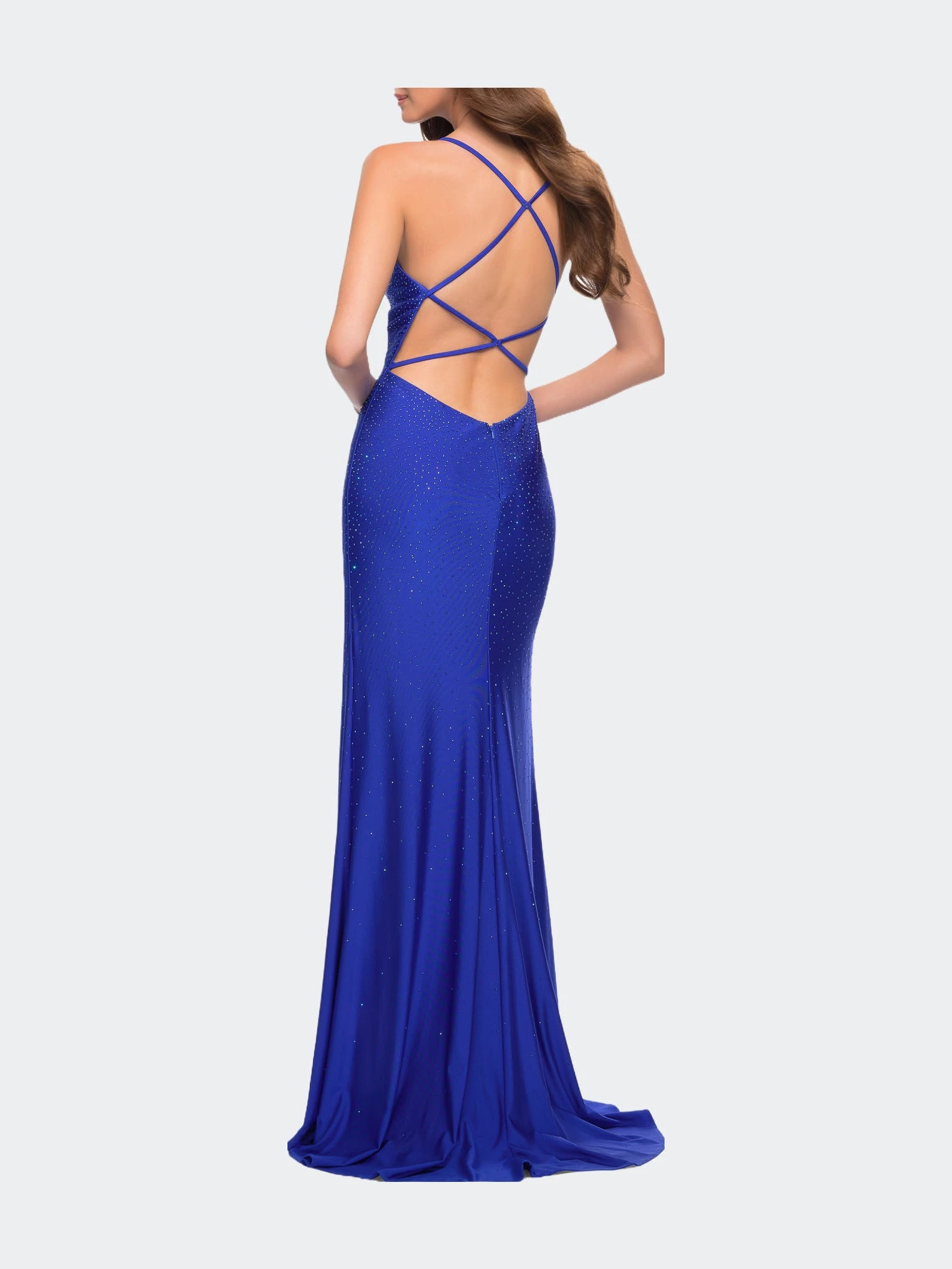 Long rhinestone jersey gown with deep illusion V neckline and front side leg slit. Open back with criss-cross straps. Back zipper closure.