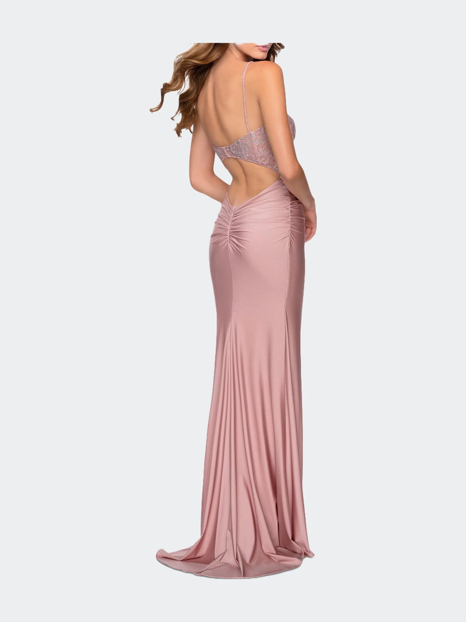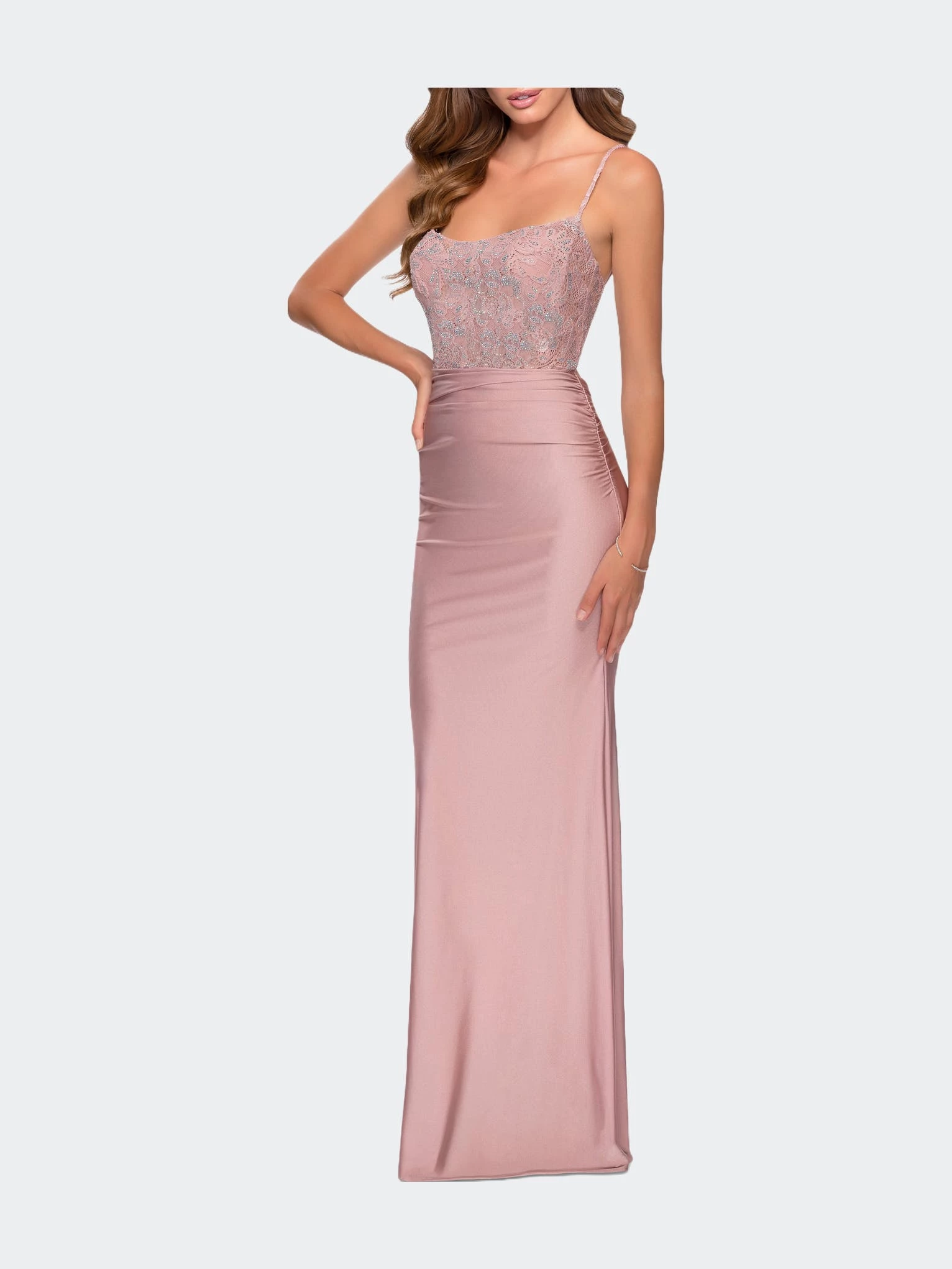 Trendy jersey prom dress with light ruching on the skirt. This dress features a lace bodice with rhinestone detailing. A scoop neck and open keyhole back complete the look. Back zipper closure.