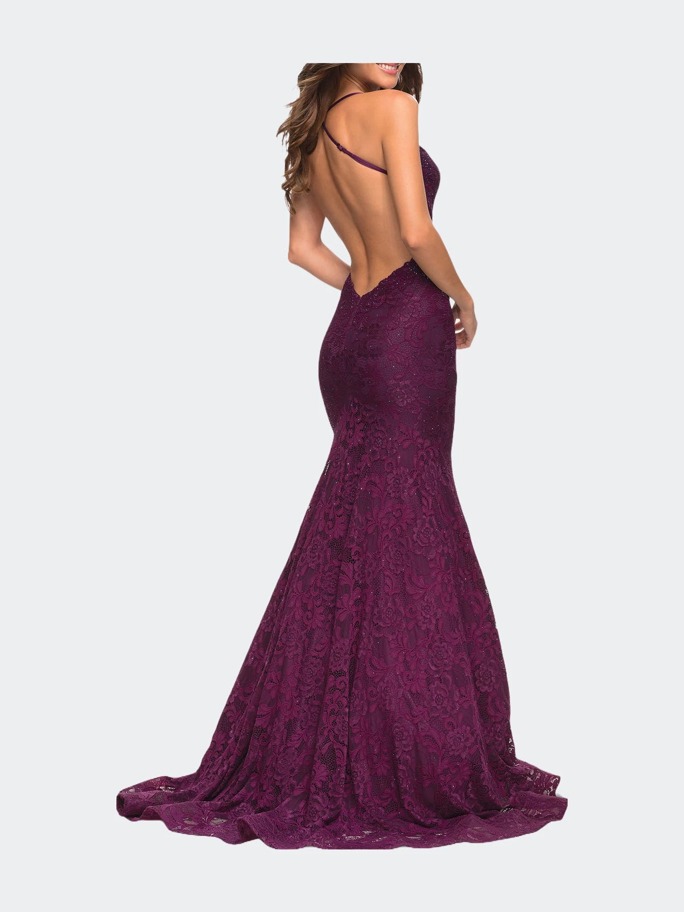 Mermaid stretch lace gown with illusion waist. Neckline is modified square shaped and back is open. Back zipper closure.