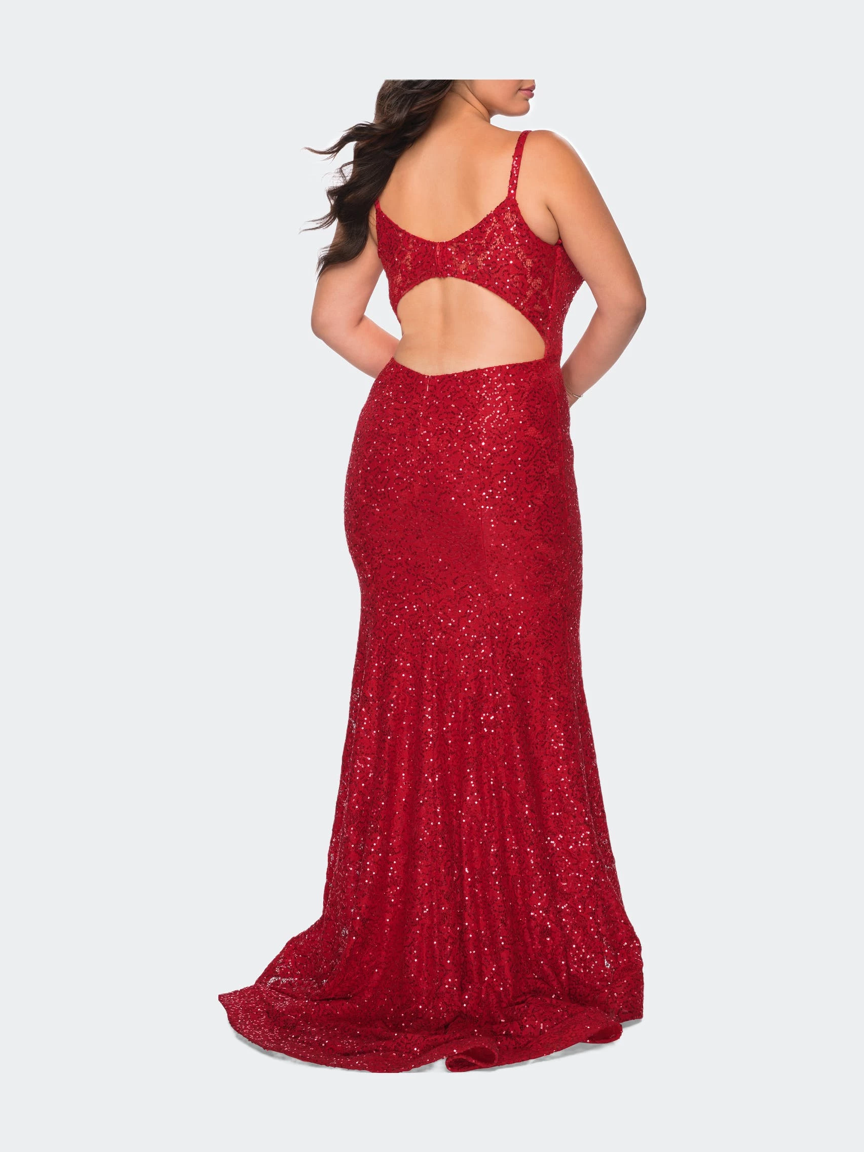 Floor length sequin plus size gown with faux wrap ruched bodice and plunging neckline. A cut out open back completes the look. Back zipper closure.