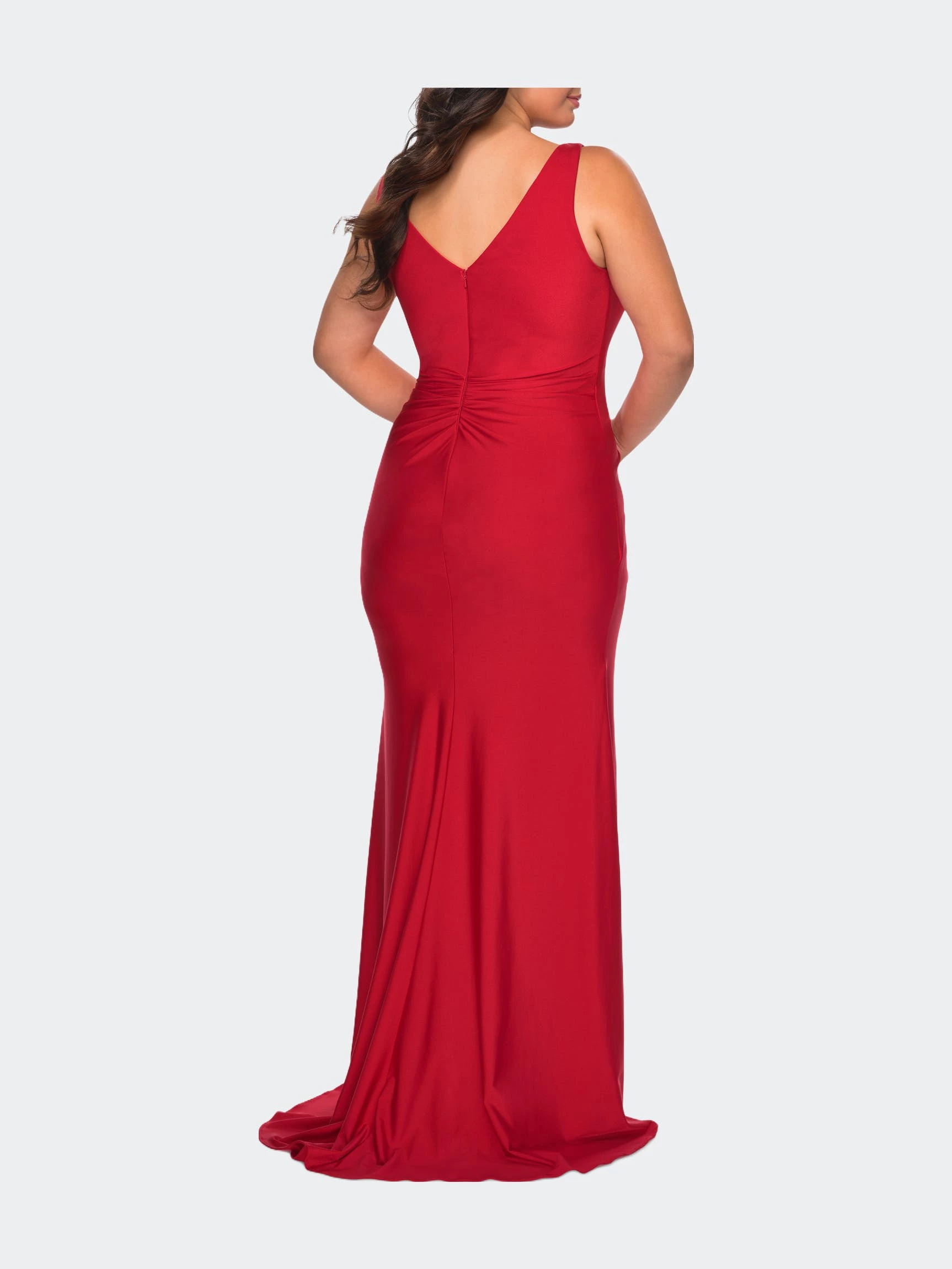 Ruched jersey plus size prom dress with flattering V-neckline and sultry side leg slit. Back zipper closure.