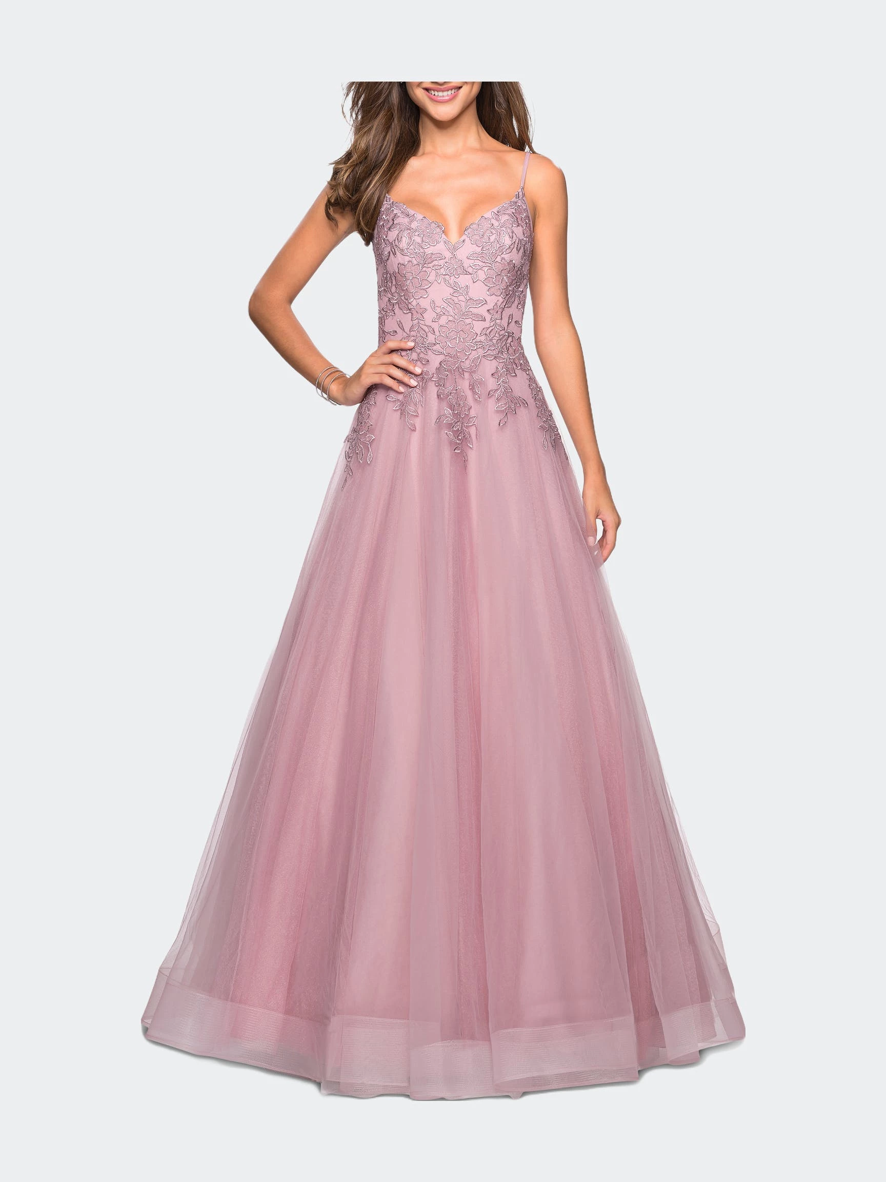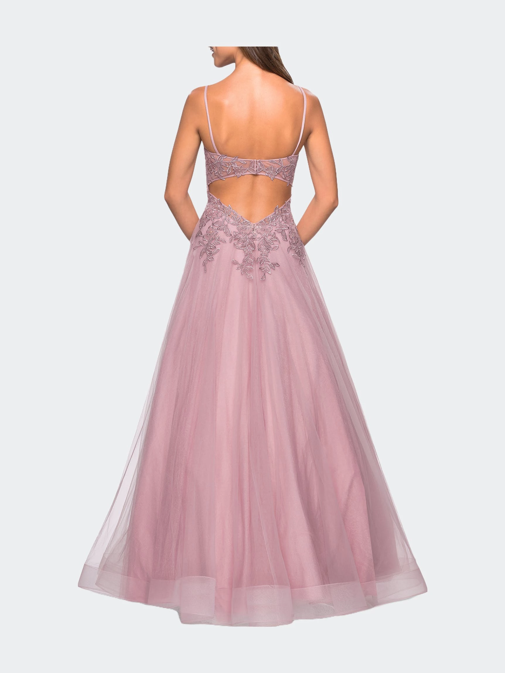 Feminine tulle prom dress with floral embellished bodice. Features a V shaped neckline and rhinestone detailing. A simple cut out back and pockets complete the look. Back zipper closure.