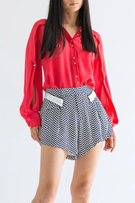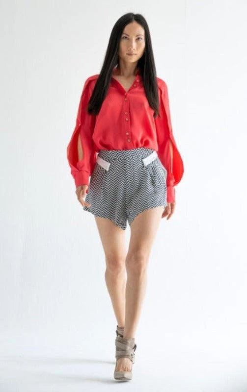 Not your average short, the Adros was made to lengthen your legs and display a little pop of style. This chevron short is made in upcycled silk georgette that delicately brushes against your skin while wearing. Treat this print as a neutral and pair them with any of Thalia camis or Santo blouses.