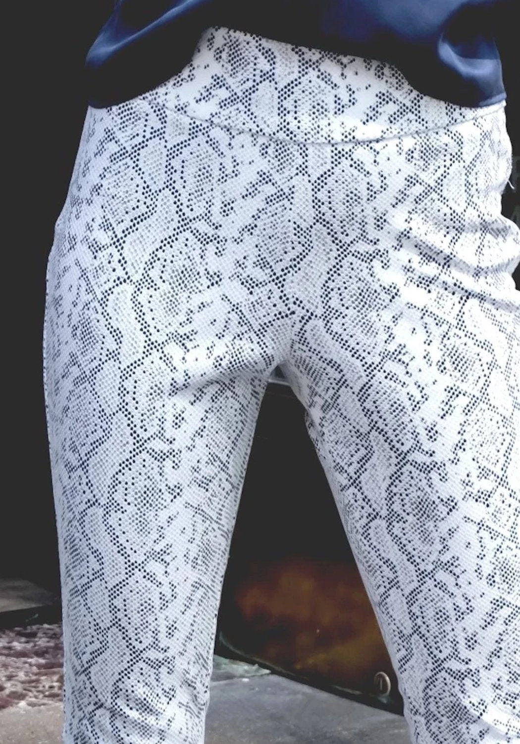 Sleek and chic is the motto of the Larson white snake skinny pant. The high-waist means you can dress it up or down with any style top, and the stretch cotton has the perfect amount of sheen with the snake print. Larson white snake skinny pant has a shiny gold metal zipper that runs down the side of the leg and adds the perfect amount of detail.