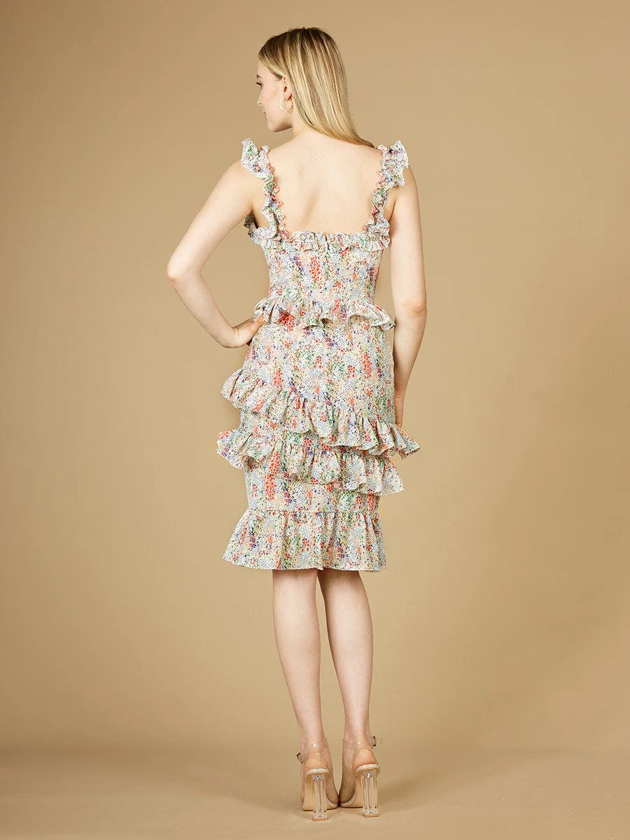 Another one. We’ve been working on this printed collection for so many months and we’re able to reveal them. This midi length ruffled print dress features thin straps and a high neck. The sheath skirt has asymmetrical ruffles and features coverage and a classy look. Perfect for a fancy lunch or daytime wedding event.