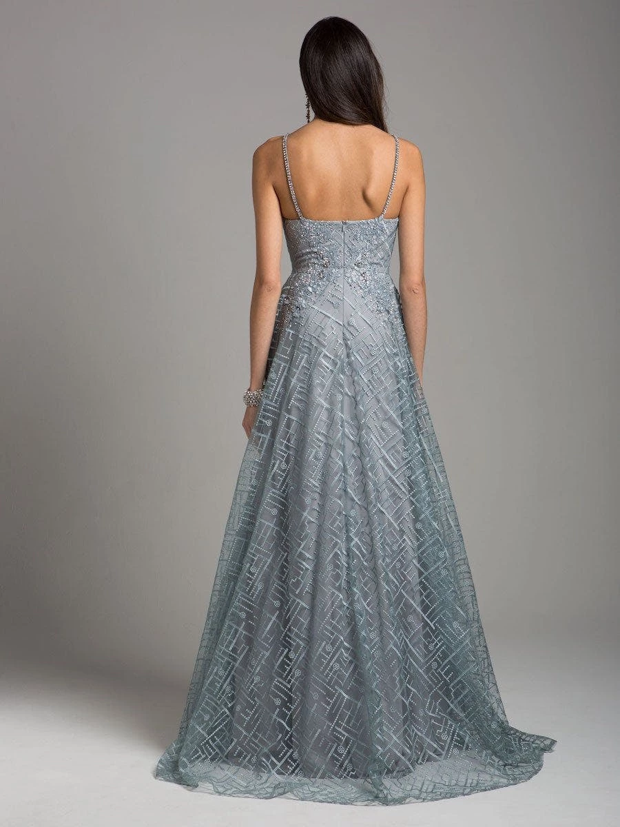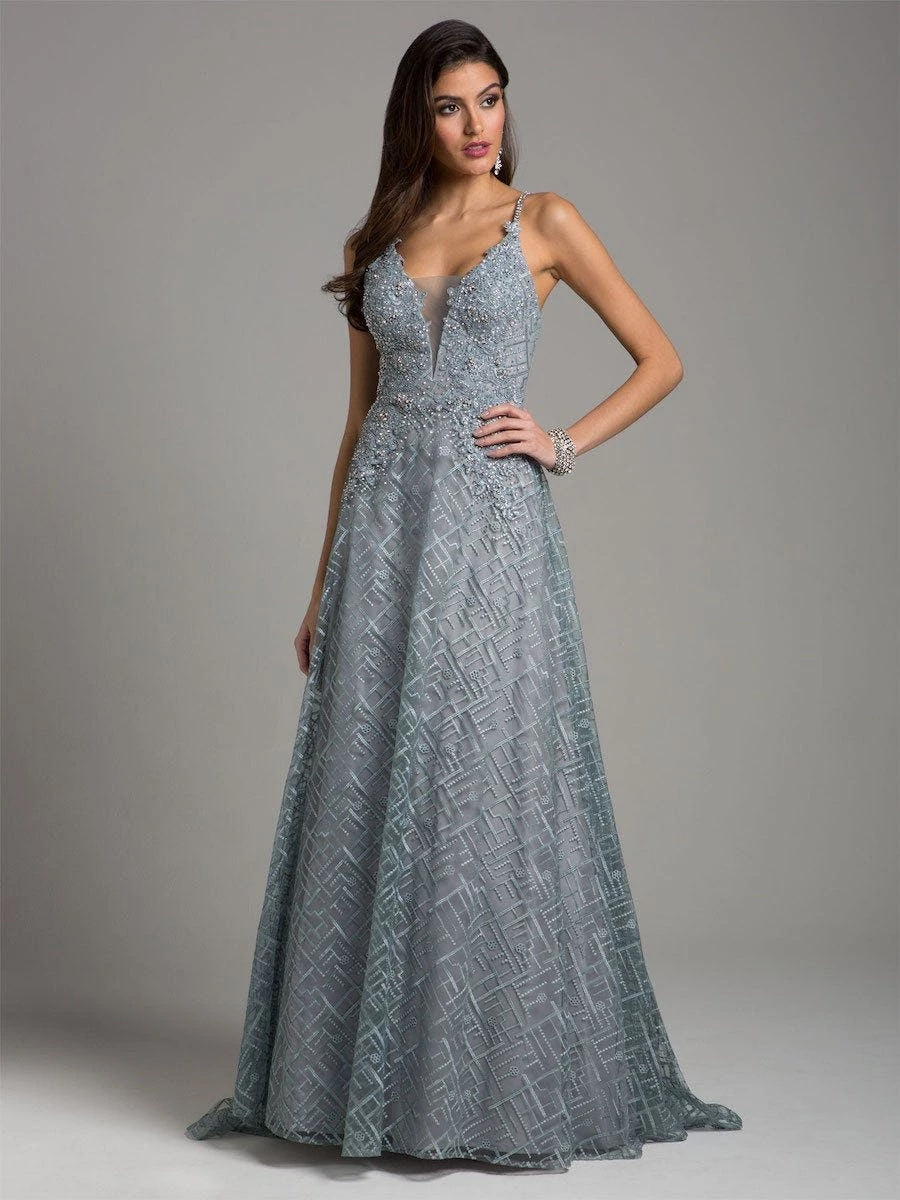 Shine like a star with this beautiful slate color ballgown made of lace fabric embellished with the intricate beads stones and lace appliques. It has a v neck with strap shoulders.