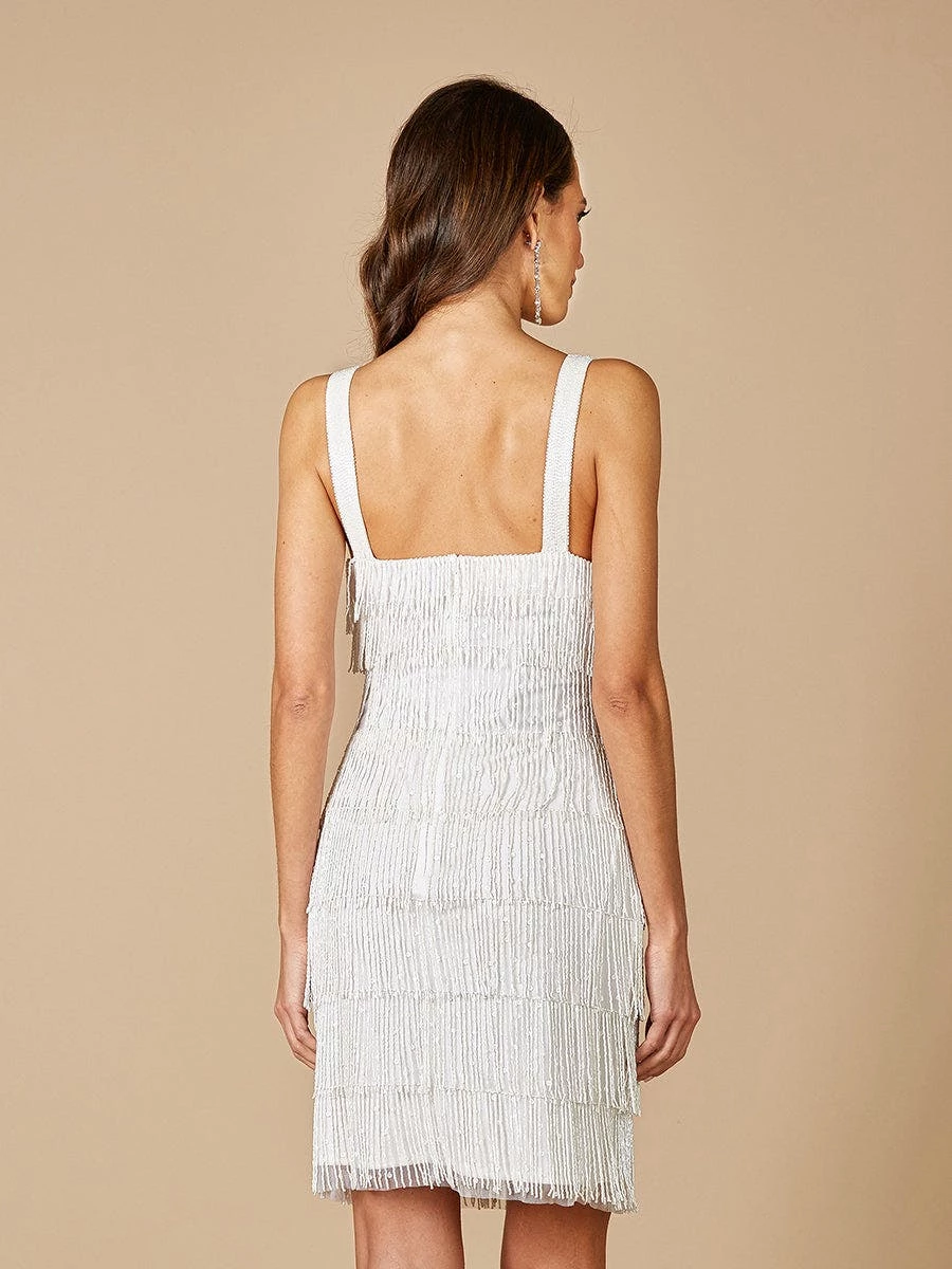 Sleeveless straight neckline fitted short dress completely adorned with beaded fringes in layers. The thicker strap provides comfort and stability. One of the favorite dresses for a bridal event.
