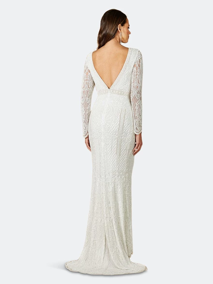Beaded v-neckline sheath gown. The gown features long beaded sleeve detail with low back and plunging front neckline.