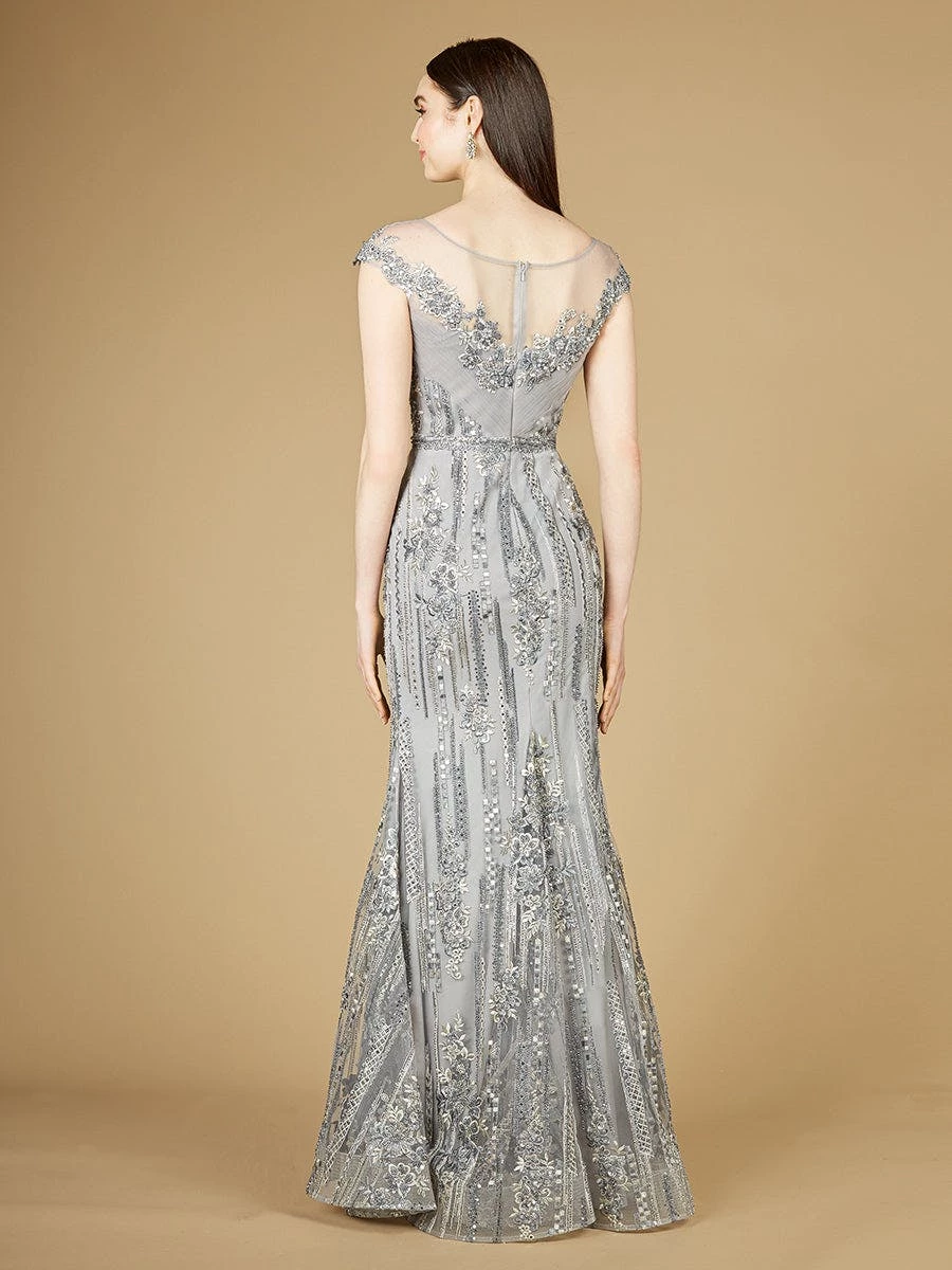 Glittering mermaid lace gown with an illusion high neckline and embellished bodice. This gown features cap sleeves and beading throughout. Perfect for someone who wants an elegant style with an ethereal look. Where this to any black-tie event which could also work for a mother of the bride or groom.
