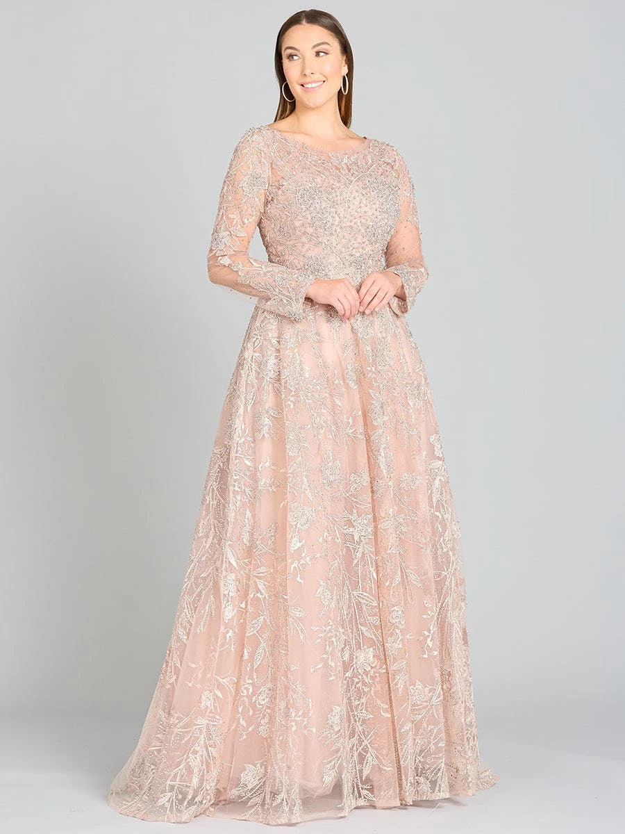 A shimmering lace ball gown with long sleeves and an illusion neckline featuring a gorgeous lace embroidered pattern and sheer long sleeves which are also embroidered. You get the best of both worlds, a dress that stands out in modesty and features the glamourous details for a fancy event.