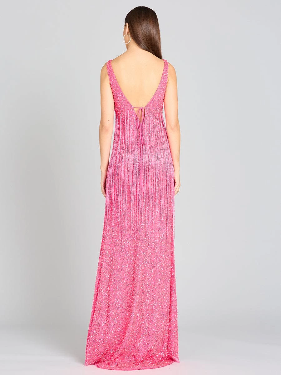 launches this sexy V-neck dress with beaded fringe and sequins all over. Features a circular cutout in the bodice, a low back and a front slit.