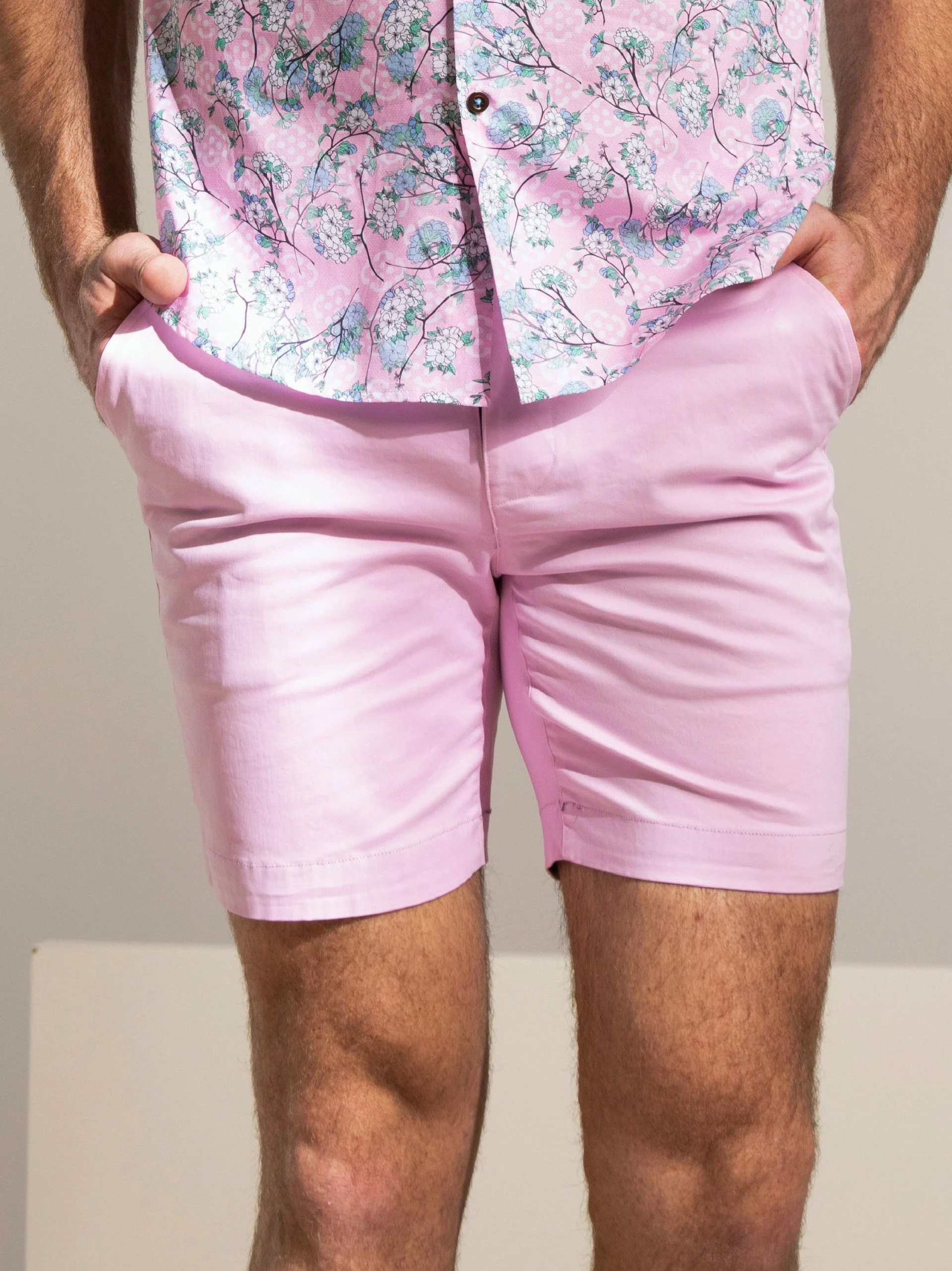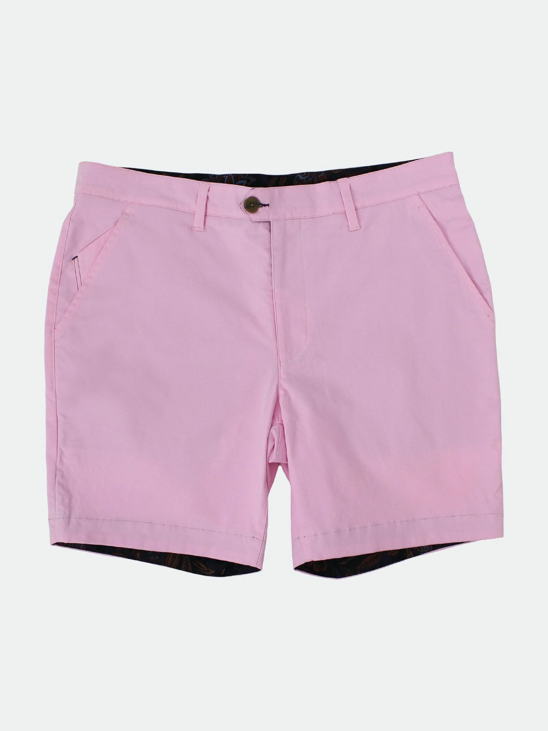 Washed stretch peached cotton short with printed contrast interior.7 inch inseam
