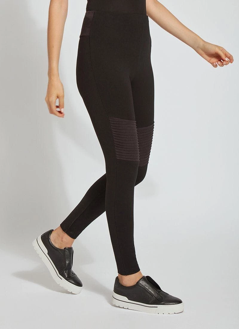 The Bonfire Moto Legging, crafted from 4-way stretch Ponte, showcases strategic seaming below the knee and Faux Suede pin tuck detailing above. Edgy and urban, these Black leggings offer a flattering, concealed patented waistband and Faux Suede back yoke. Wear them with a legging-friendly top and black lace-up boots.