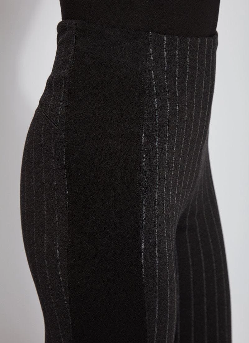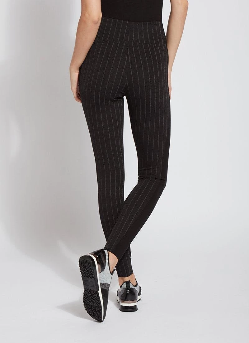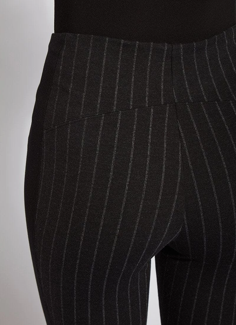 Showcase these urban-inspired ponte jacquard leggings for everything from errand running to enjoying coffee with friends. The timeless striped laura legging pattern, in black slub, features a concealed patented waistband that smooths and shapes; body-hugging comfort for all-day wear and anatomical seaming for rear contouring and lift. Side stripe detailing adds to their elevated, yet athletic feel. Created using a tightly woven ponte jacquard, these work or leisure leggings feel snugger than a ponte version, so size up if you’re between sizes. Sport them with the white eco satin shirt, faux suede bomber jacket and heeled ankle boots.