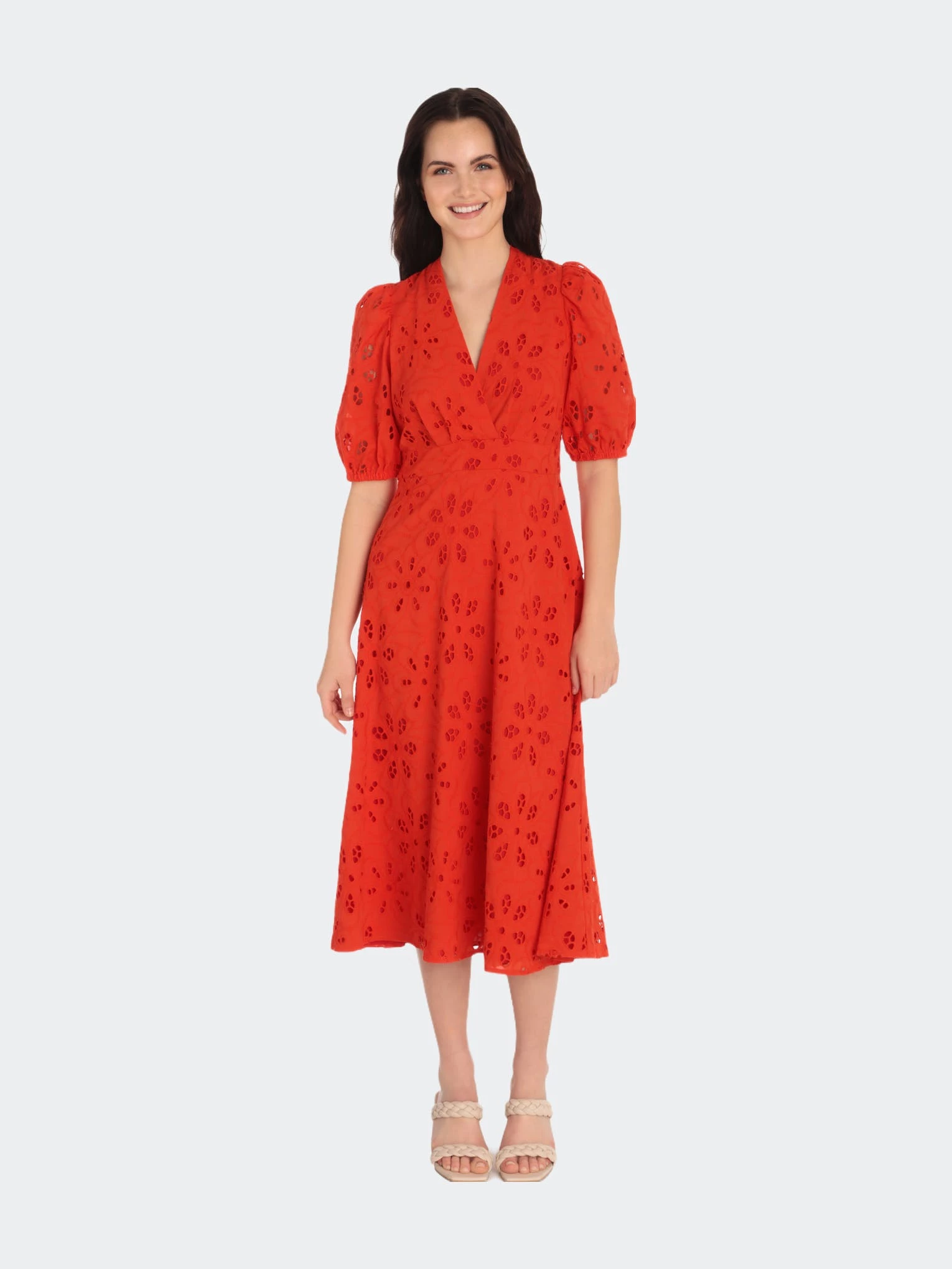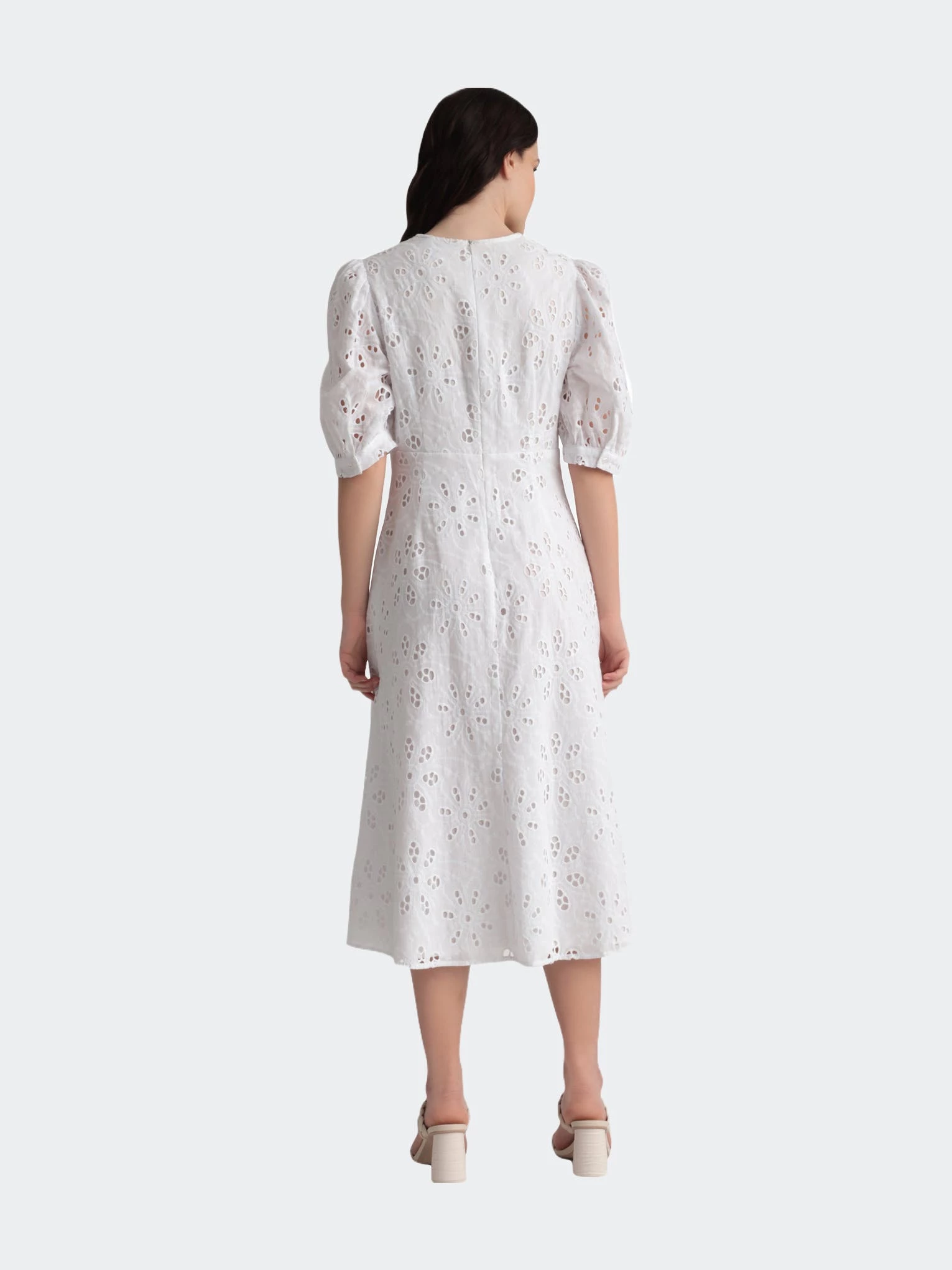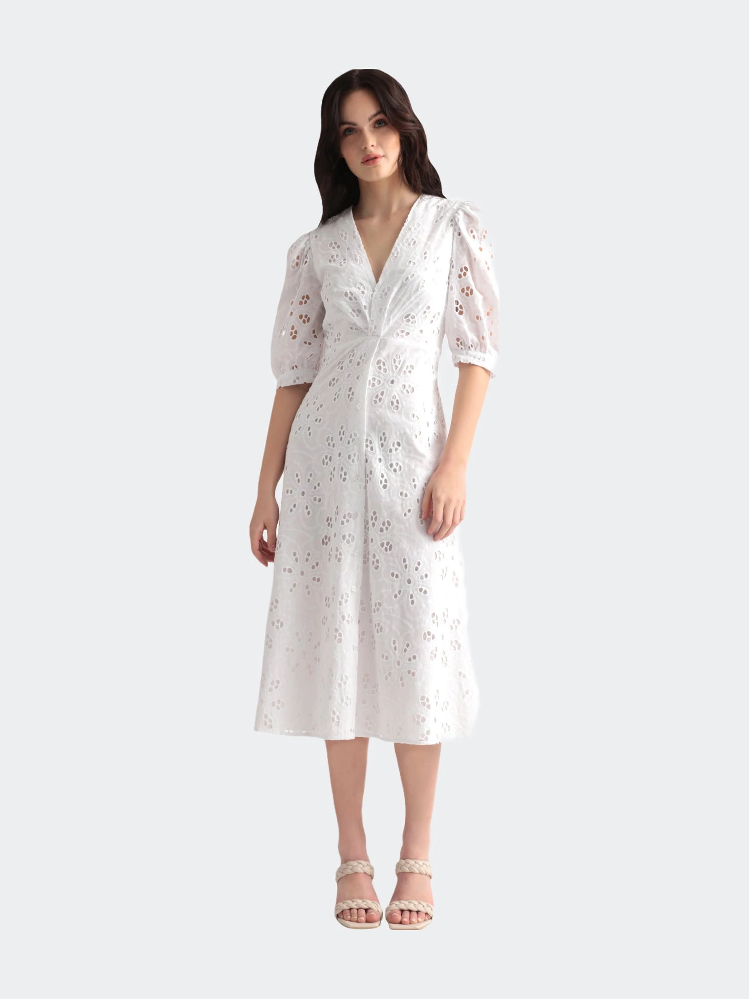 The Nia midi with its elbow-length puff sleeve and v-neck fit and flare silhouette in a fun daisy pattern eyelet in summer white is a classic look you’ll enjoy all season long.